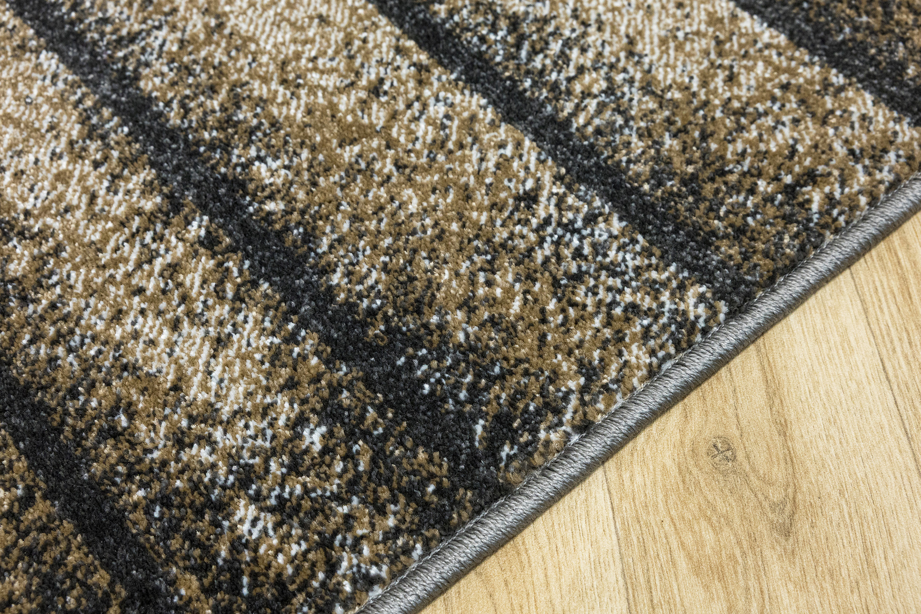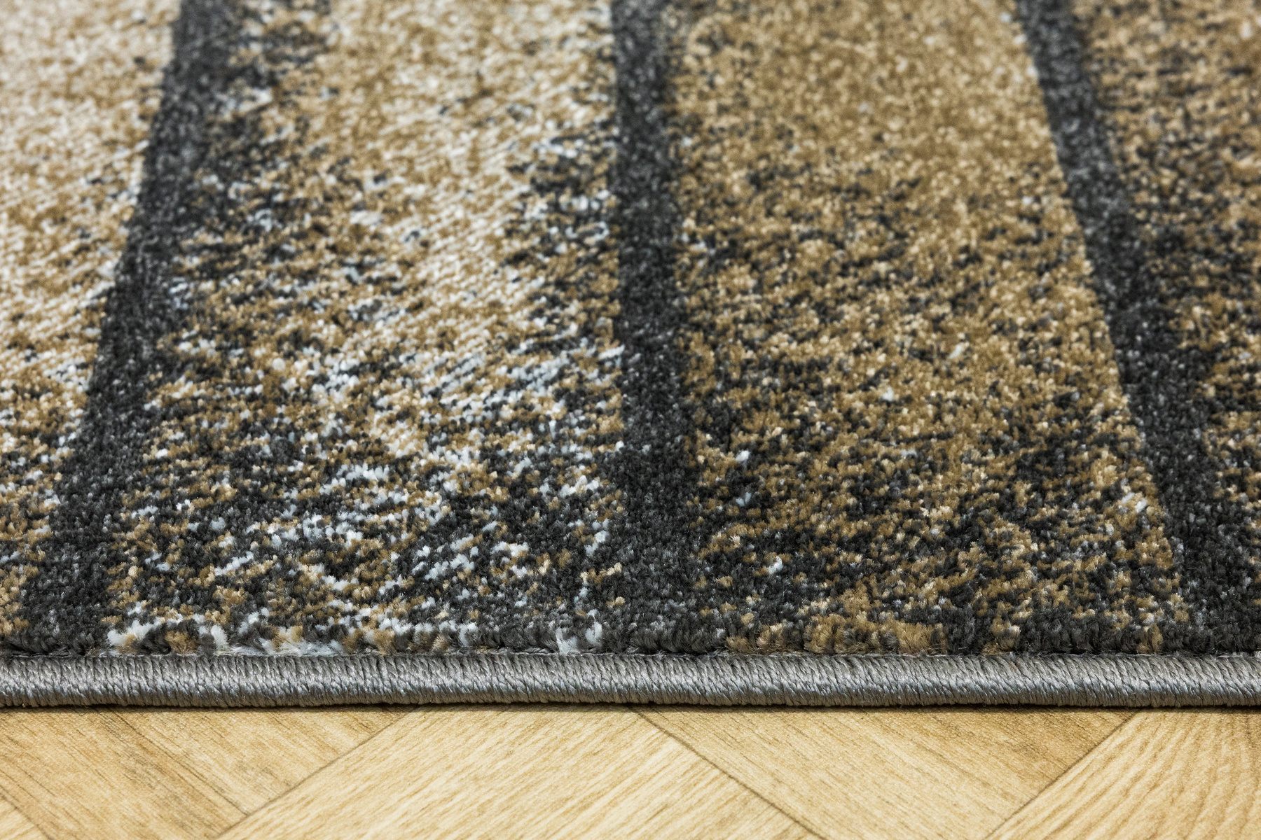 - Miękki i przyjemny w dotyku chodnik dywanowy Rainbow o lśniącym runie ozdobionym powtarzalnym wzorem imitującym deski w szarościach, kremie, beżu ze spodem wykończonym jutą.