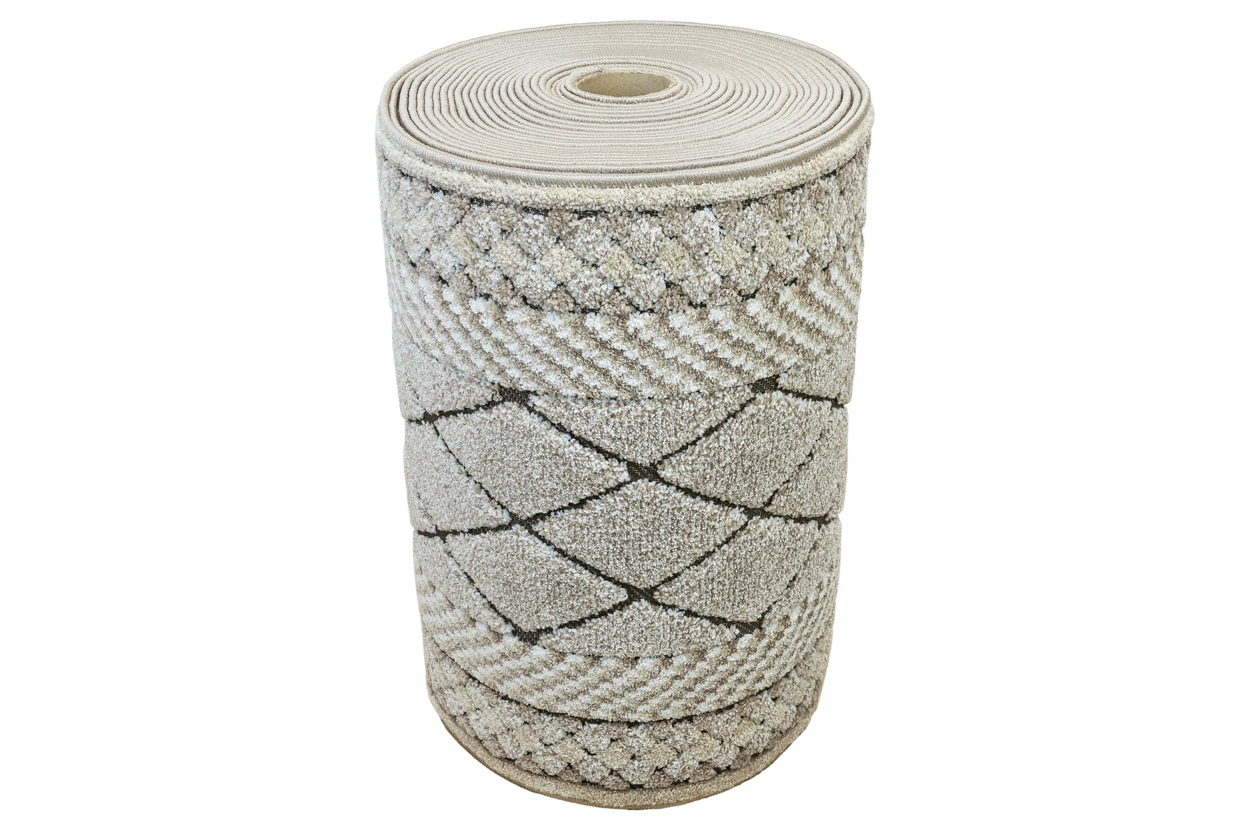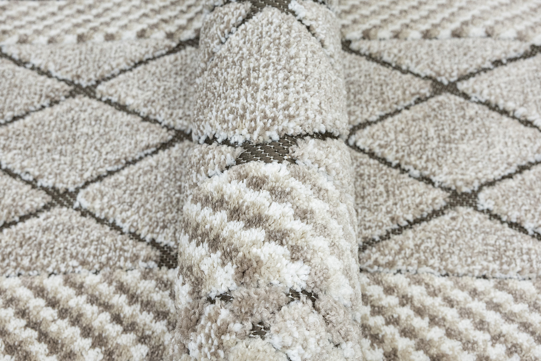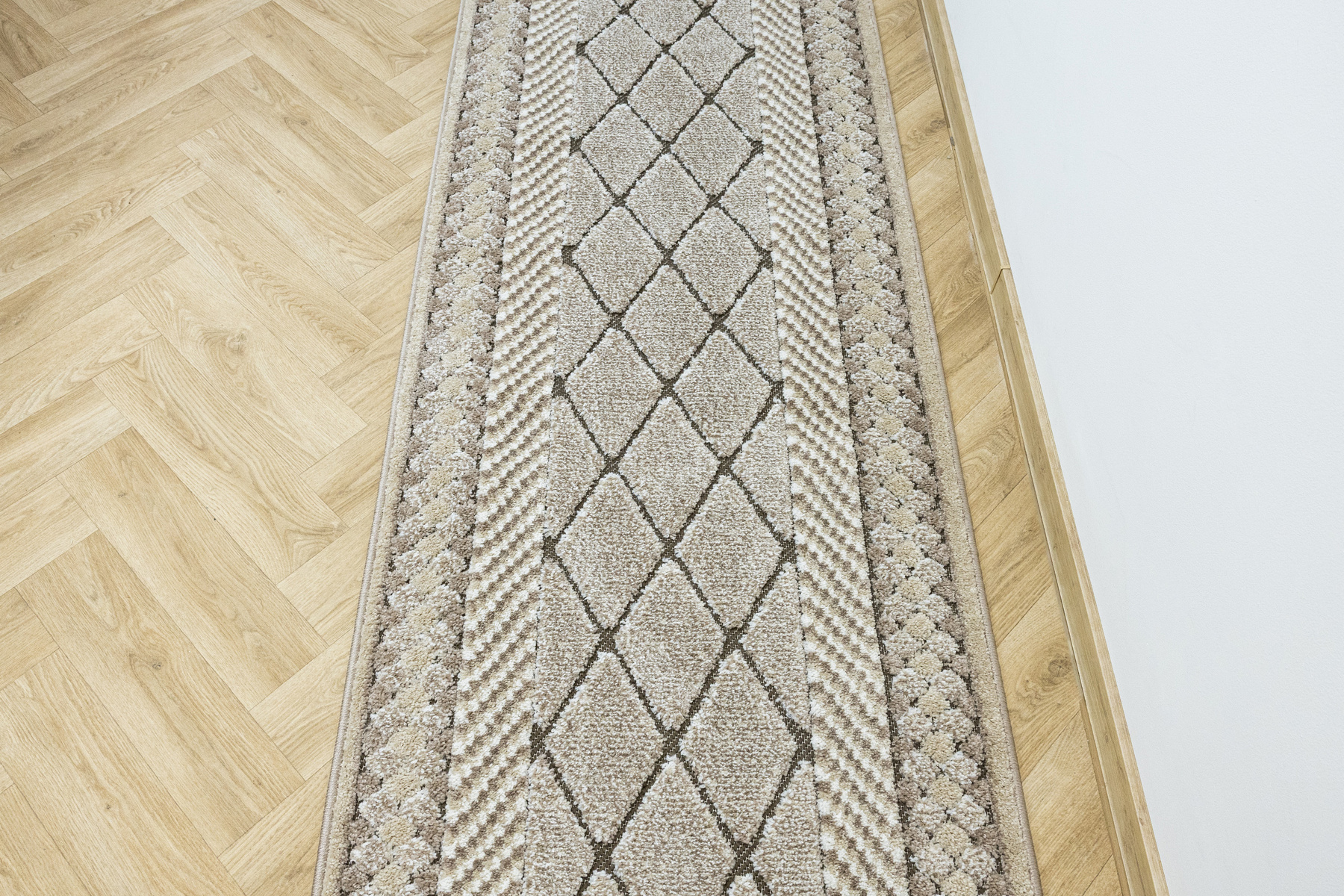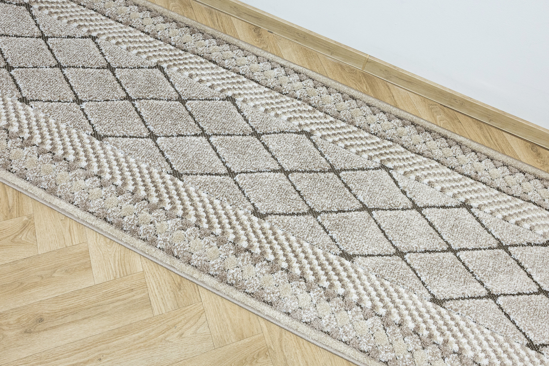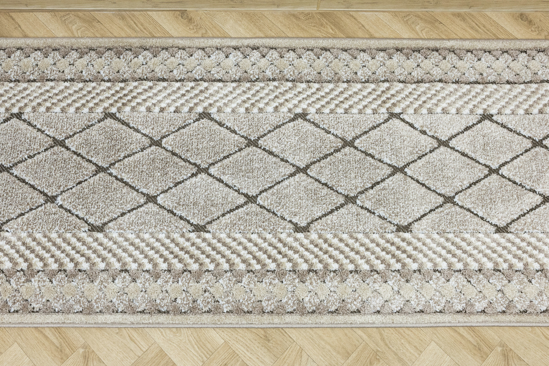 - Miękki i przyjemny w dotyku chodnik dywanowy w romby z runem o dwóch poziomach będących połączeniem splotu sznurkowego w brązie i dywanowego w kremie i beżu.