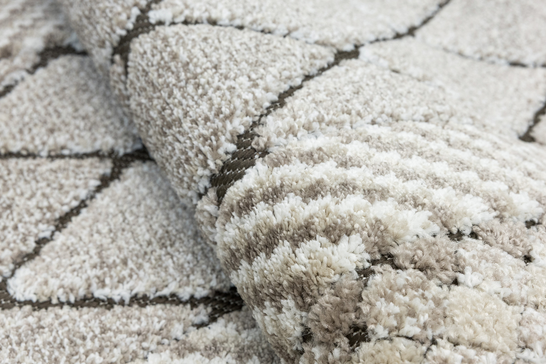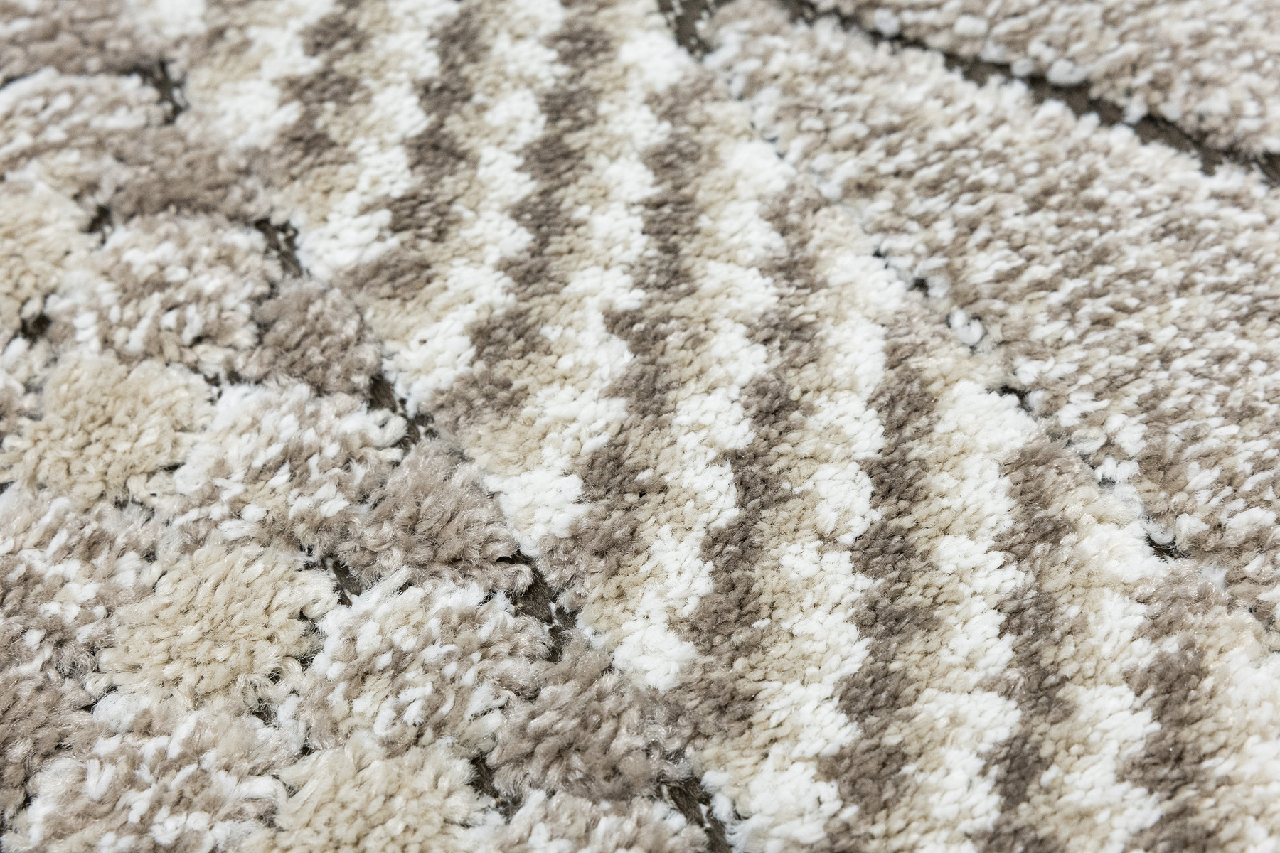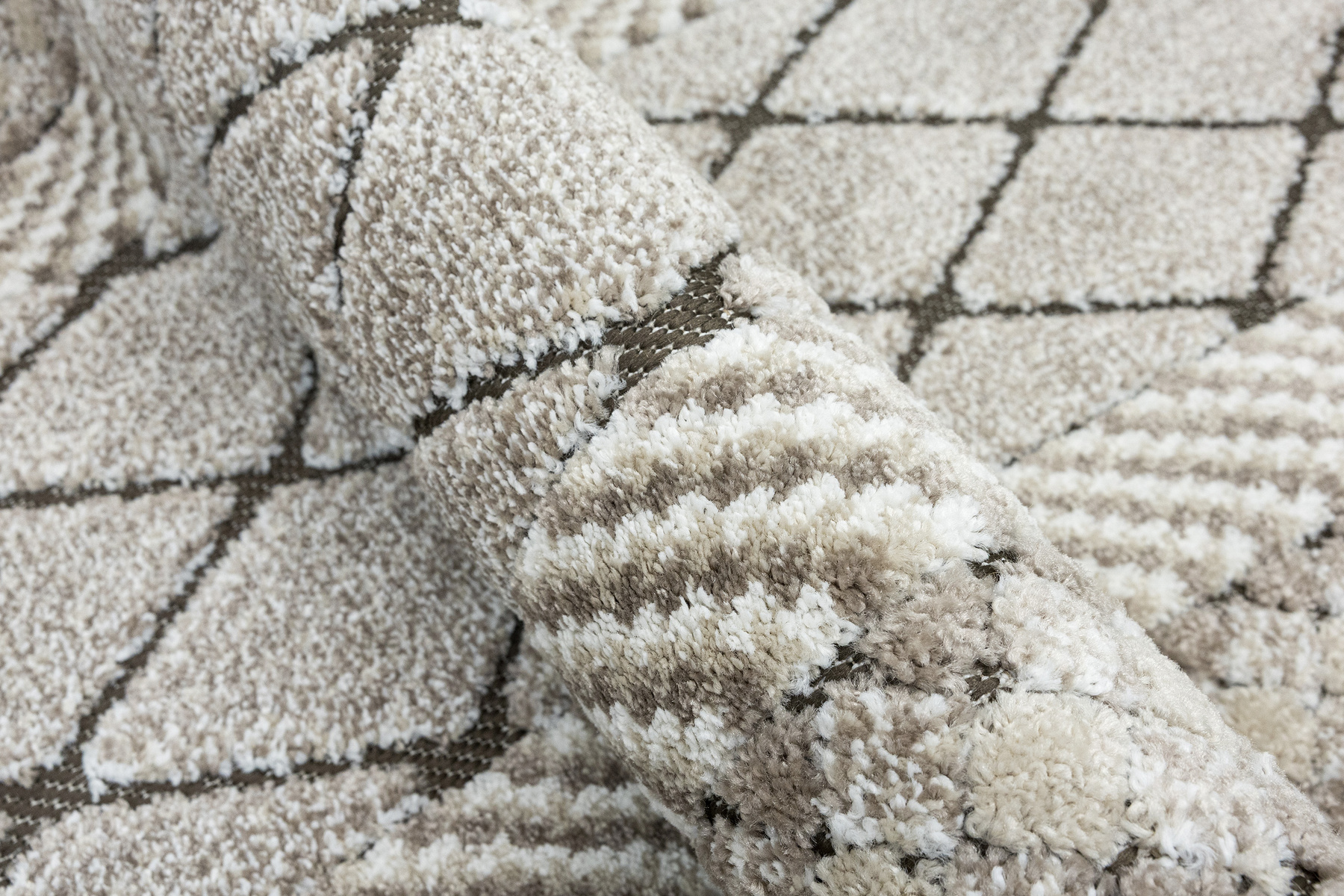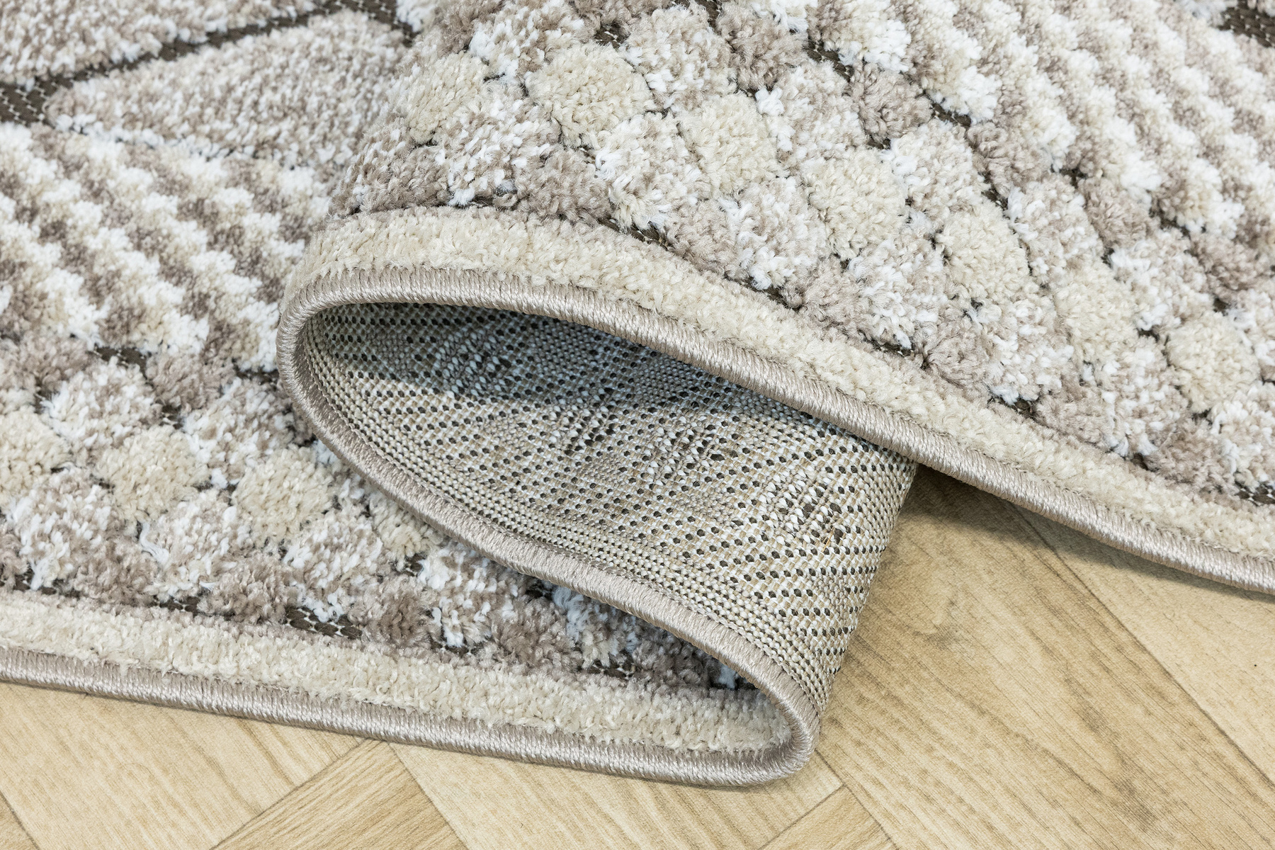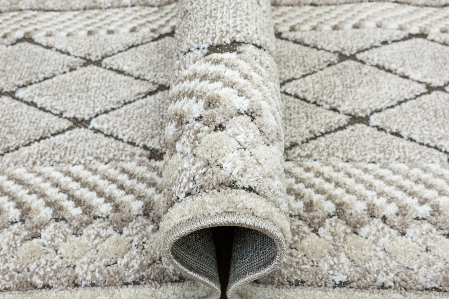 - Miękki i przyjemny w dotyku chodnik dywanowy w romby z runem o dwóch poziomach będących połączeniem splotu sznurkowego w brązie i dywanowego w kremie i beżu.