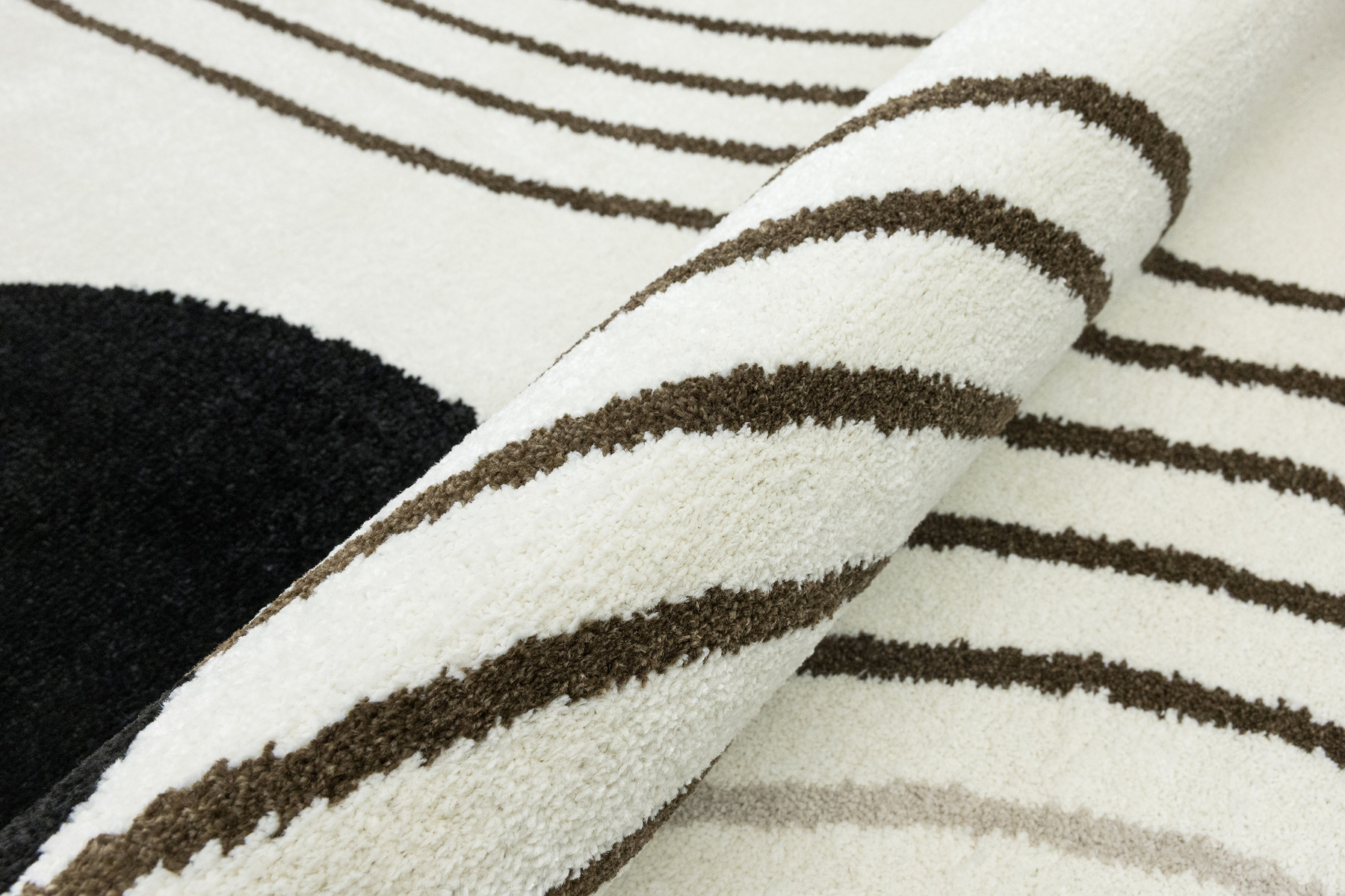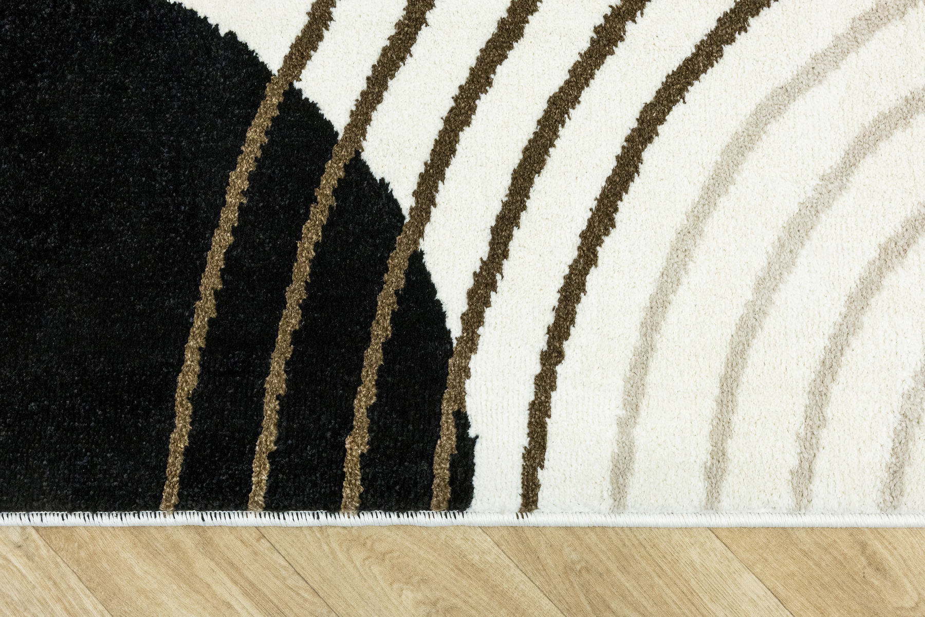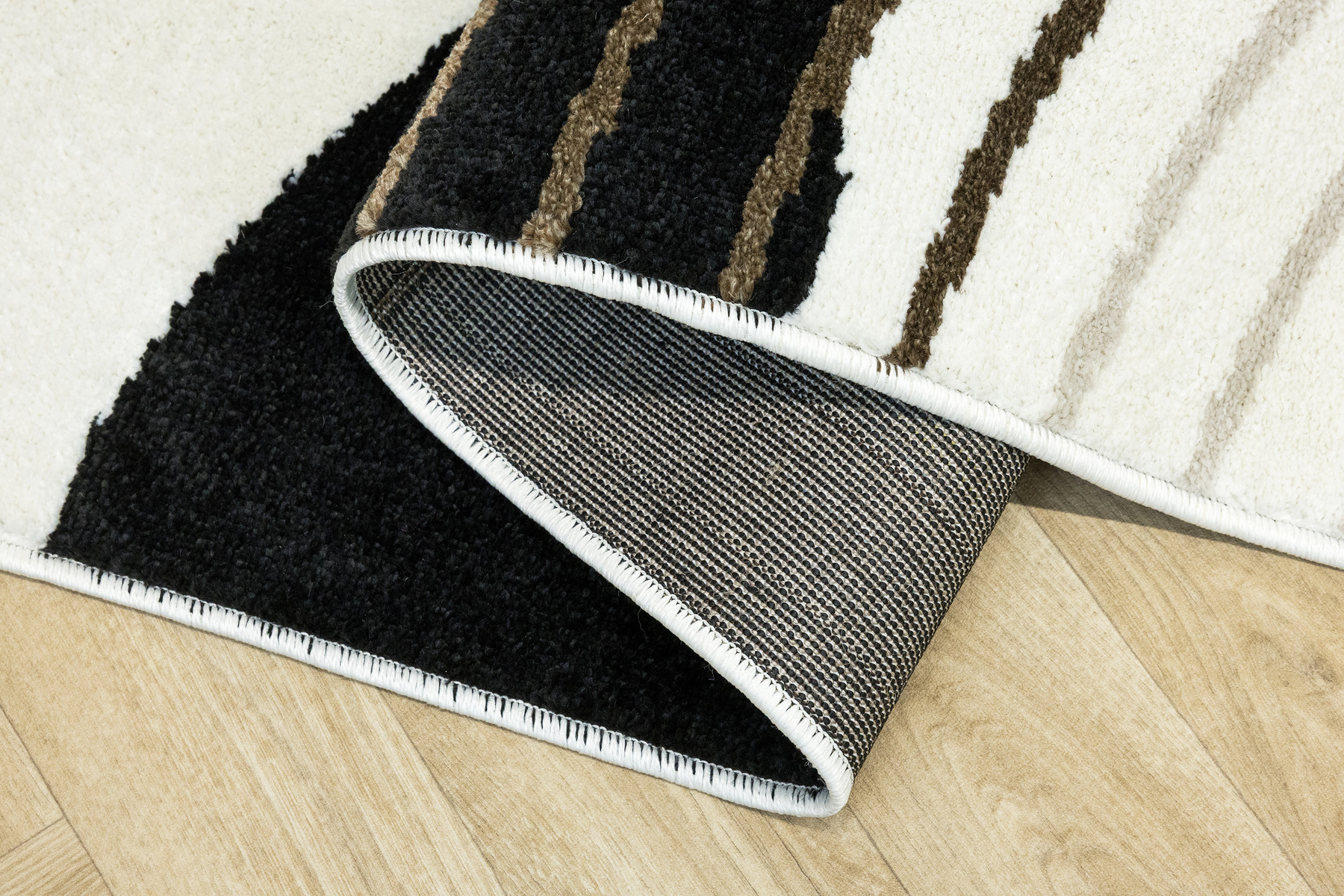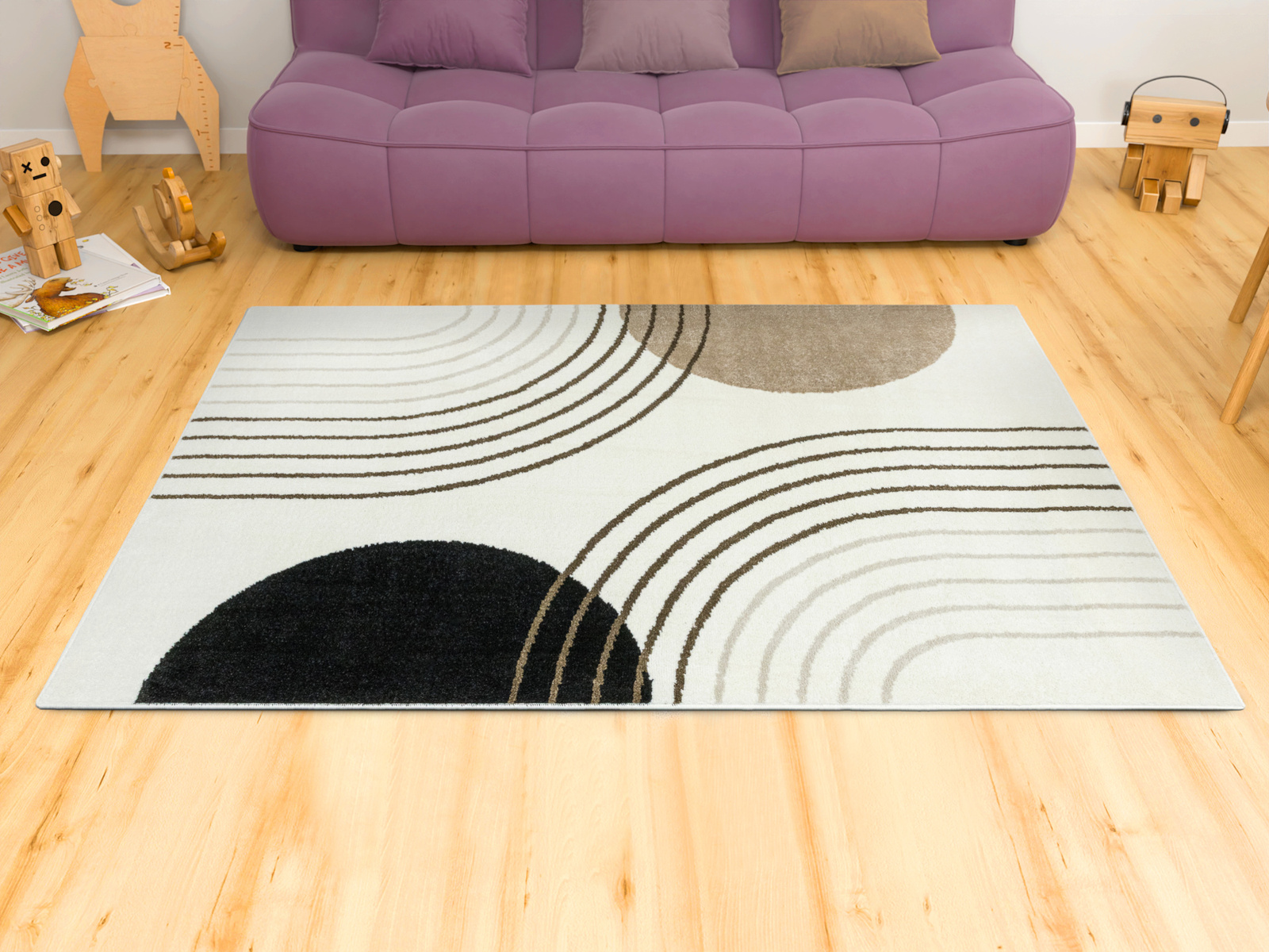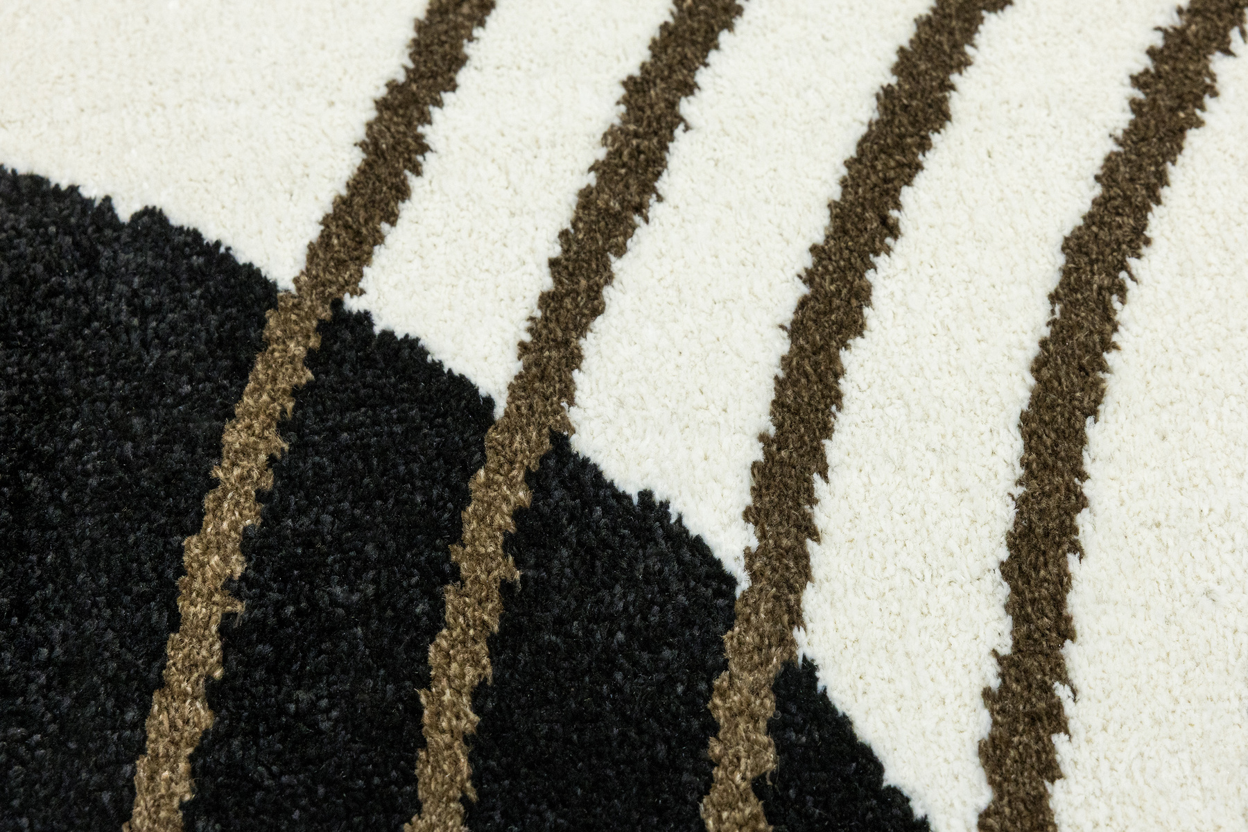 • Nowoczesny dywan Clara o mięciutkim runie z geometrycznym, abstrakcyjnym wzorem w odcieniach brązu, kaszmirowego beżu i kremu z akcentami w czerni, ze spodem wykończonym jutą