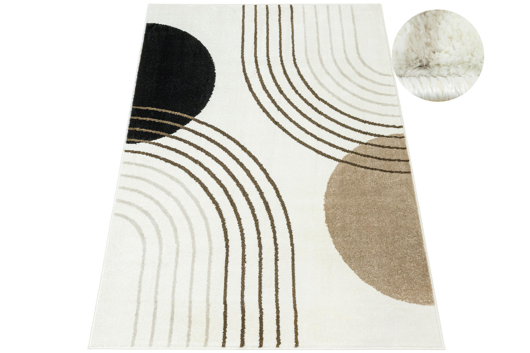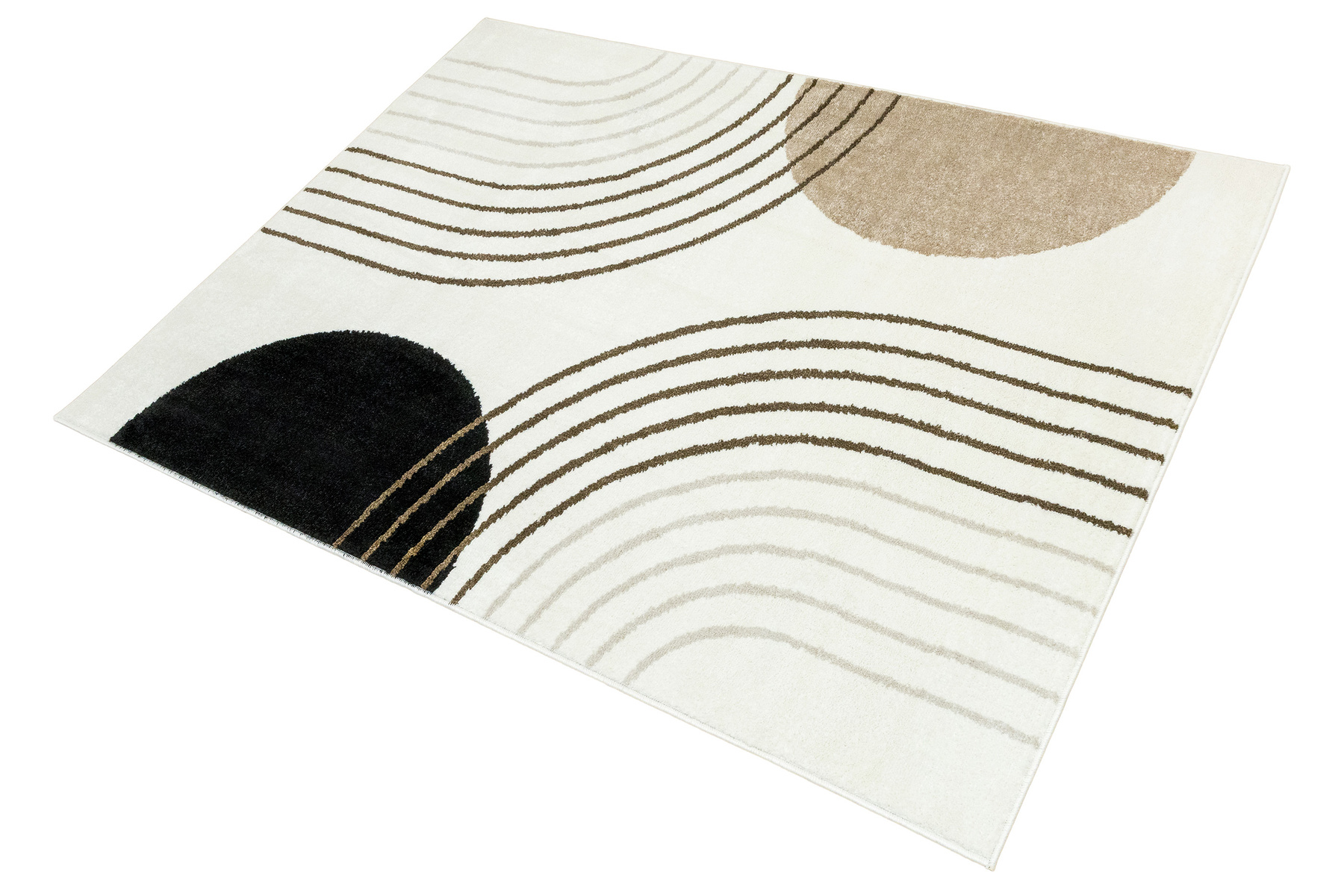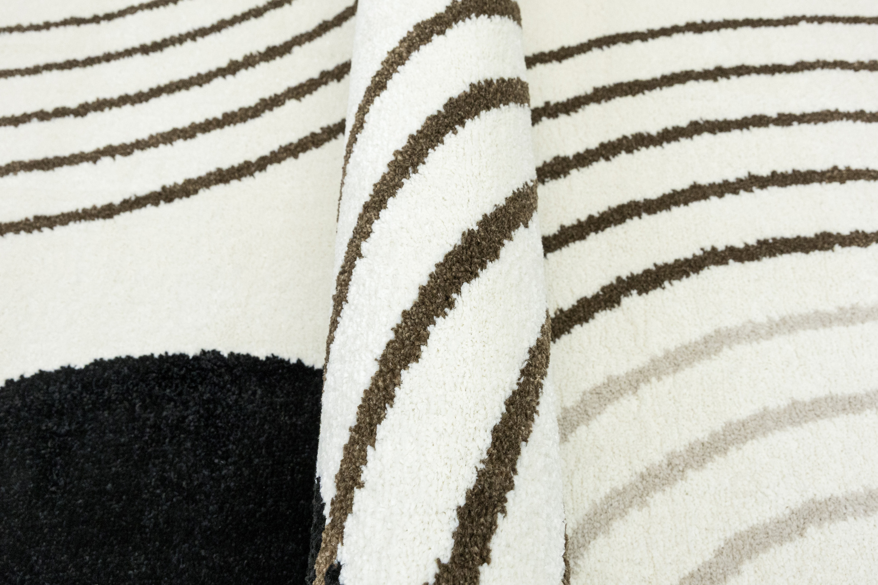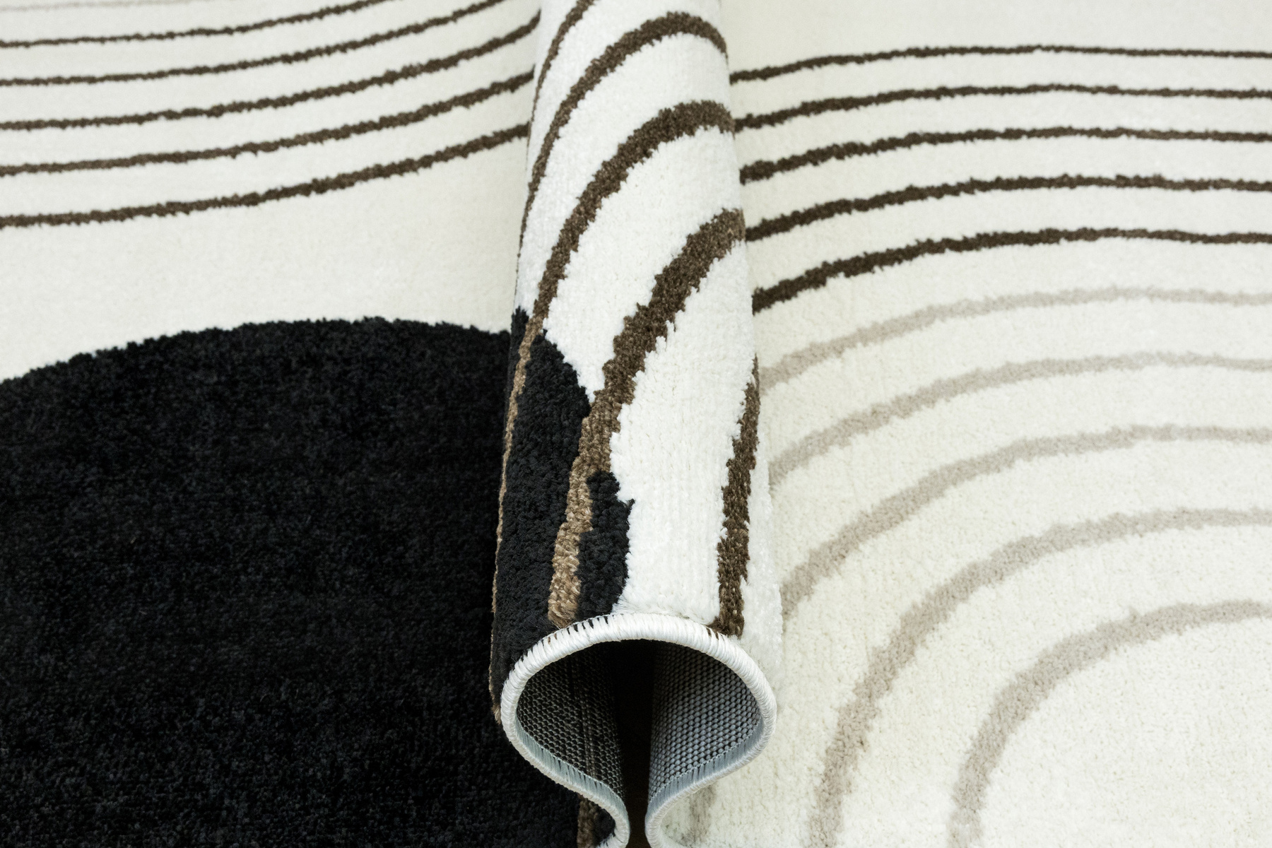 • Nowoczesny dywan Clara o mięciutkim runie z geometrycznym, abstrakcyjnym wzorem w odcieniach brązu, kaszmirowego beżu i kremu z akcentami w czerni, ze spodem wykończonym jutą