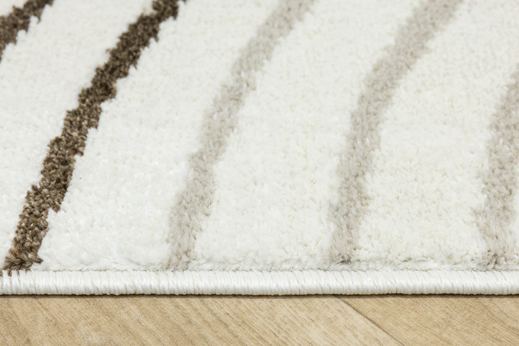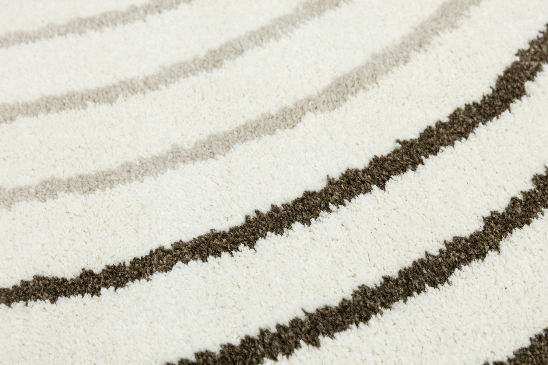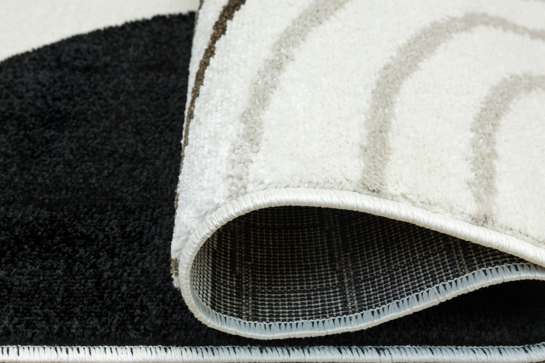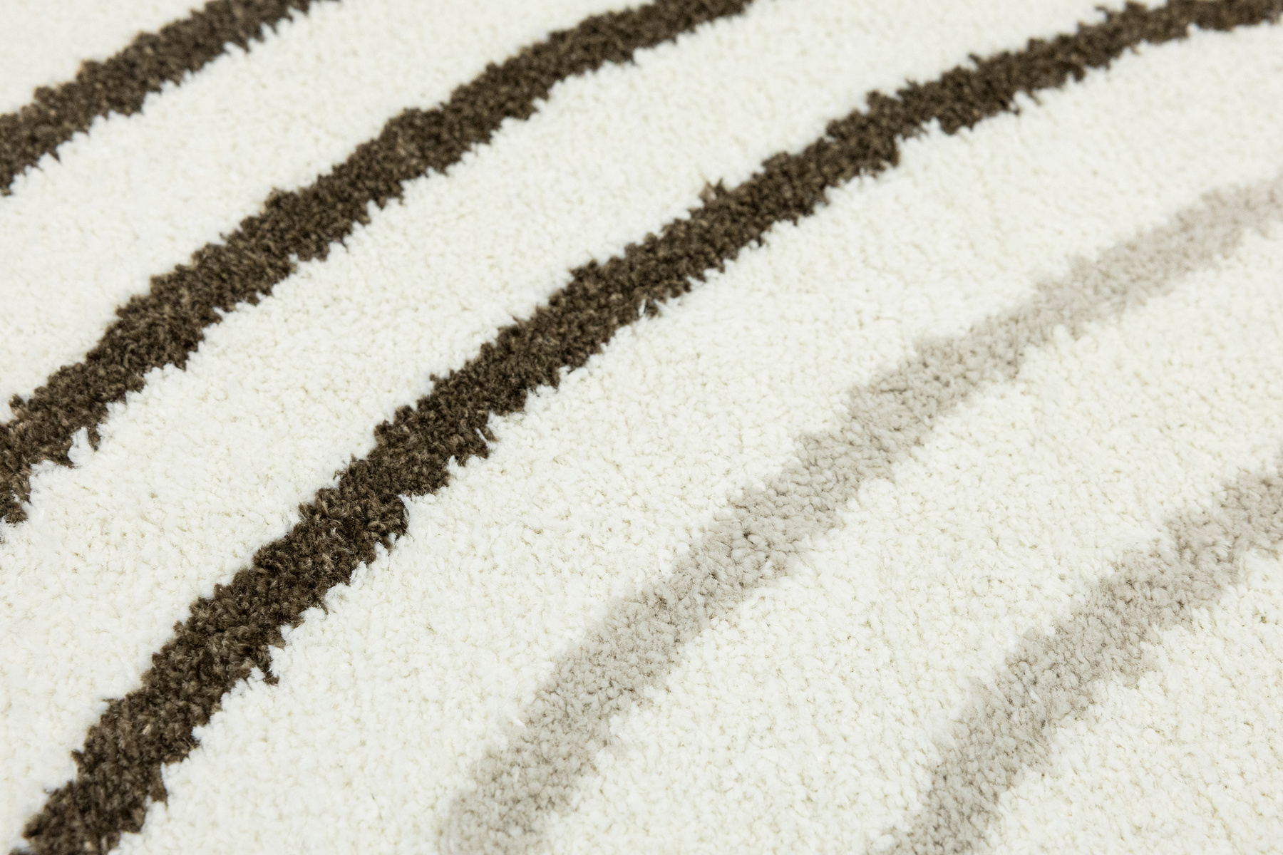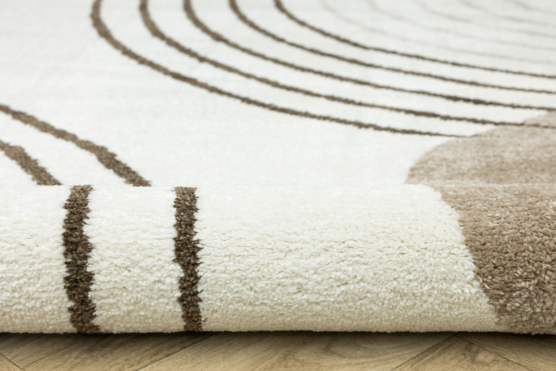 • Nowoczesny dywan Clara o mięciutkim runie z geometrycznym, abstrakcyjnym wzorem w odcieniach brązu, kaszmirowego beżu i kremu z akcentami w czerni, ze spodem wykończonym jutą