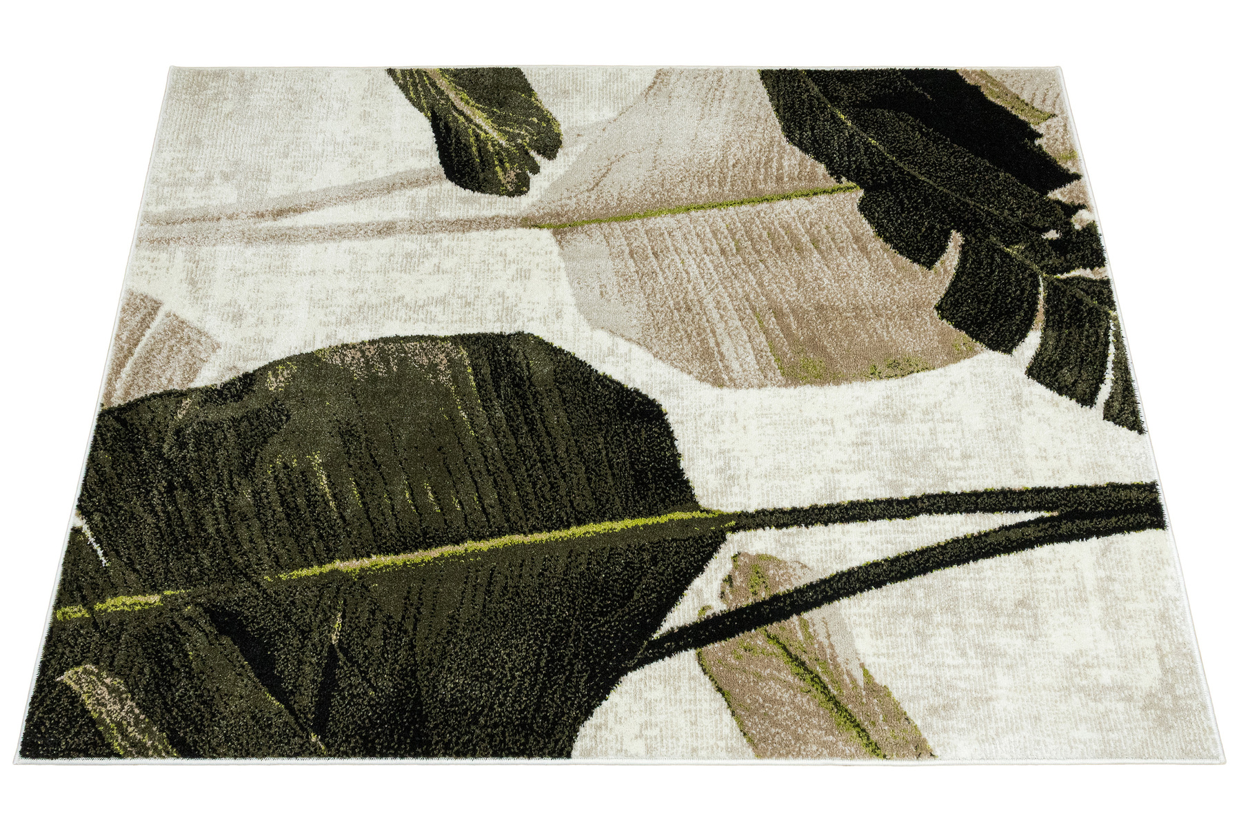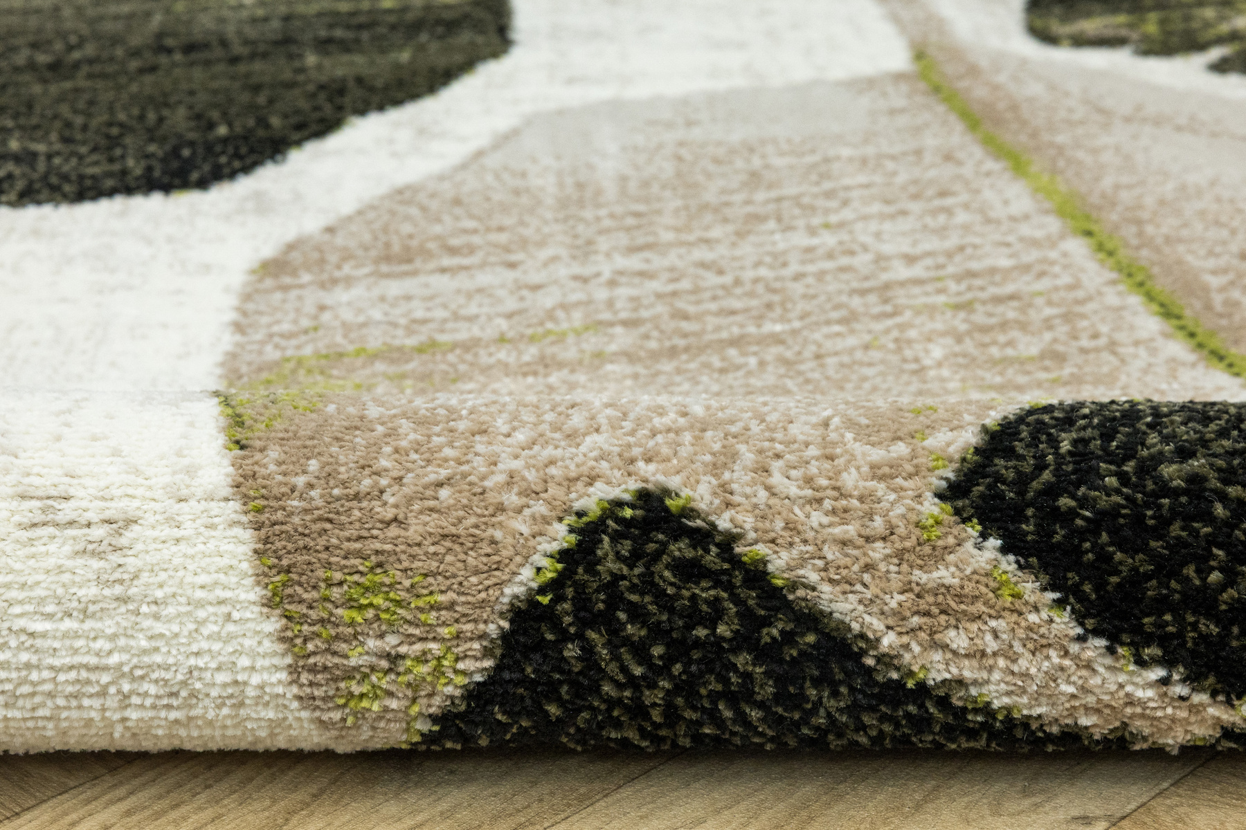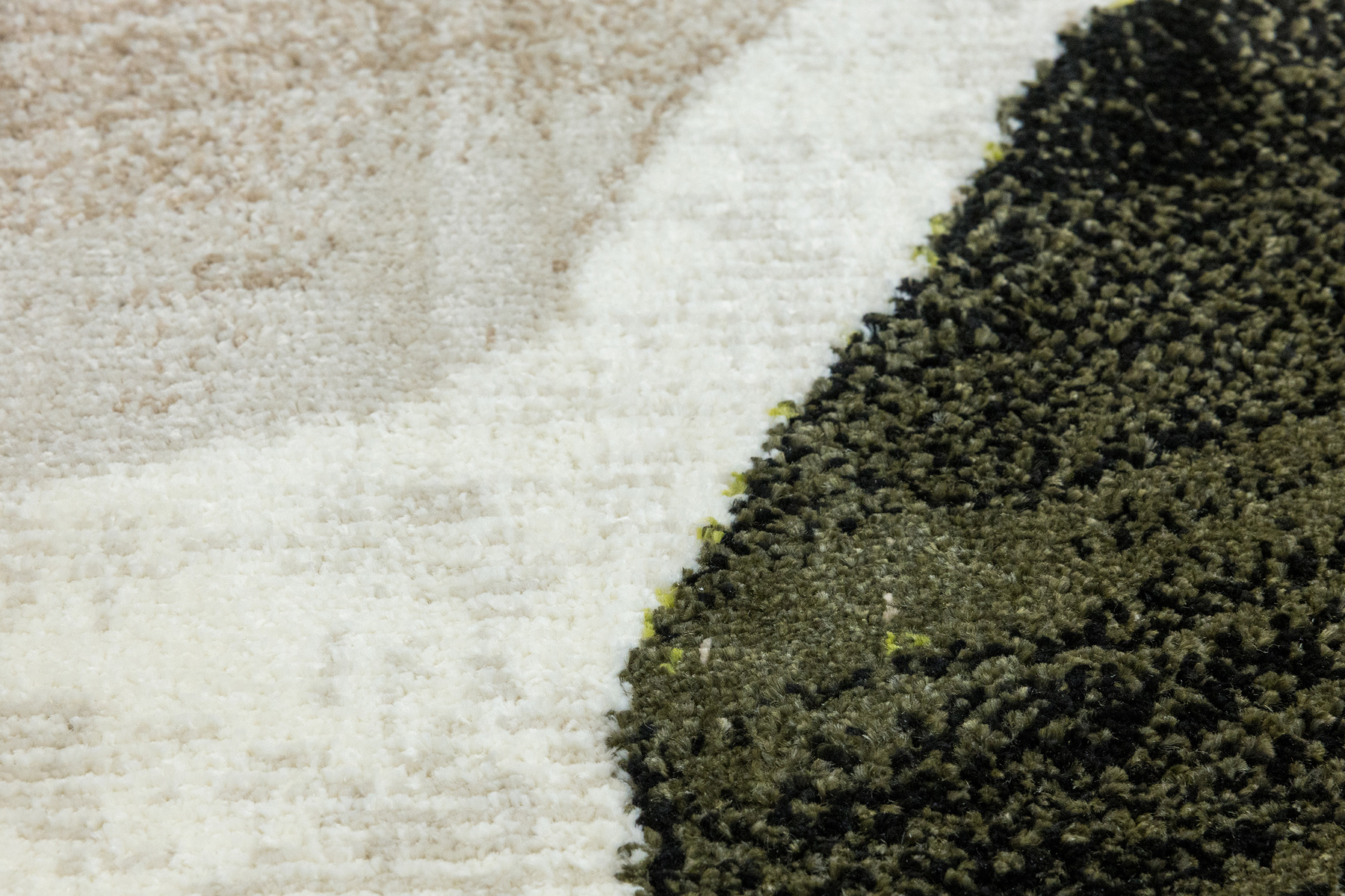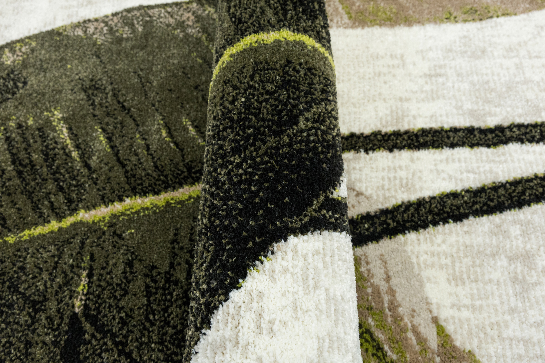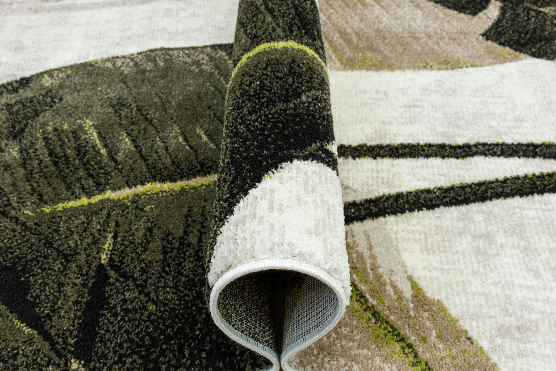 • Nowoczesny dywan Clara o mięciutkim runie ze wzorem inspirowanym naturą w odcieniach, kaszmirowego beżu, zieleni i kremu z akcentami w czerni, ze spodem wykończonym jutą.