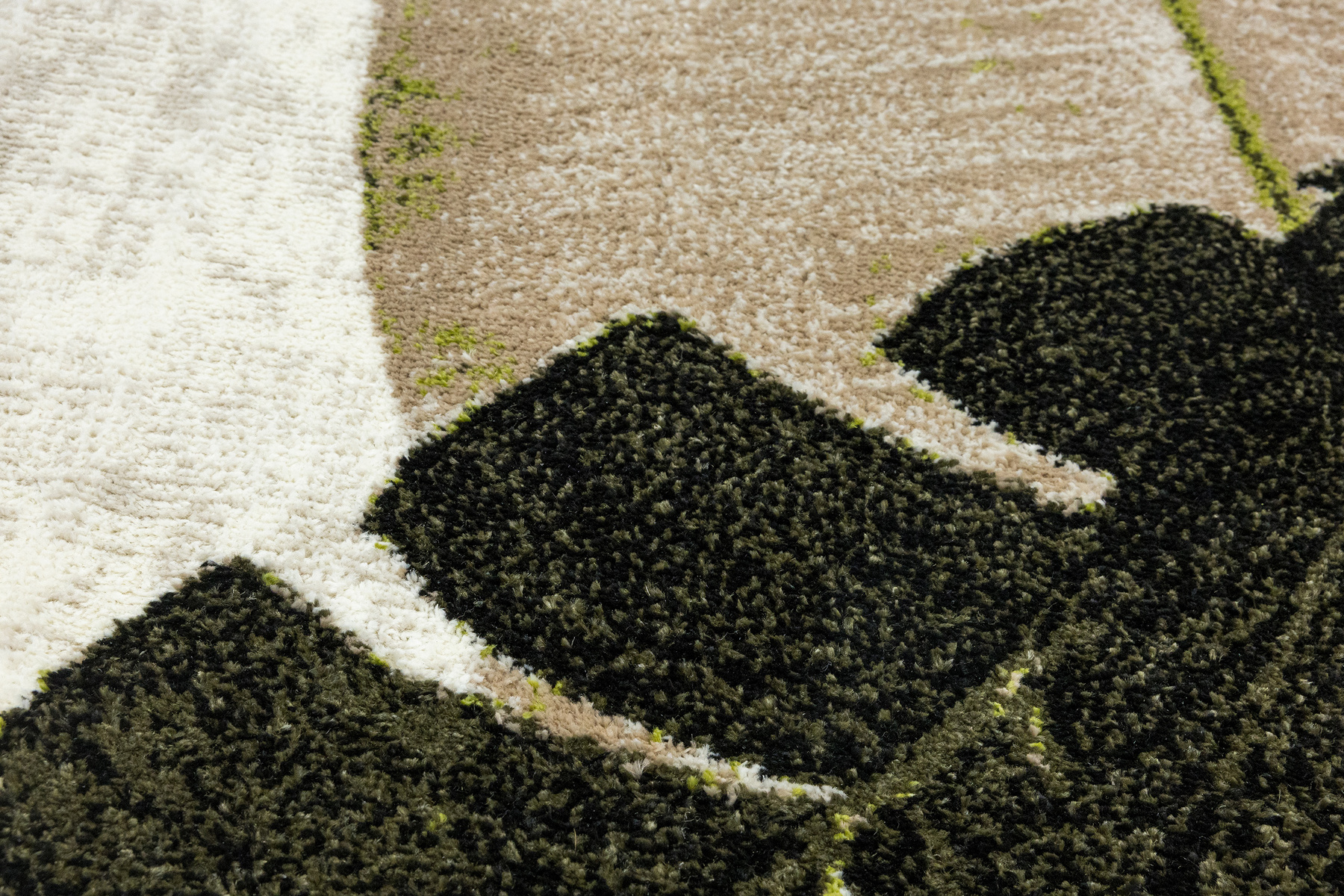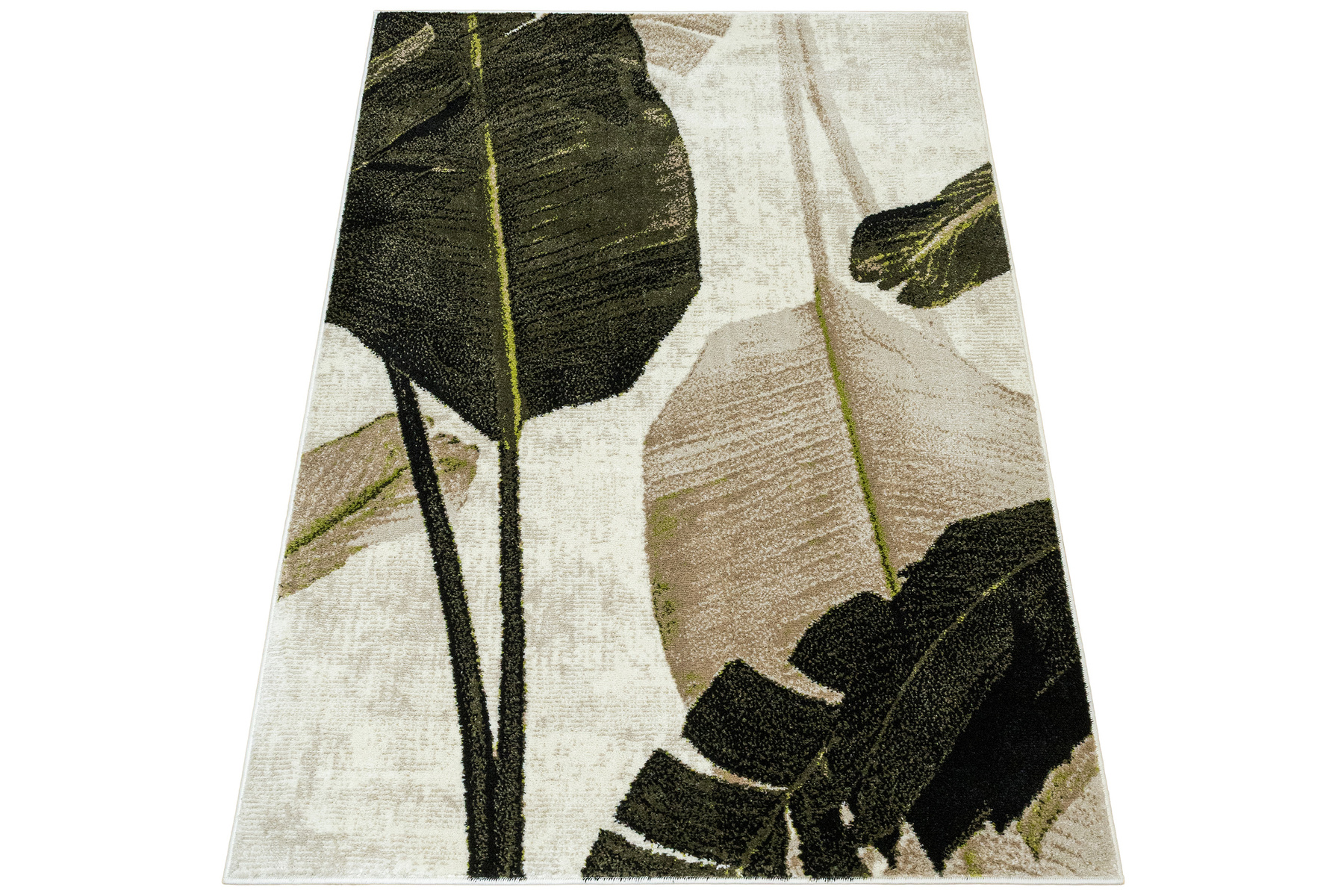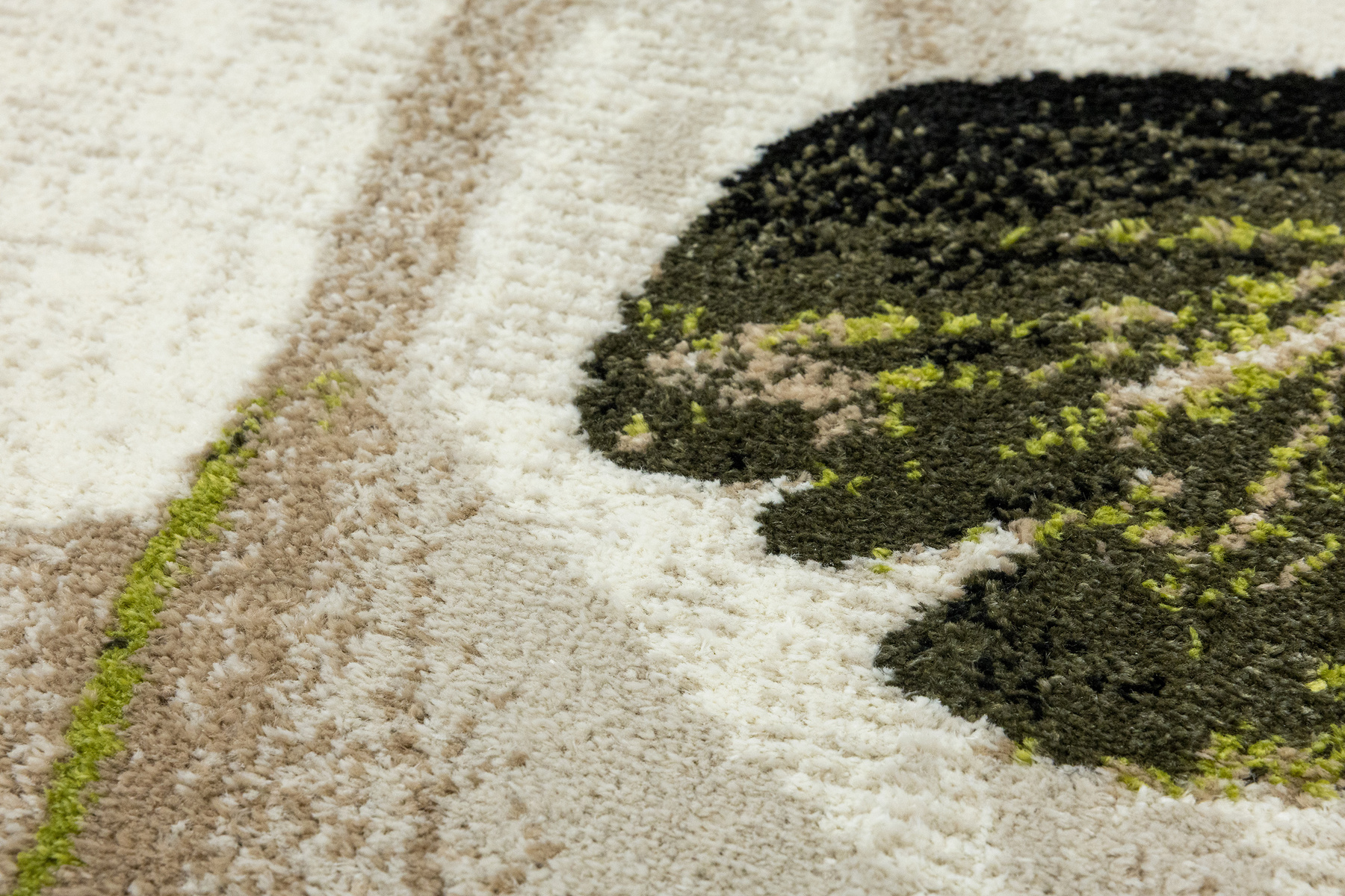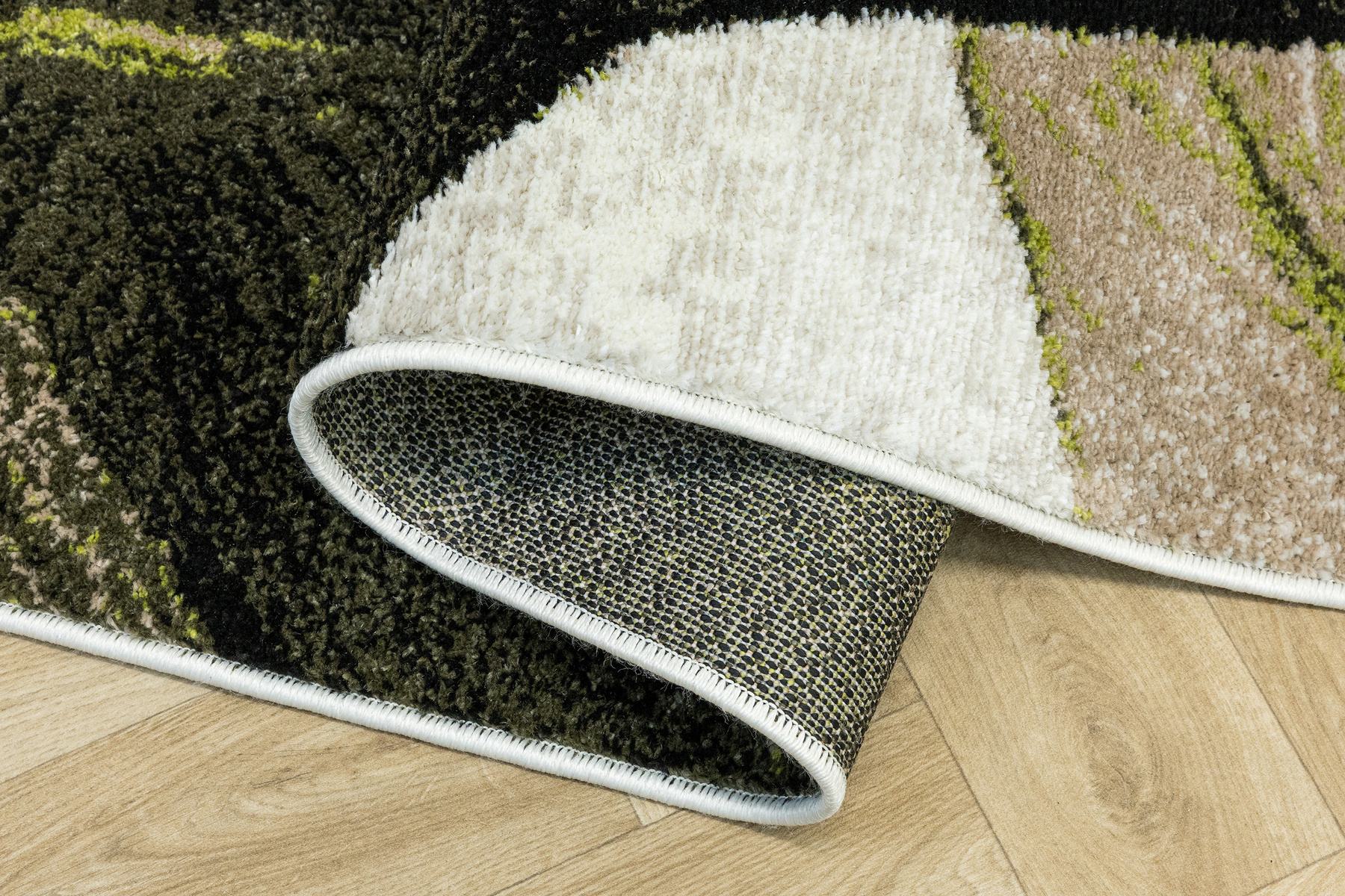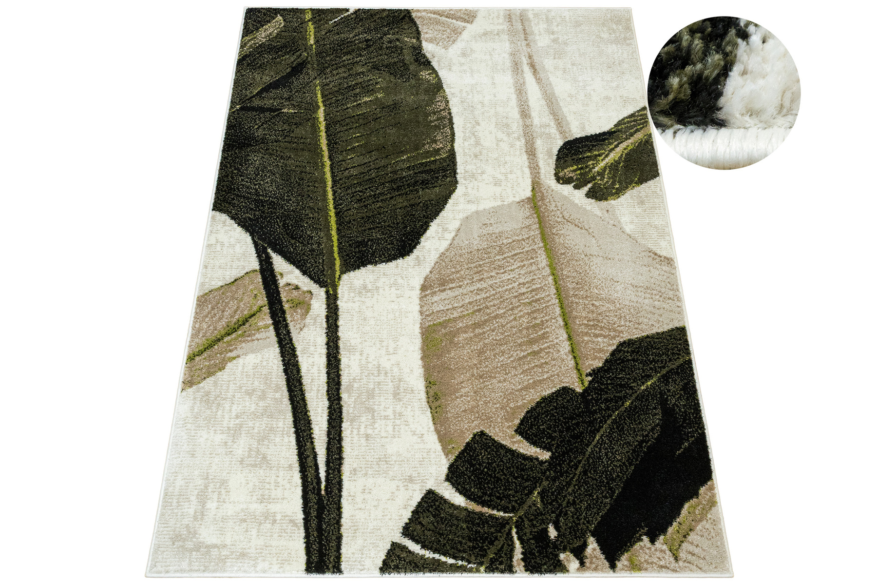 • Nowoczesny dywan Clara o mięciutkim runie ze wzorem inspirowanym naturą w odcieniach, kaszmirowego beżu, zieleni i kremu z akcentami w czerni, ze spodem wykończonym jutą.