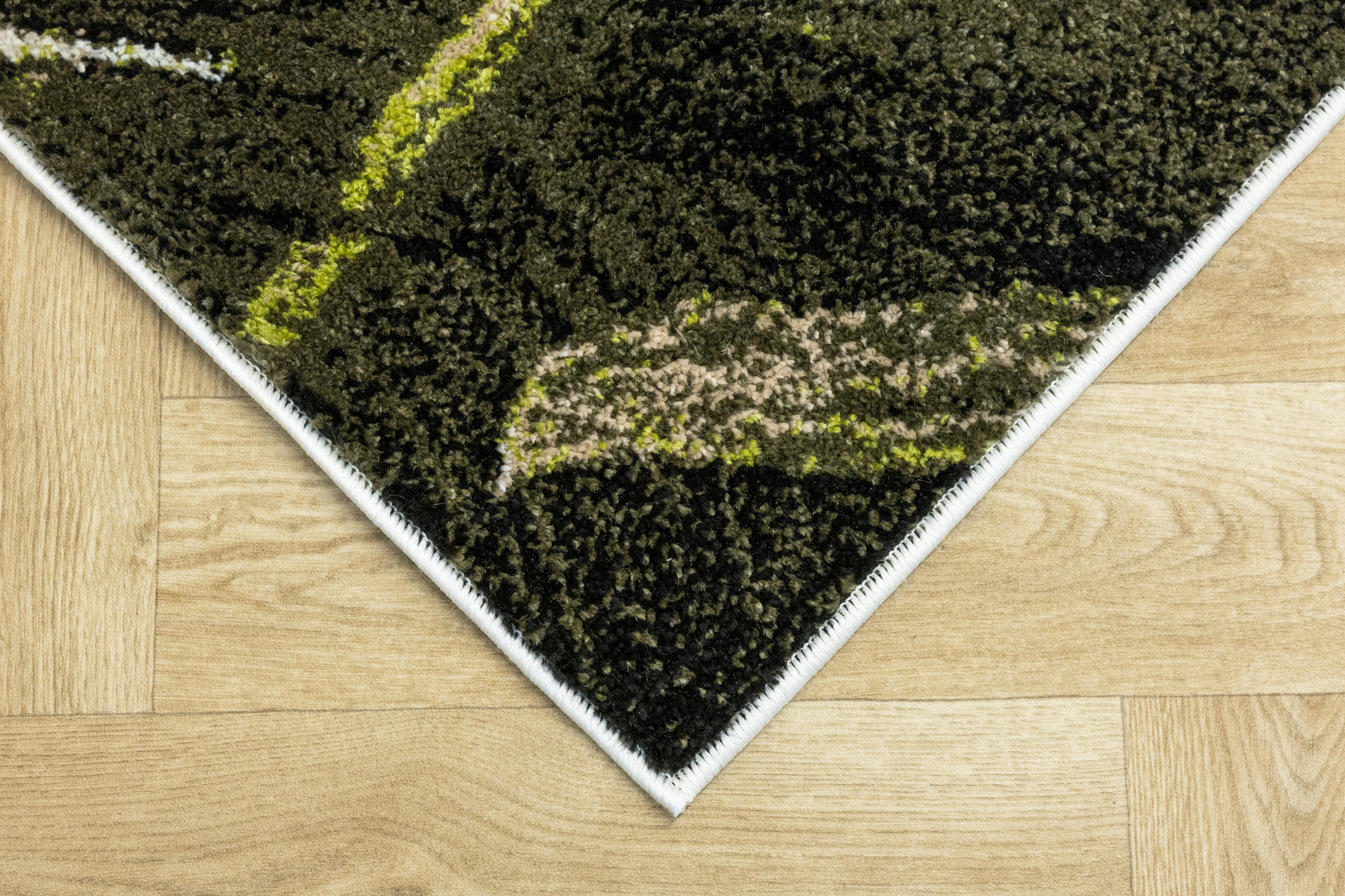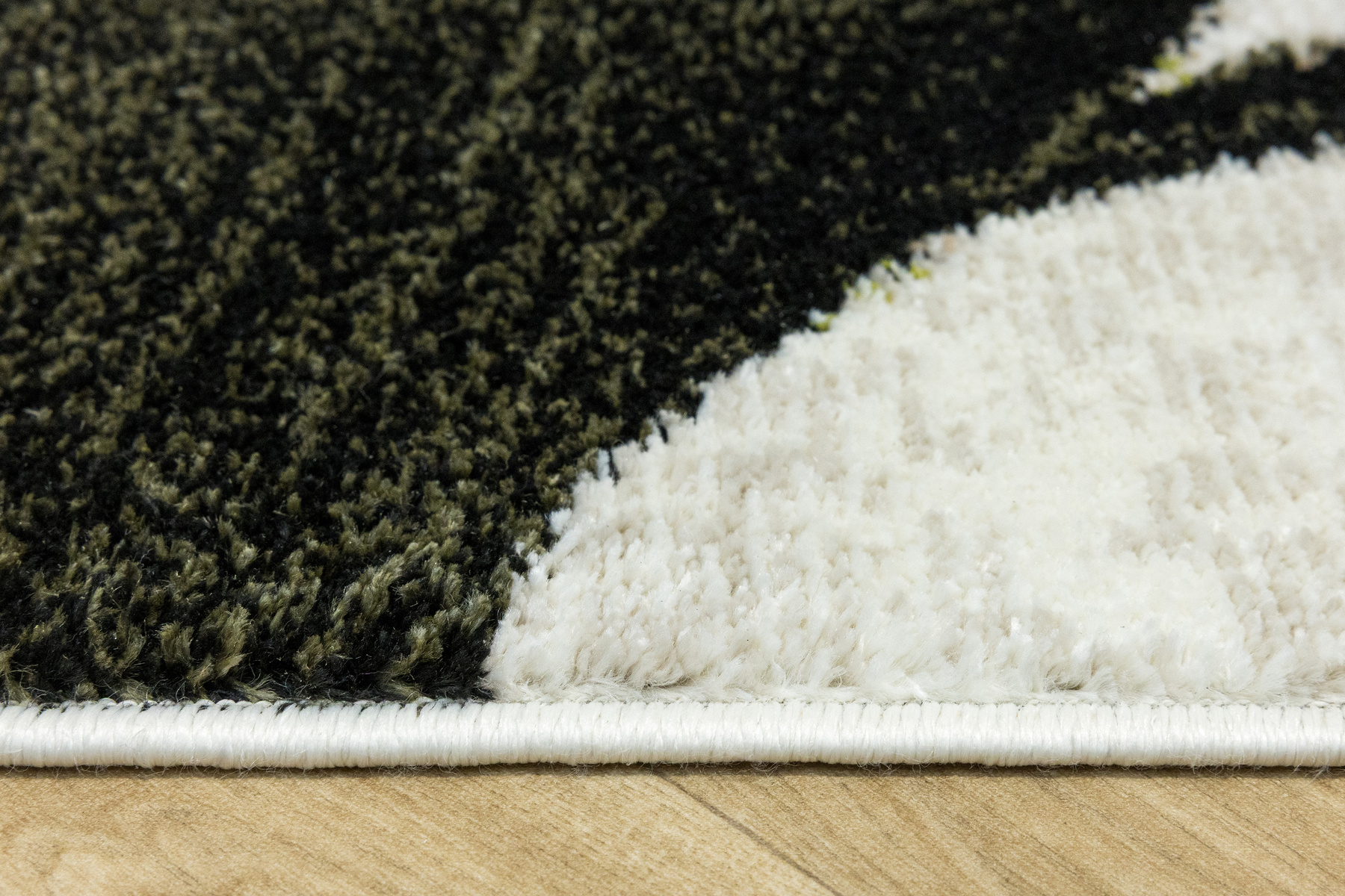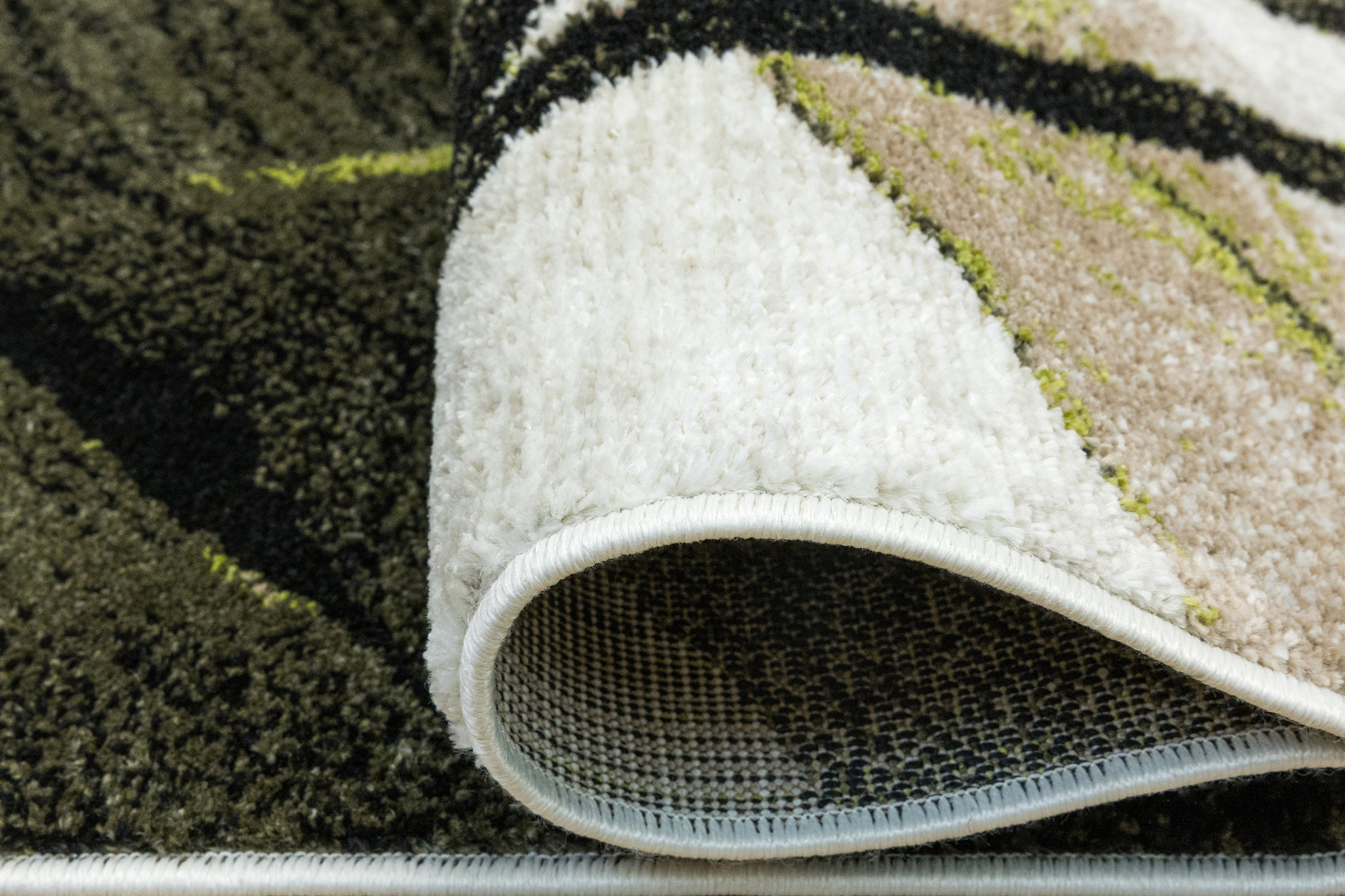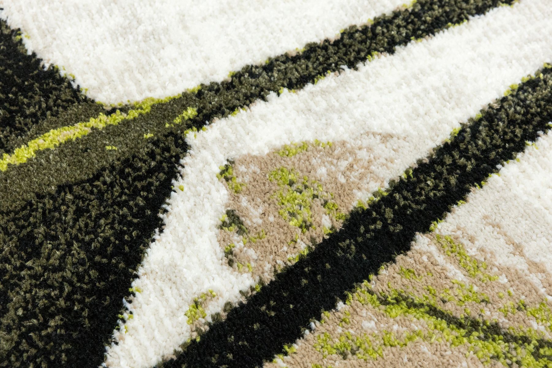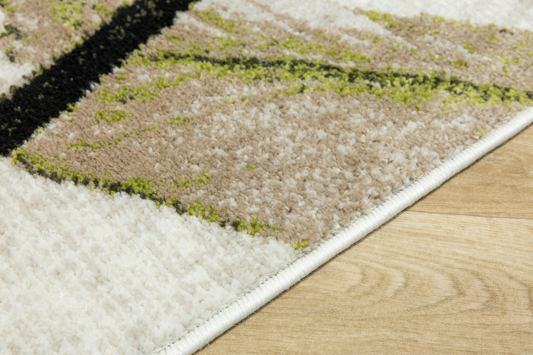 • Nowoczesny dywan Clara o mięciutkim runie ze wzorem inspirowanym naturą w odcieniach, kaszmirowego beżu, zieleni i kremu z akcentami w czerni, ze spodem wykończonym jutą.