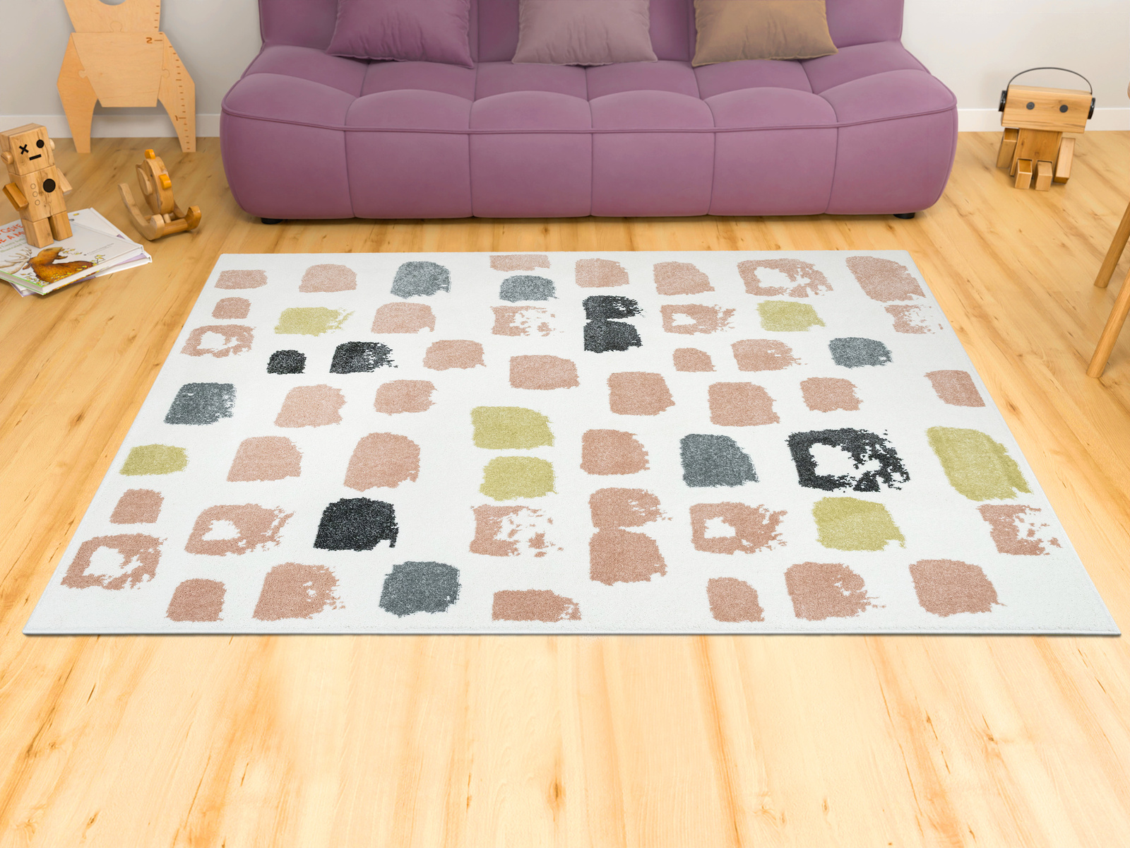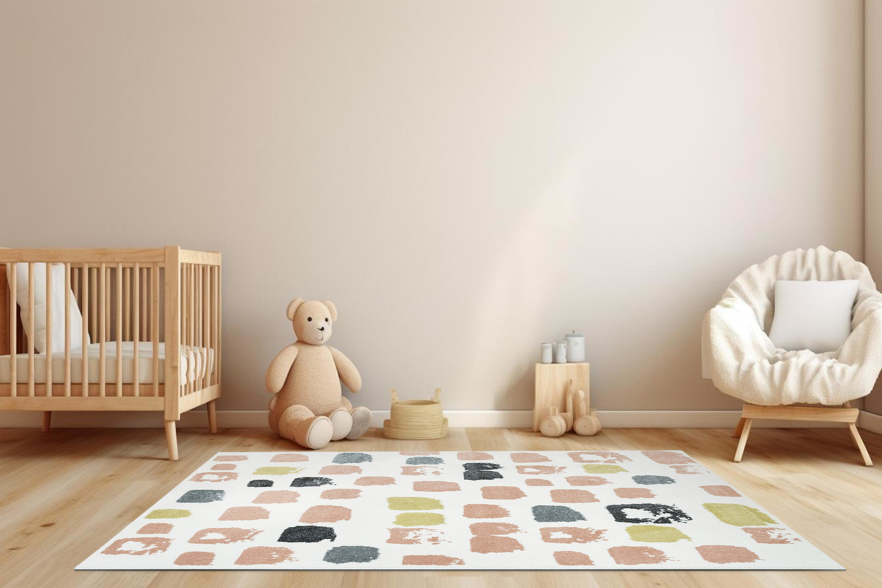 - Dywan dziecięcy Lima z mięciutkim runem o wzorze w nieregularne plamki w odcieniach kremu, różu, grafitu, szarości i żółtego.