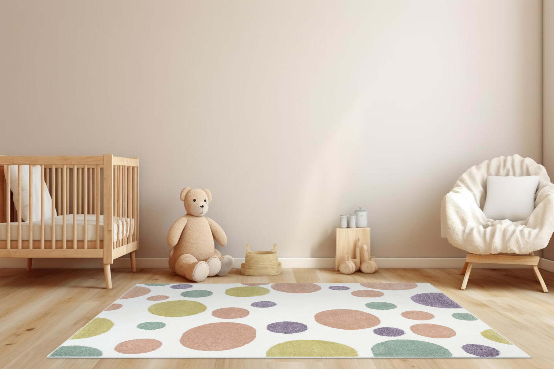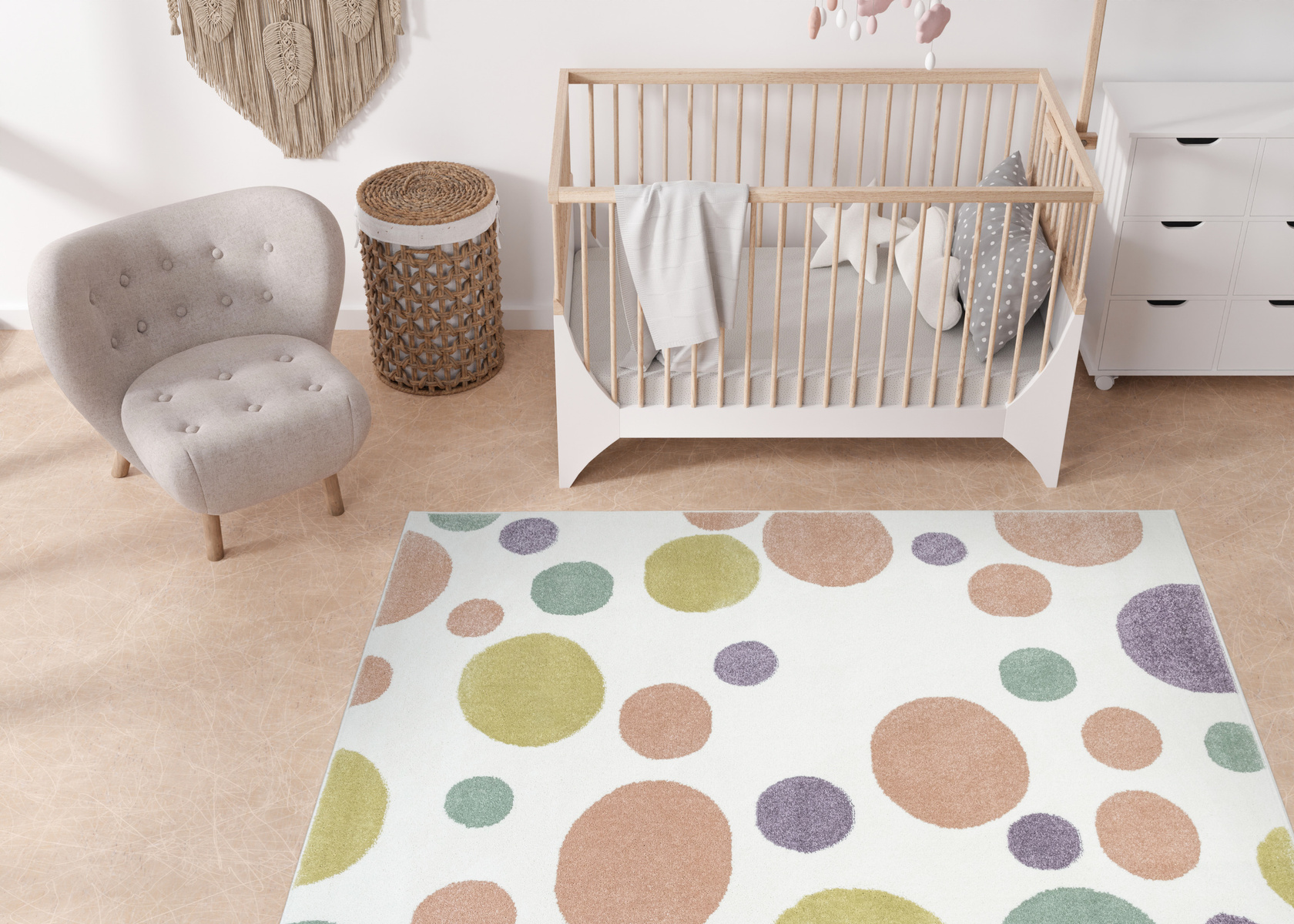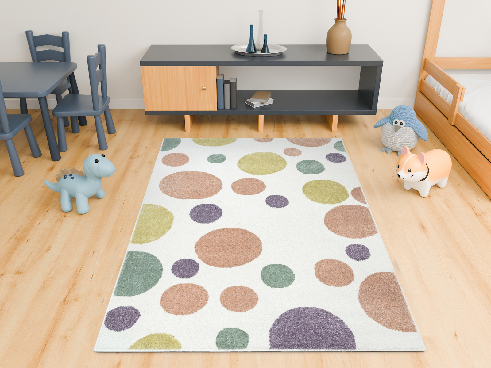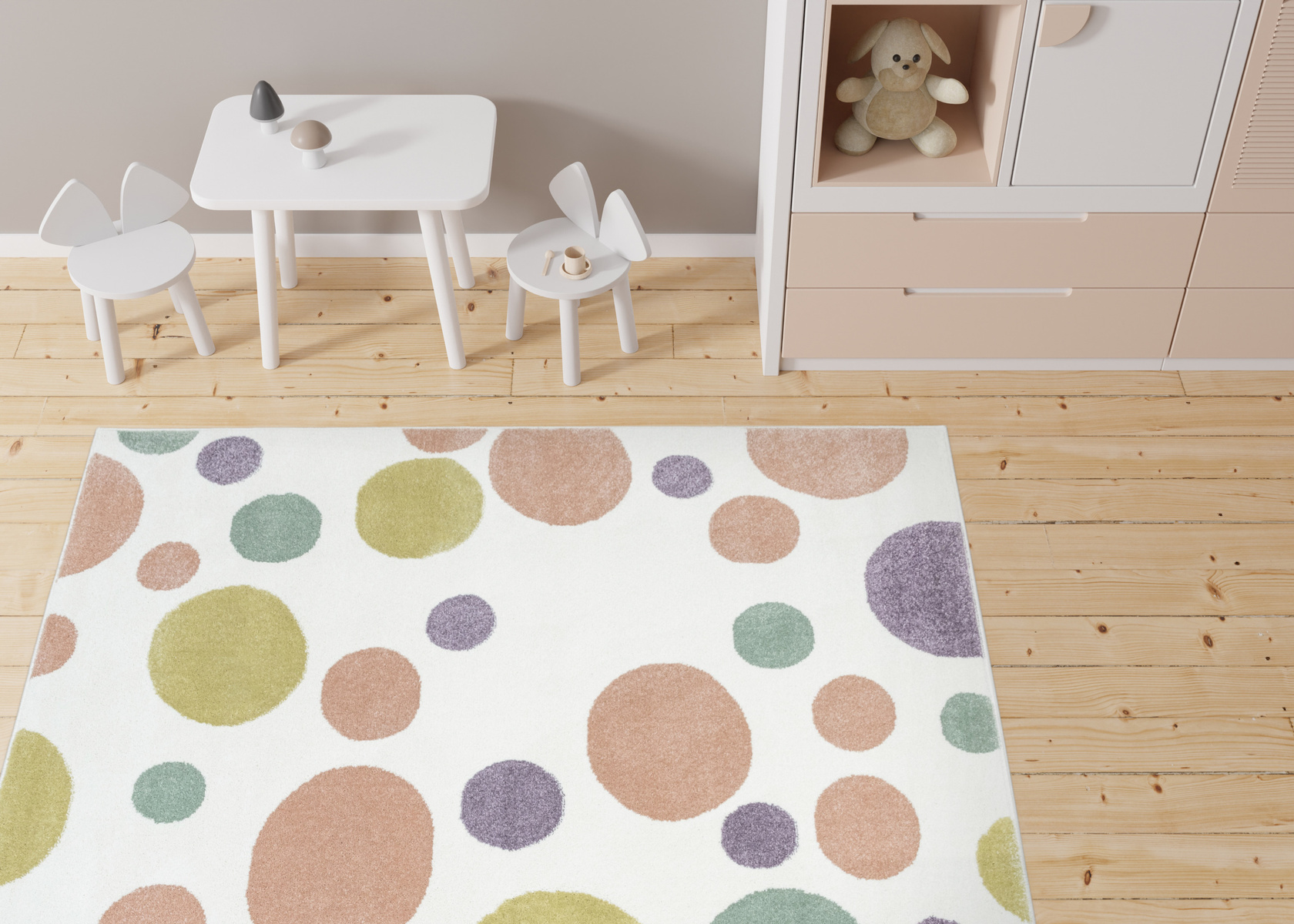 - Dywan dziecięcy Lima z mięciutkim runem o wzorze w nieregularne kropki o różnych wielkościach w odcieniach kremu, różu, fioletu, zieleni i żółtego.