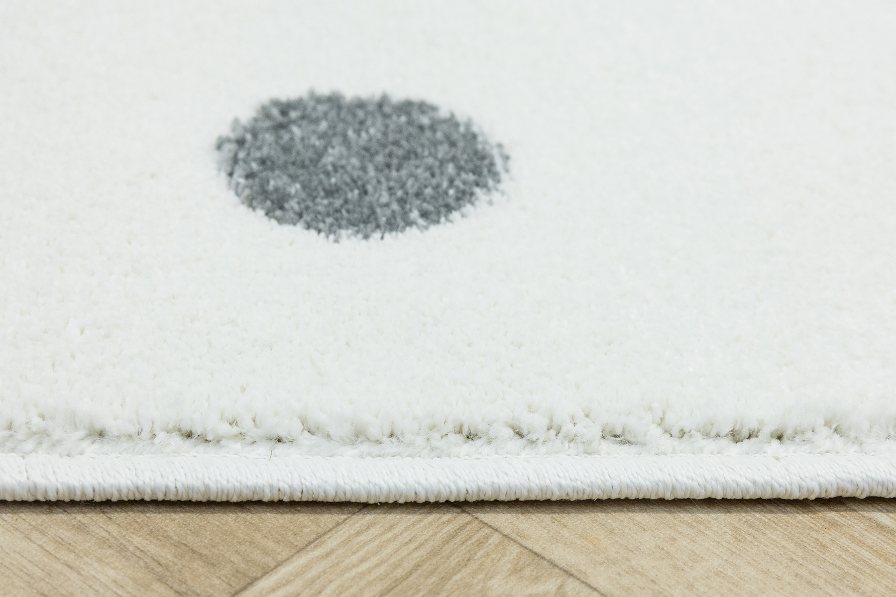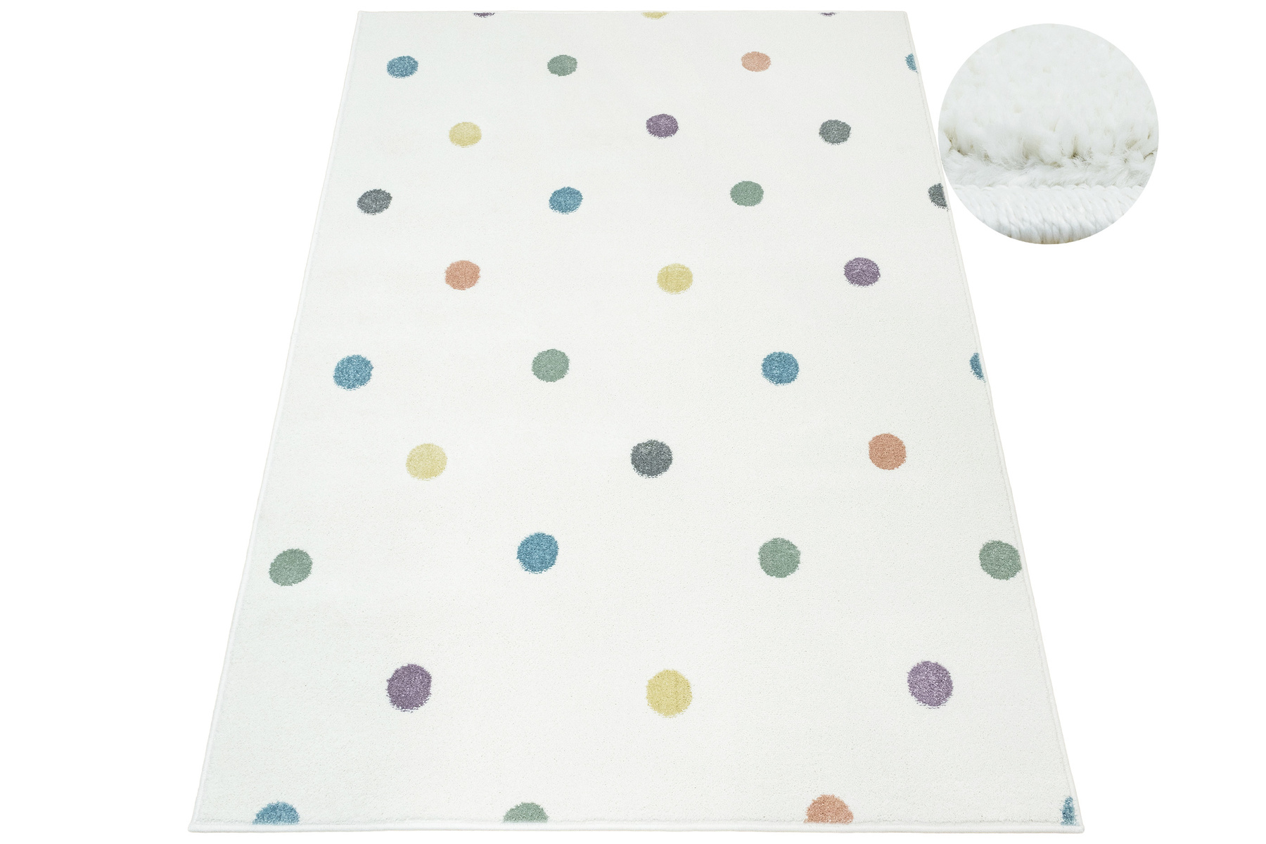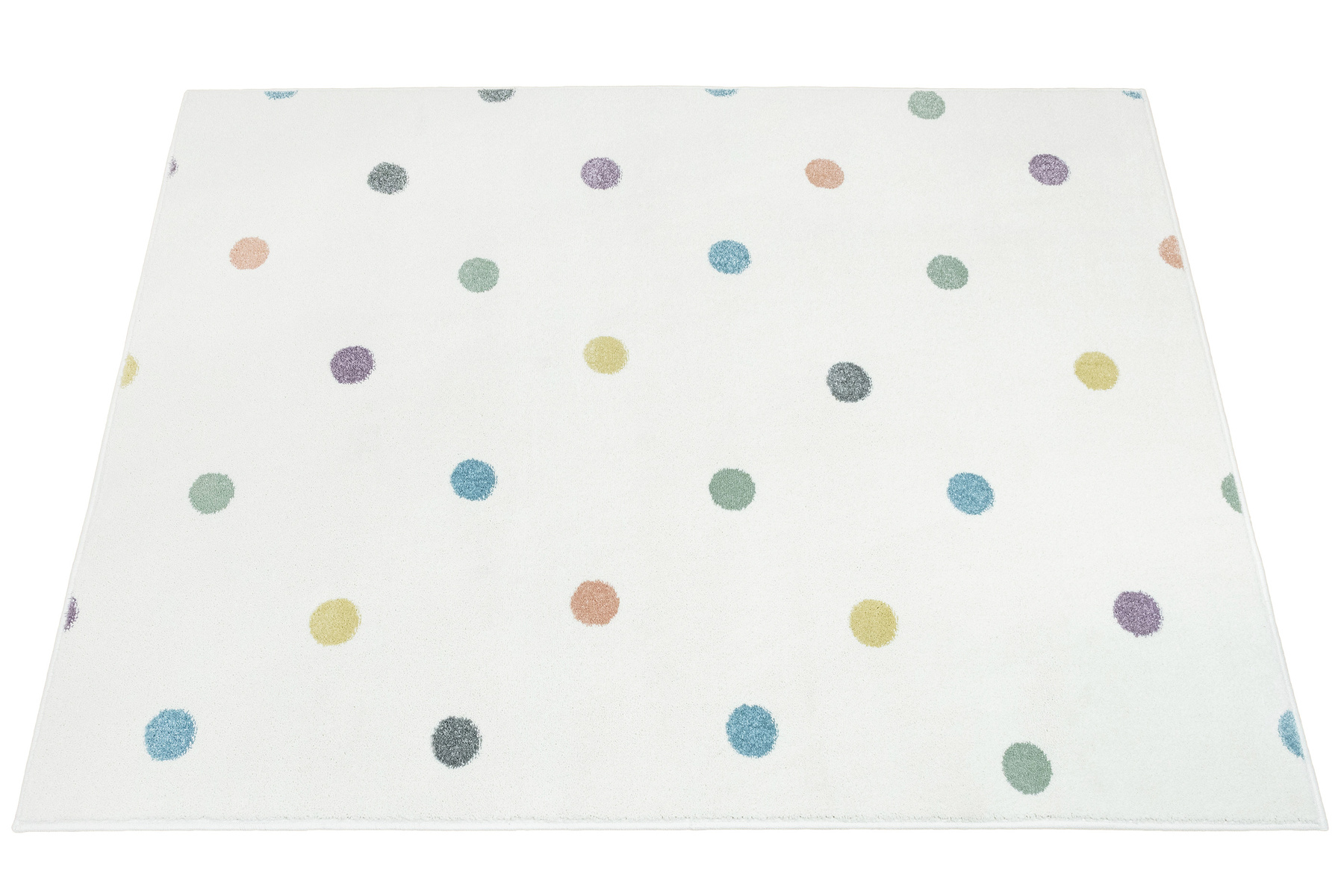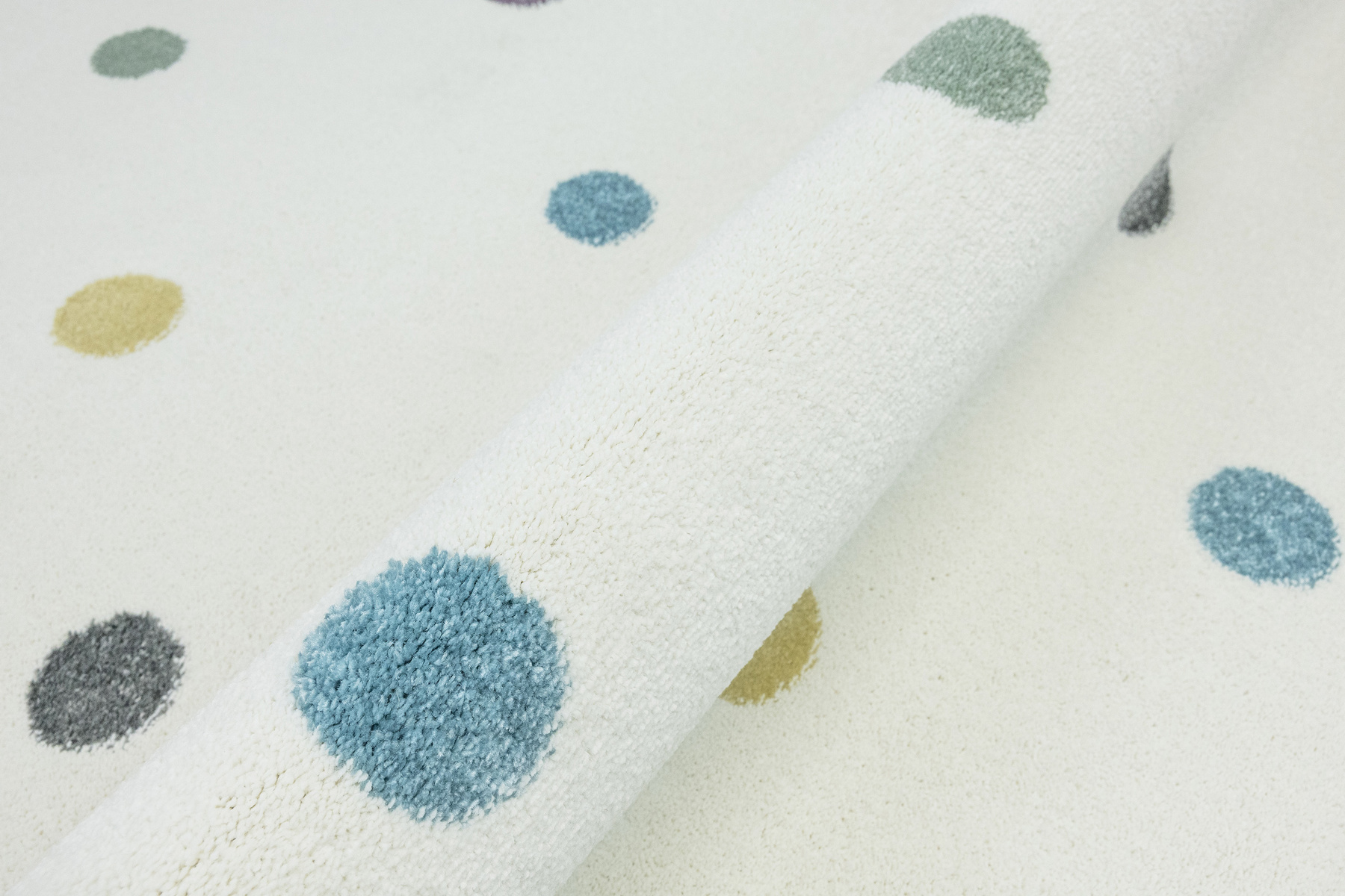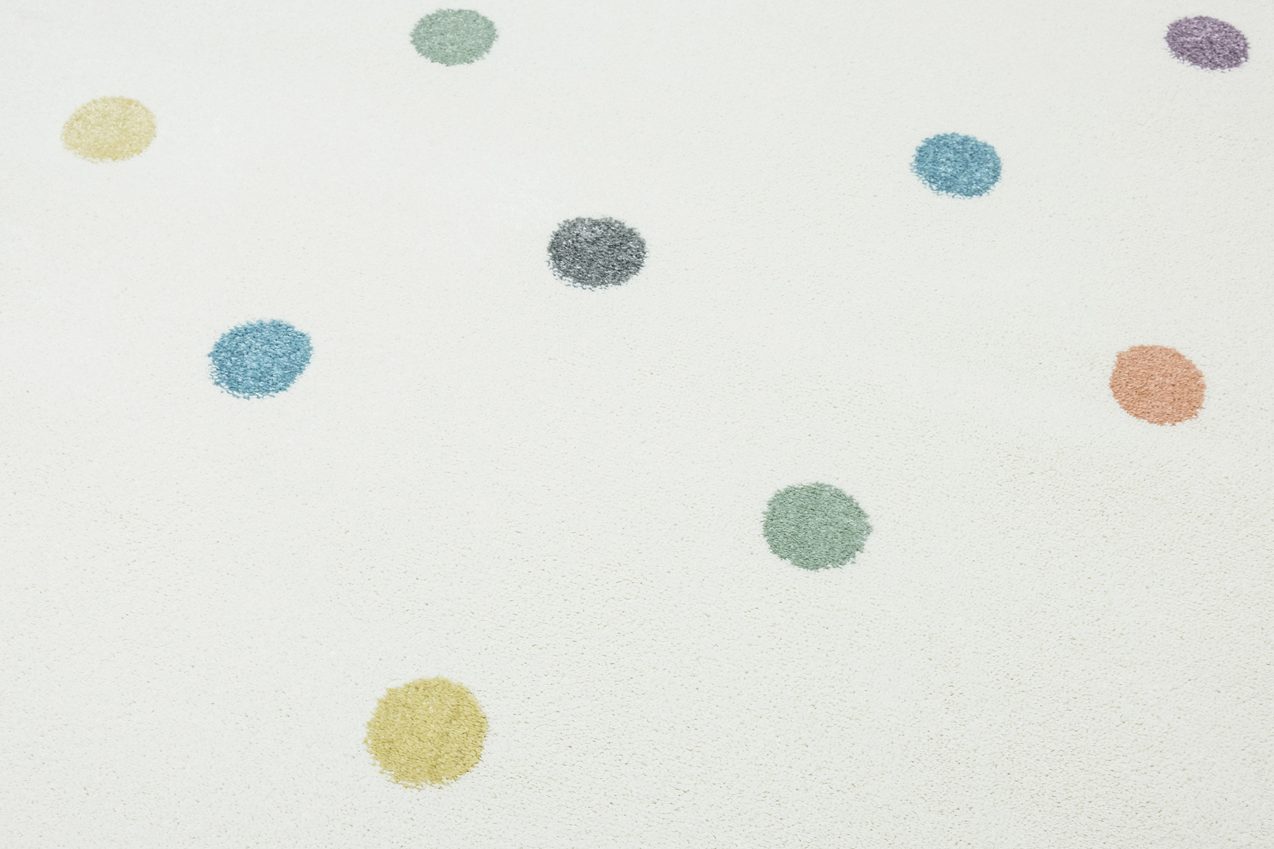 - Kolorowy dywan z wykładziny dziecięcej z wzorem w kropki w odcieniach kremu, fioletu, różu, szarości, zieleni, niebieskiego i żółtego.