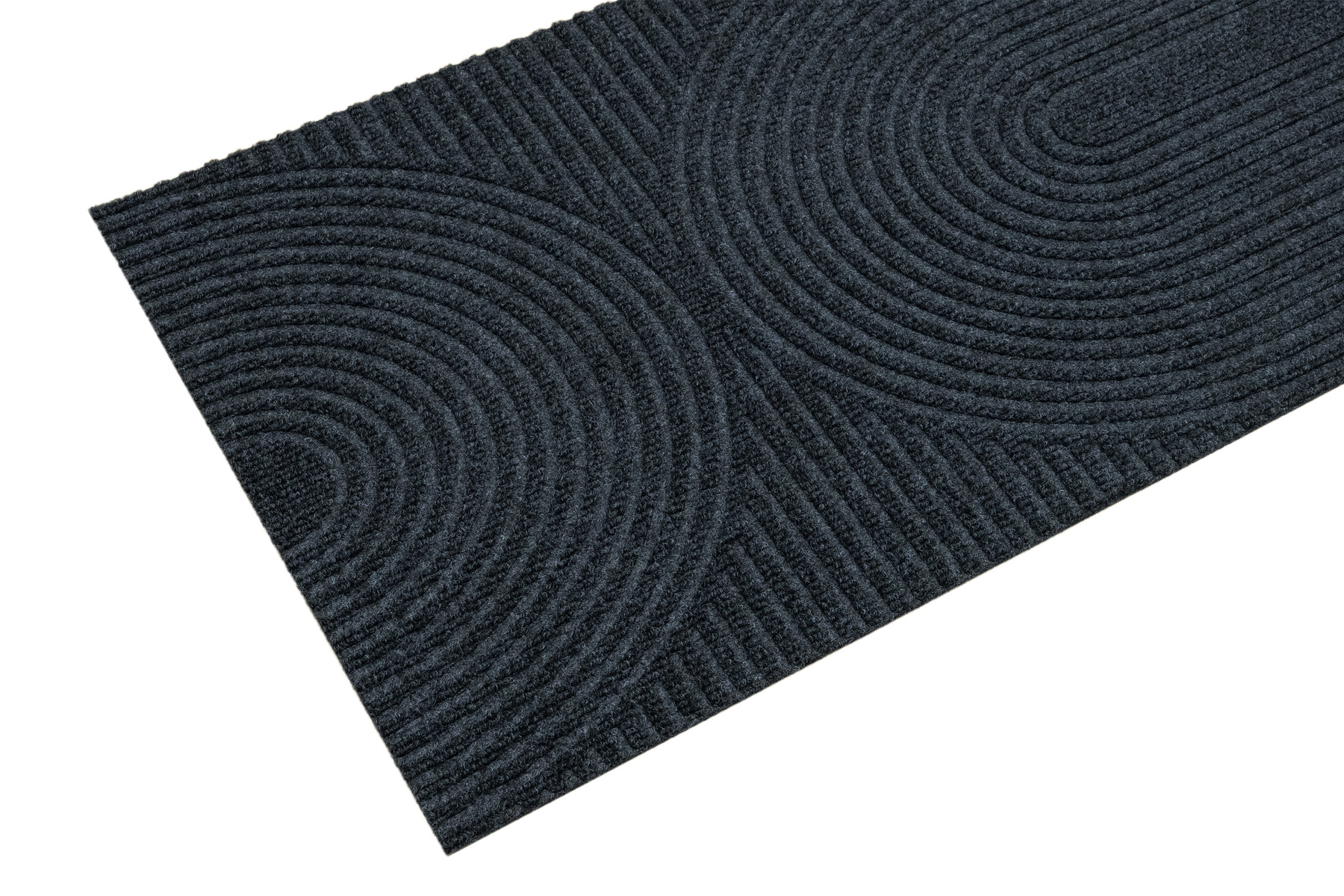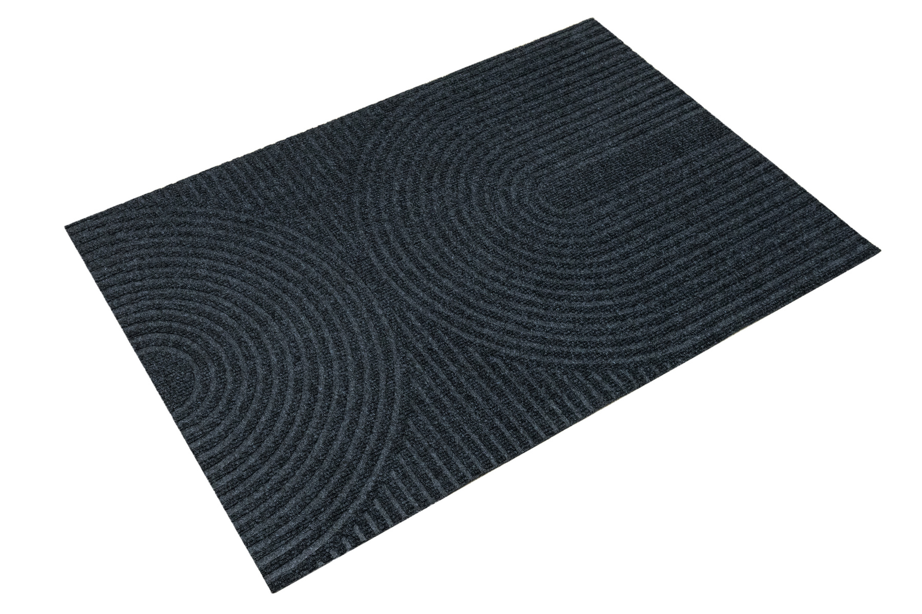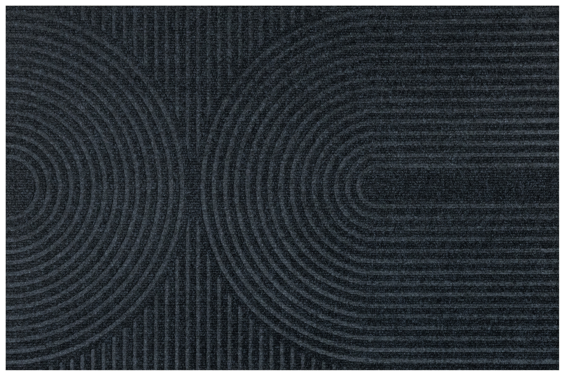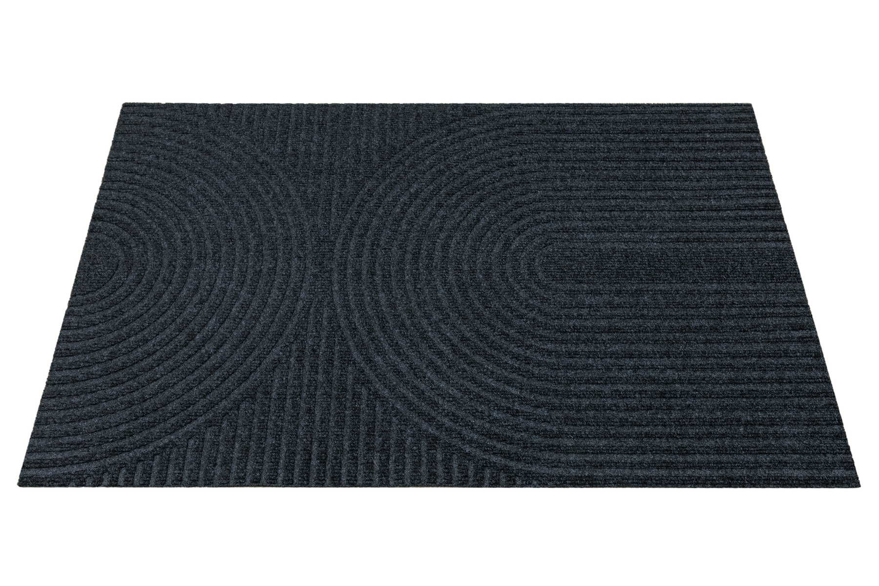 • Antypoślizgowa wycieraczka Tłoczona z podgumowanym spodem i tekstylnym runem żebrowanym wzorem w półkola w praktycznych odcieniach grafitowej szarości.
