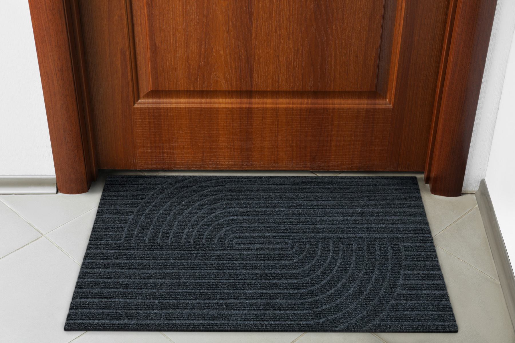 - Antypoślizgowa wycieraczka Tłoczona z podgumowanym spodem i tekstylnym runem żebrowanym wzorem geometrycznym w praktycznych odcieniach grafitowej szarości.