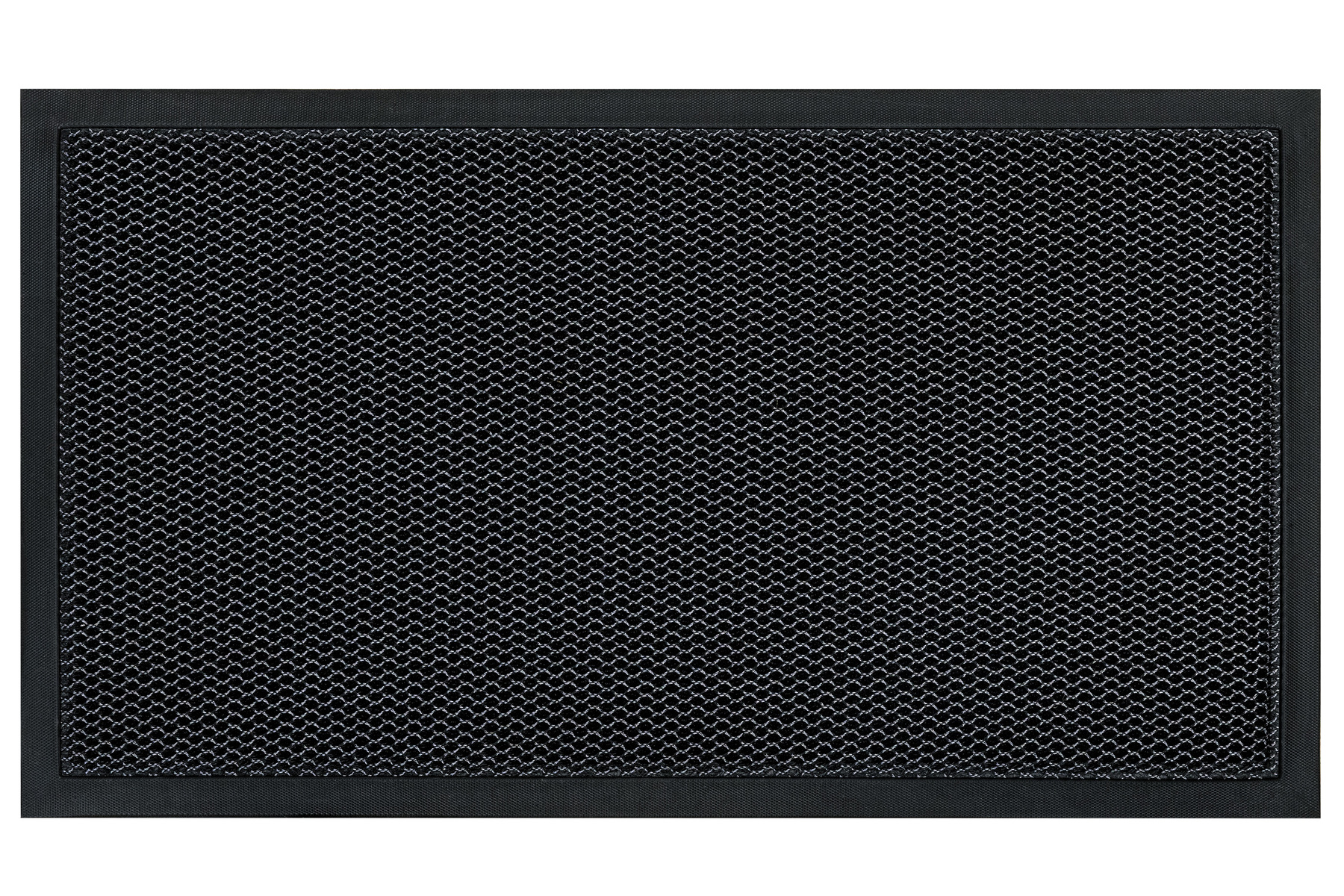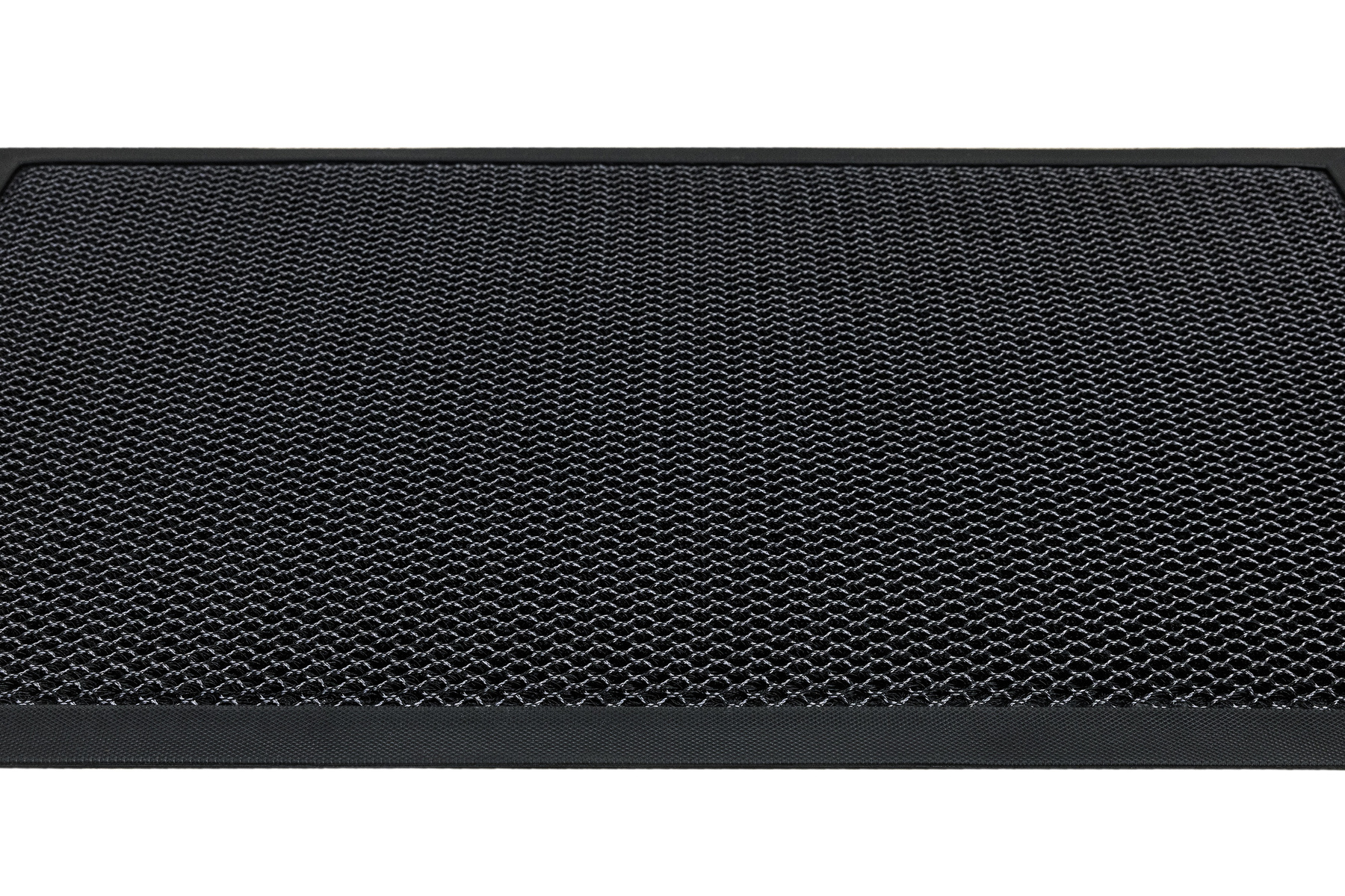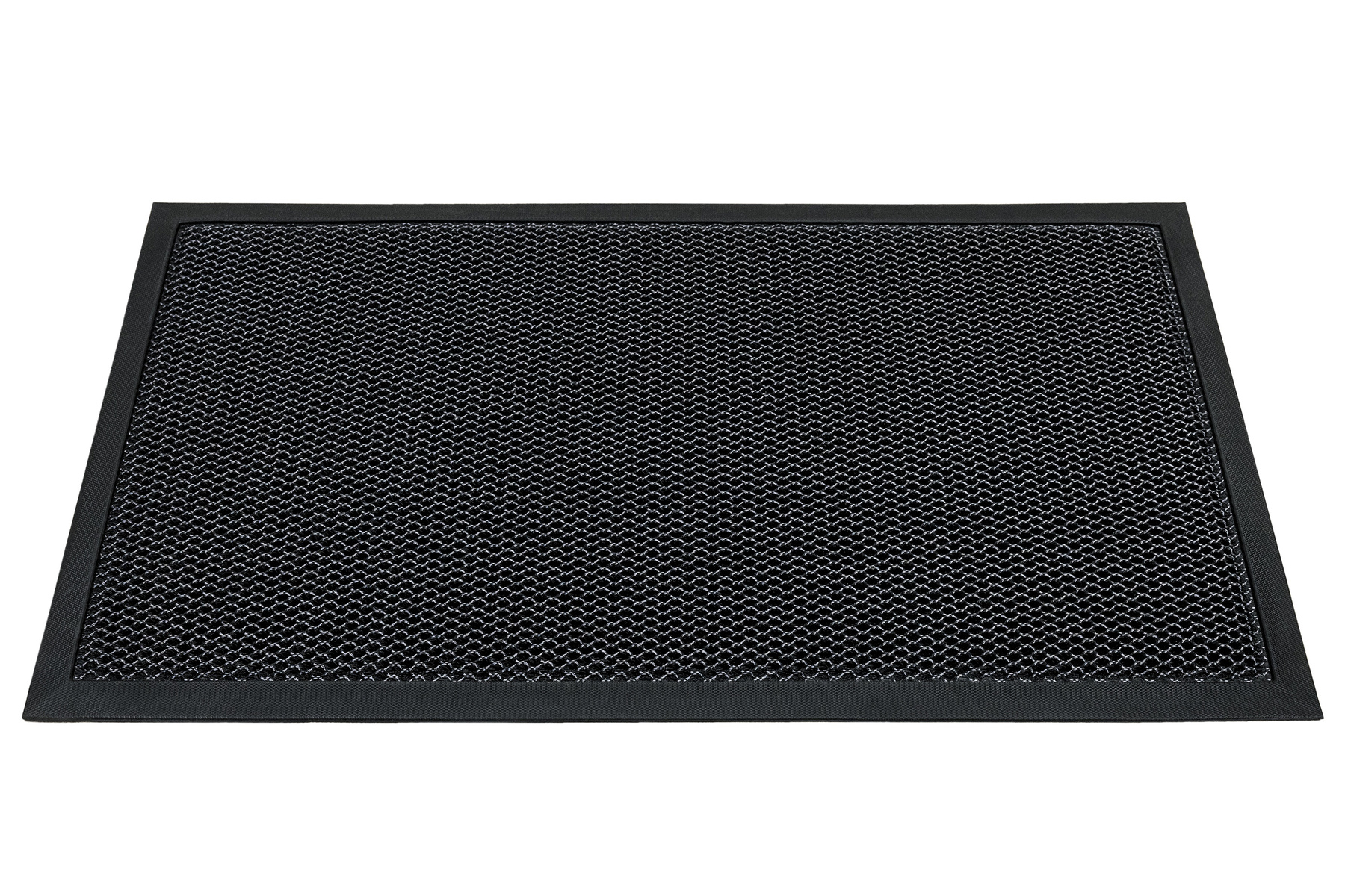 - Antypoślizgowa podgumowana wycieraczka 3D Net z czarną ramką i uginającym się siatkowym panelem w metalicznym odcieniu szarości.