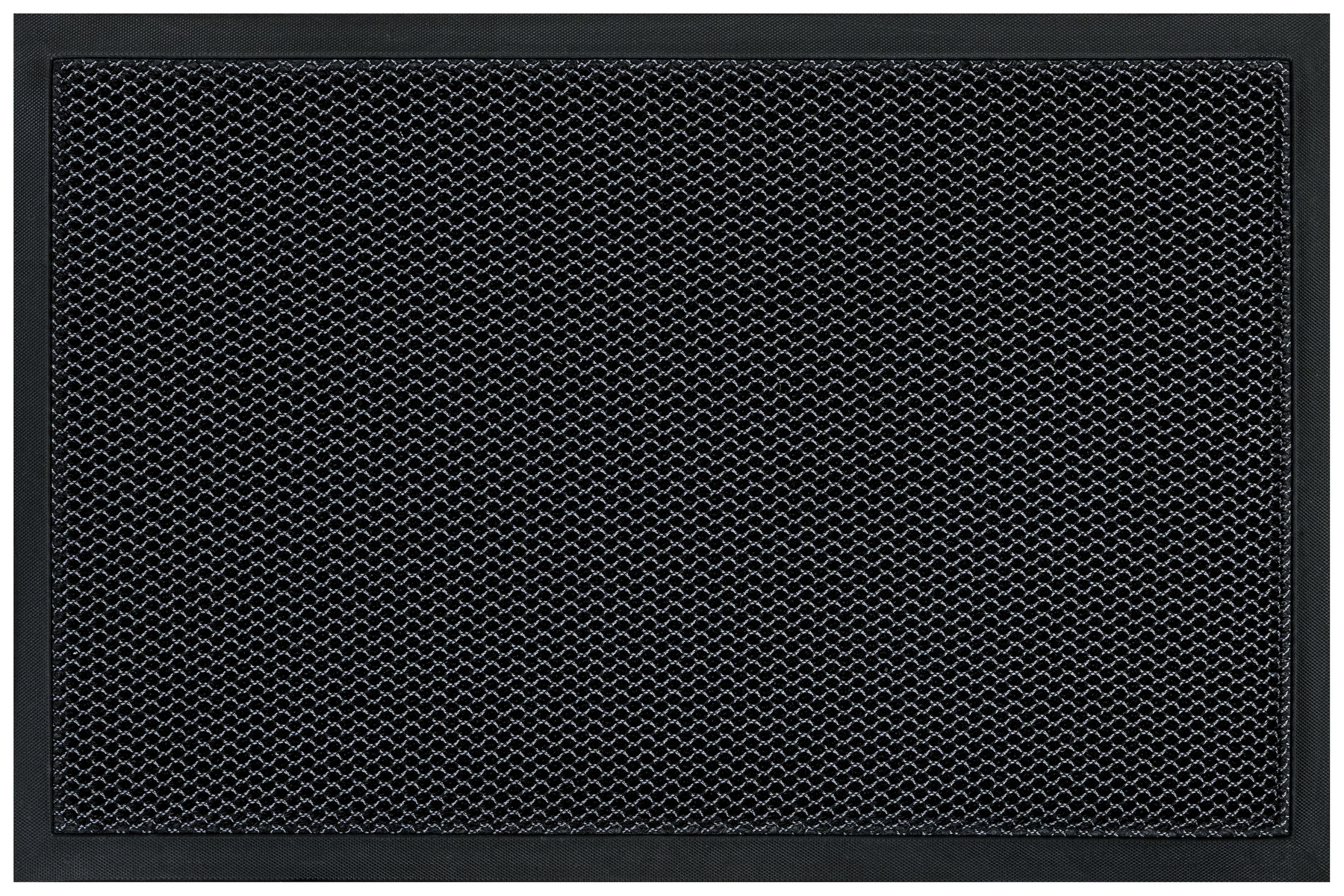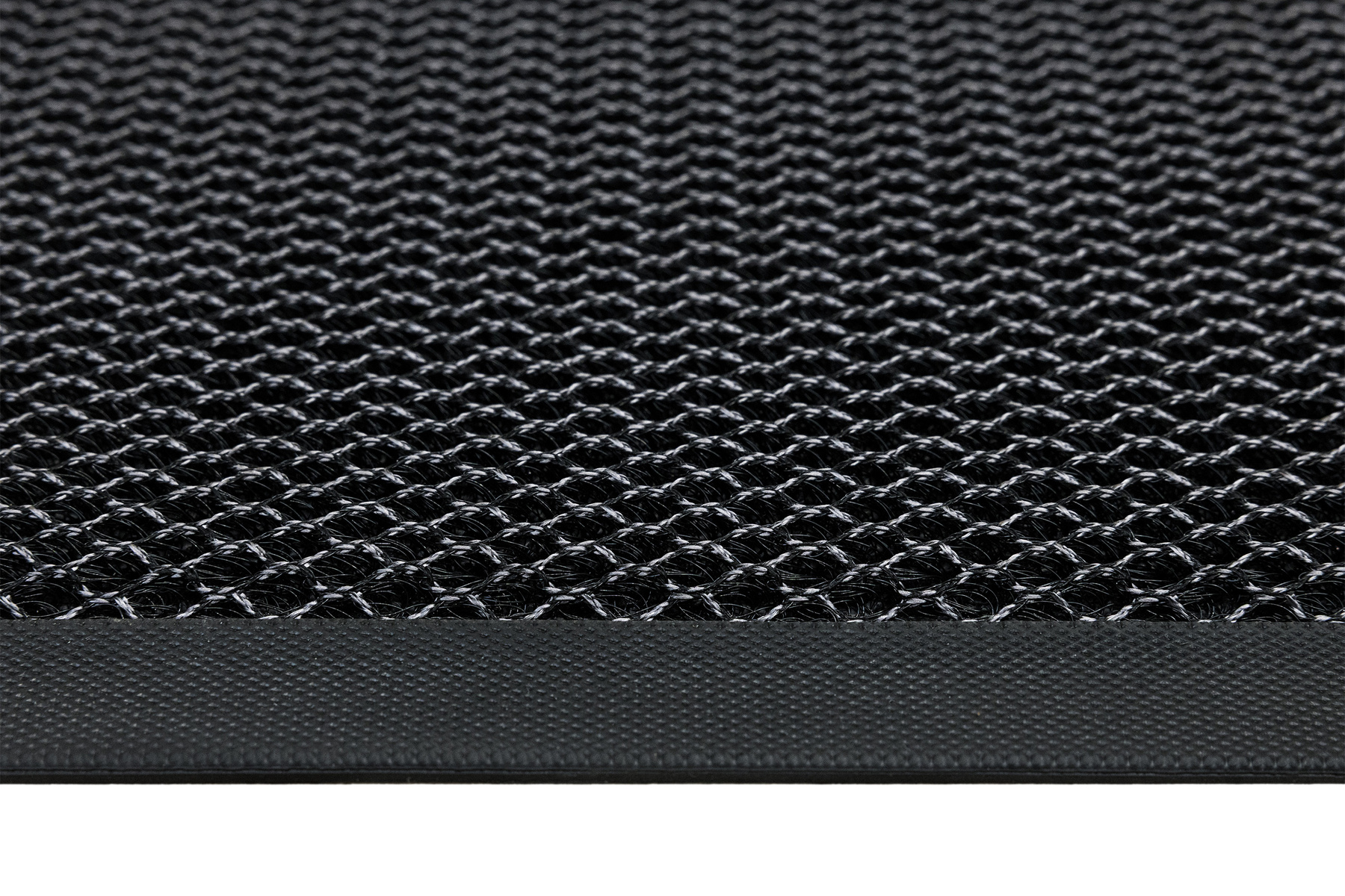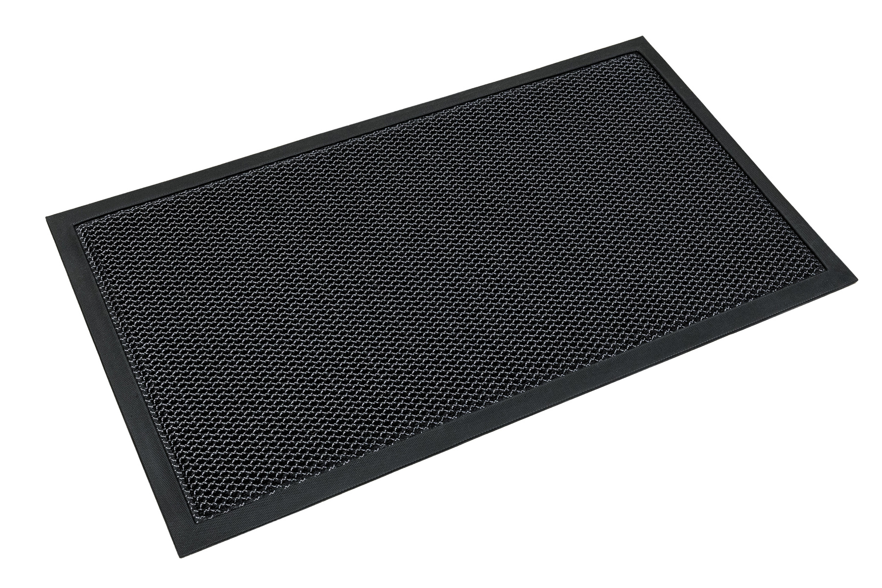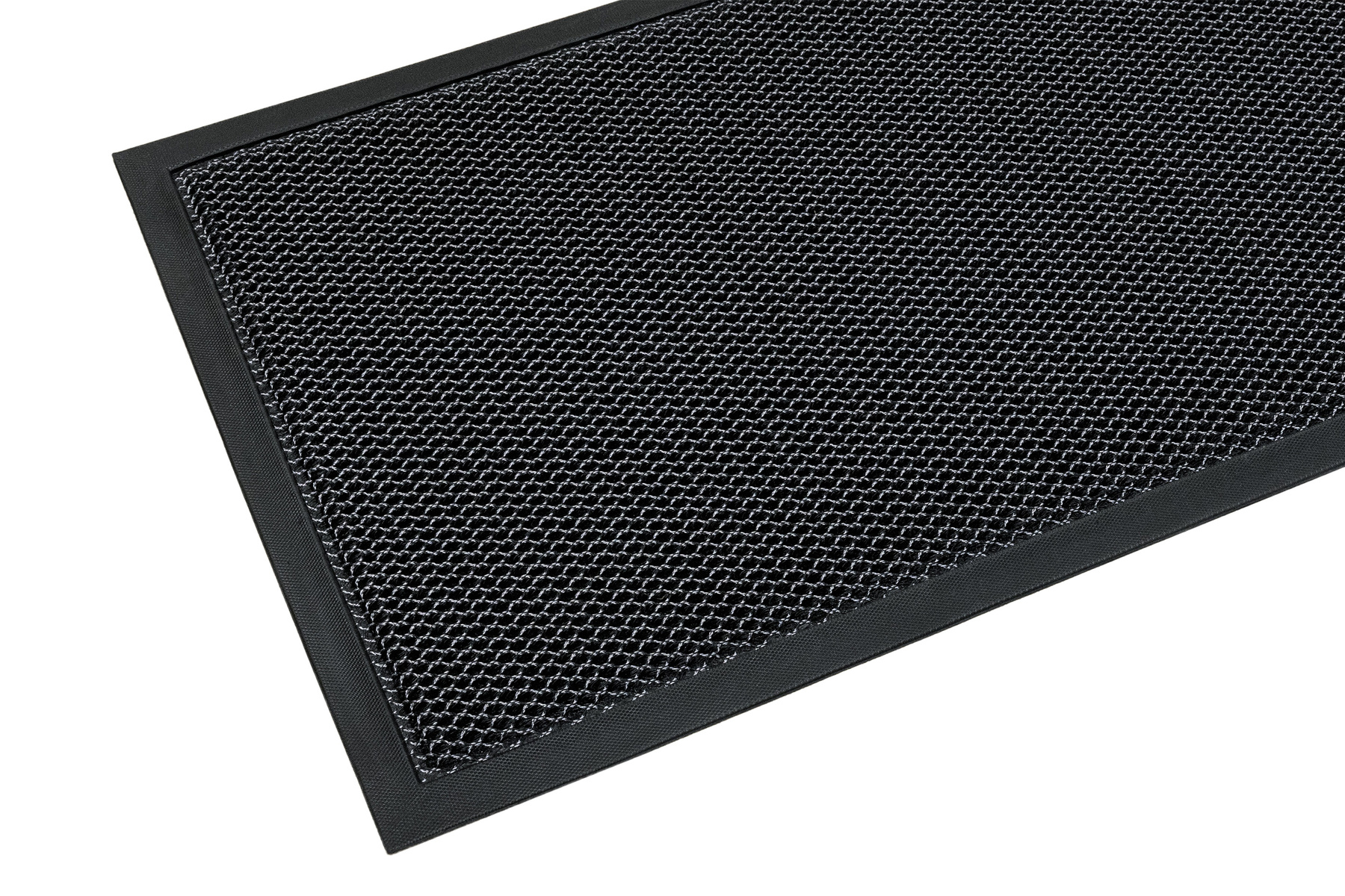 - Antypoślizgowa podgumowana wycieraczka 3D Net z czarną ramką i uginającym się siatkowym panelem w metalicznym odcieniu szarości.
