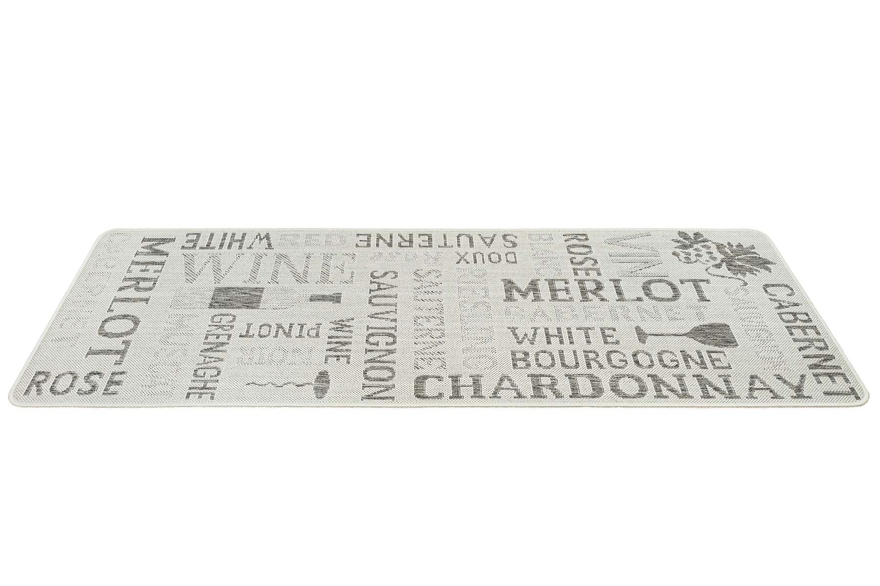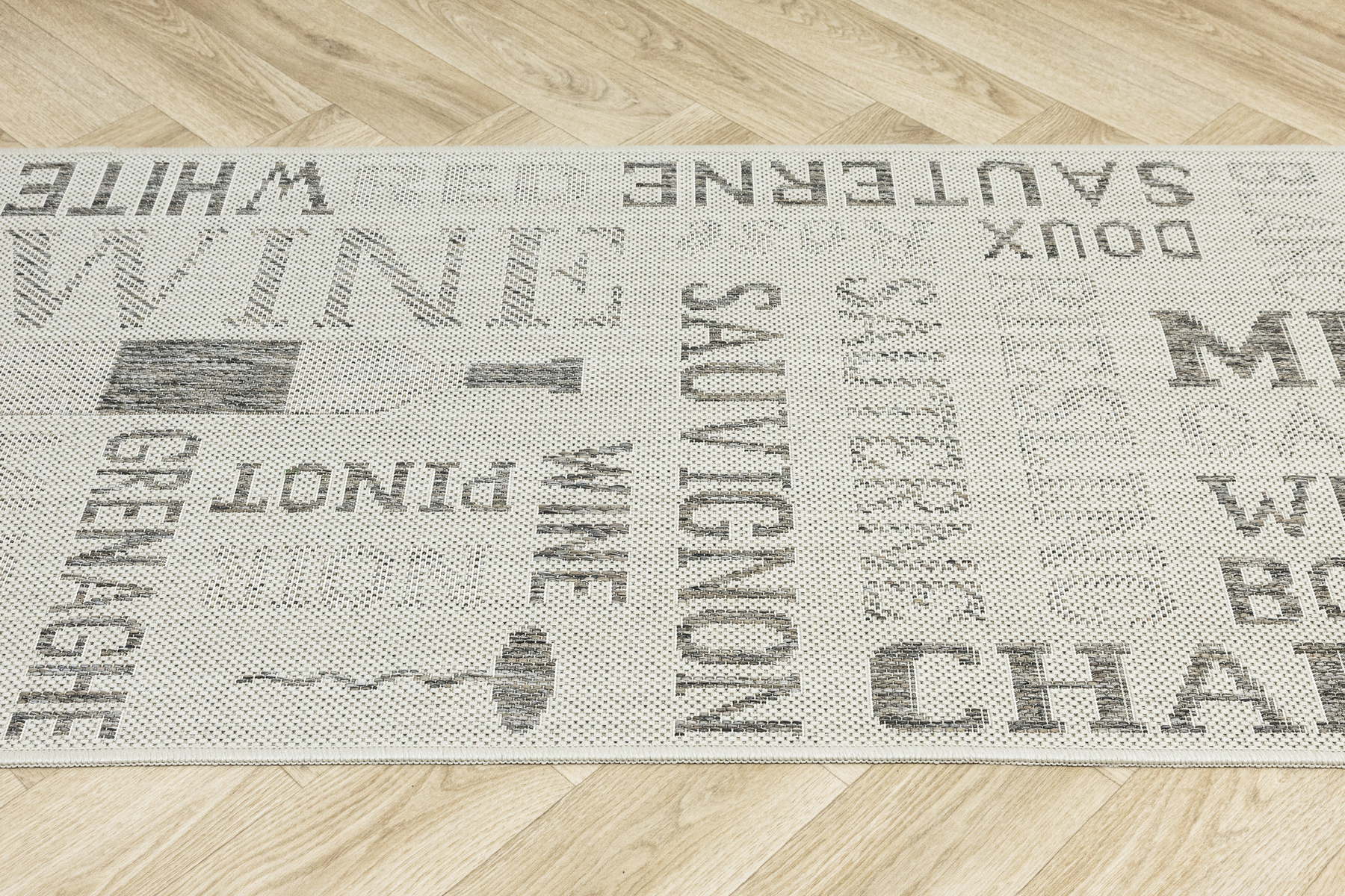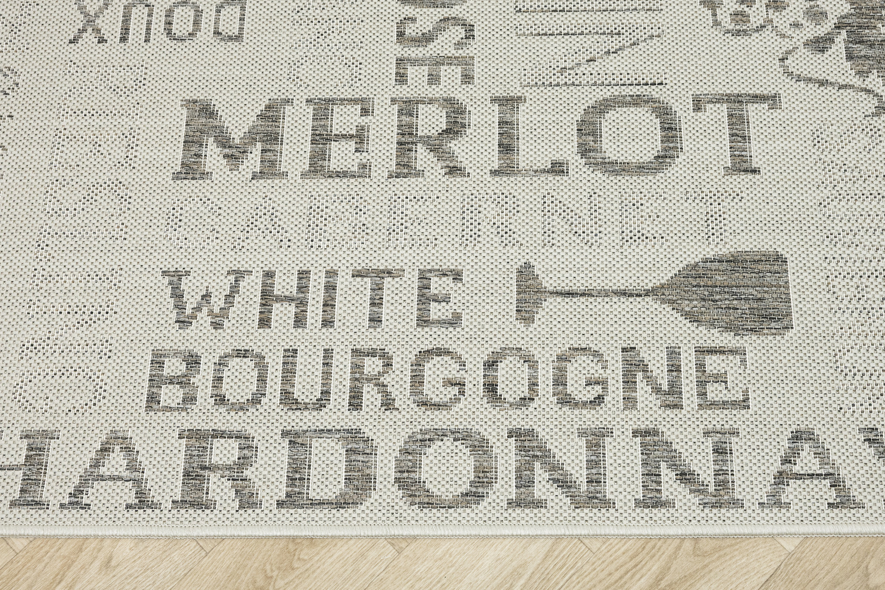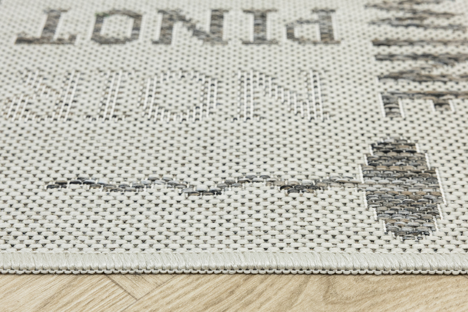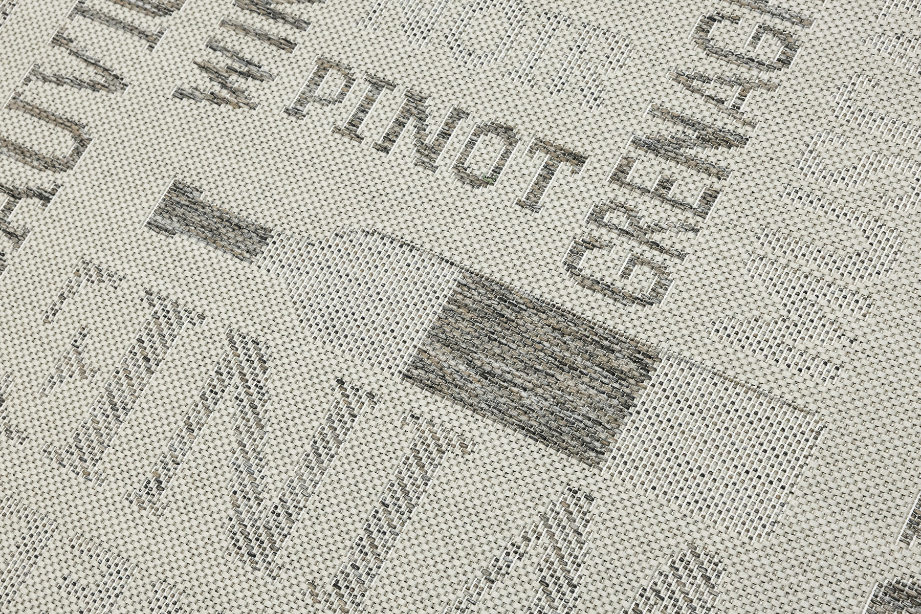 • Podgumowany, antypoślizgowy, sznurkowy dywan Flex z napisami i wzorem inspirowanym winem w odcieniach szarości, grafitu, kremu, brązu.