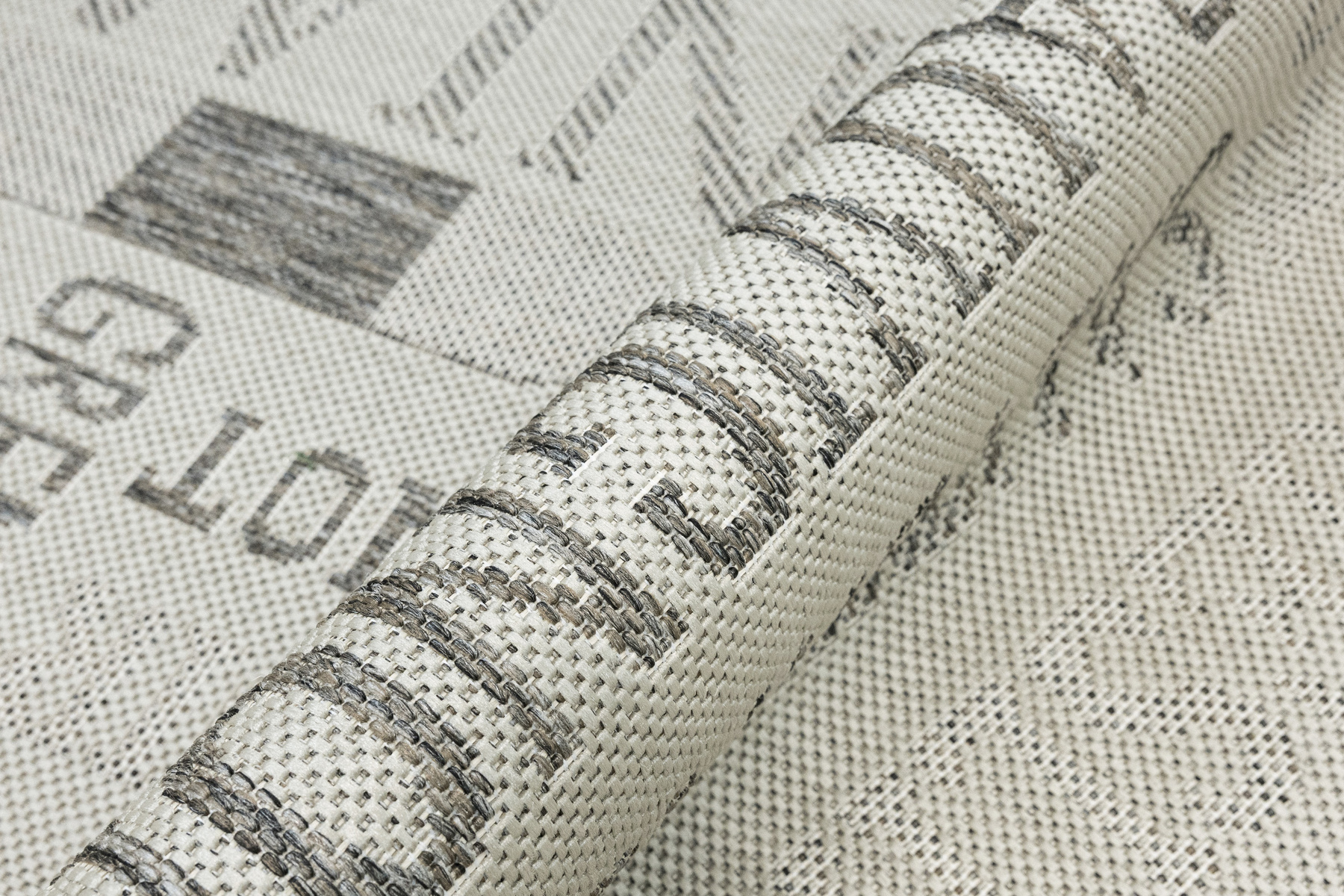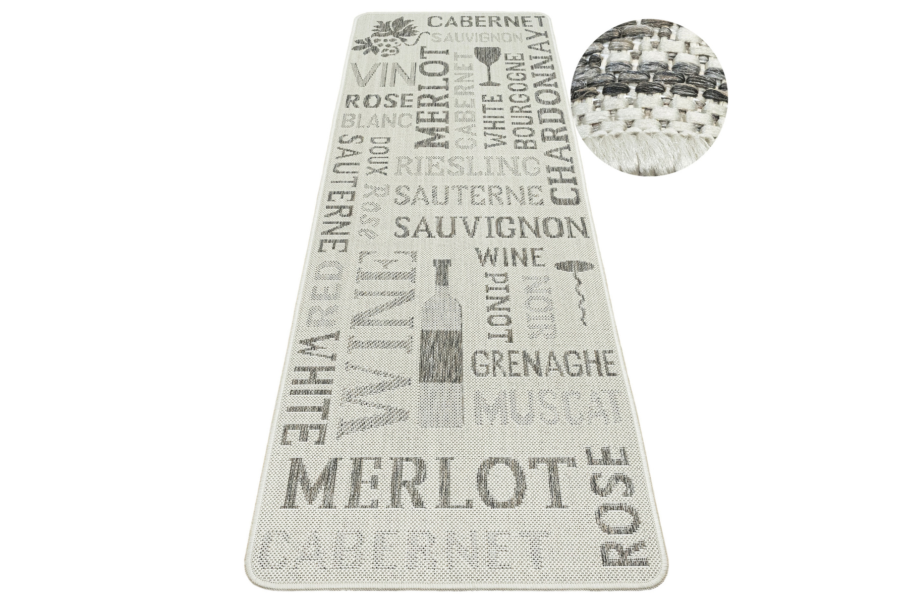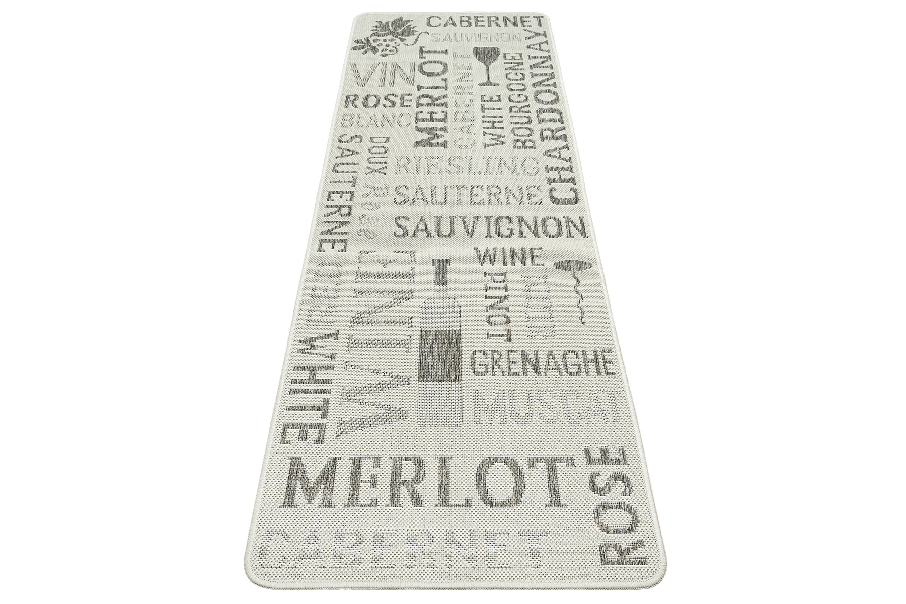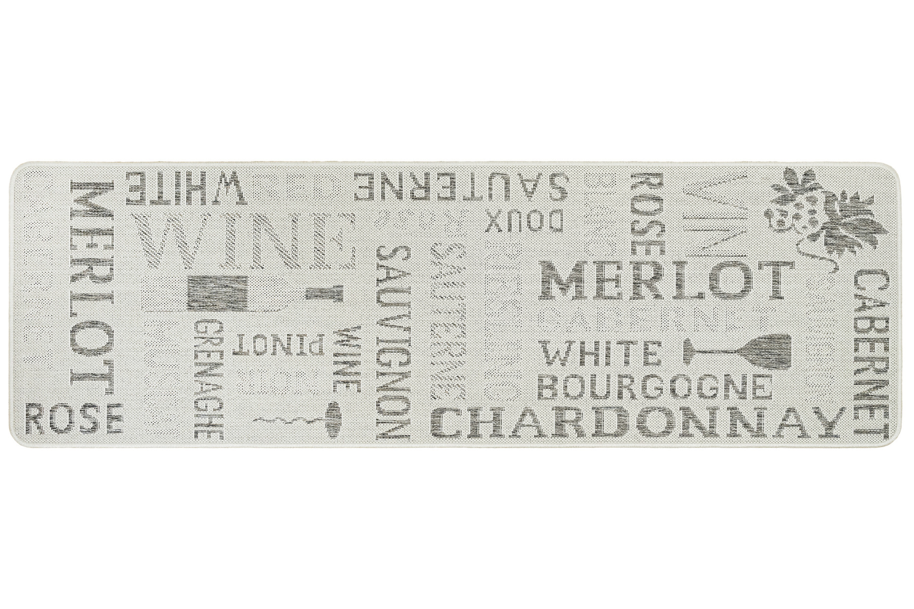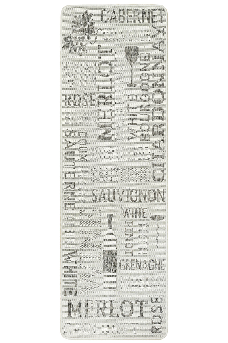 • Podgumowany, antypoślizgowy, sznurkowy dywan Flex z napisami i wzorem inspirowanym winem w odcieniach szarości, grafitu, kremu, brązu.