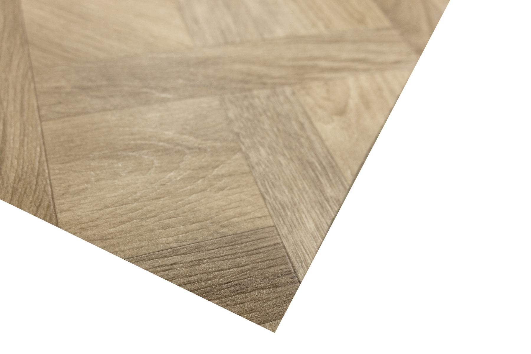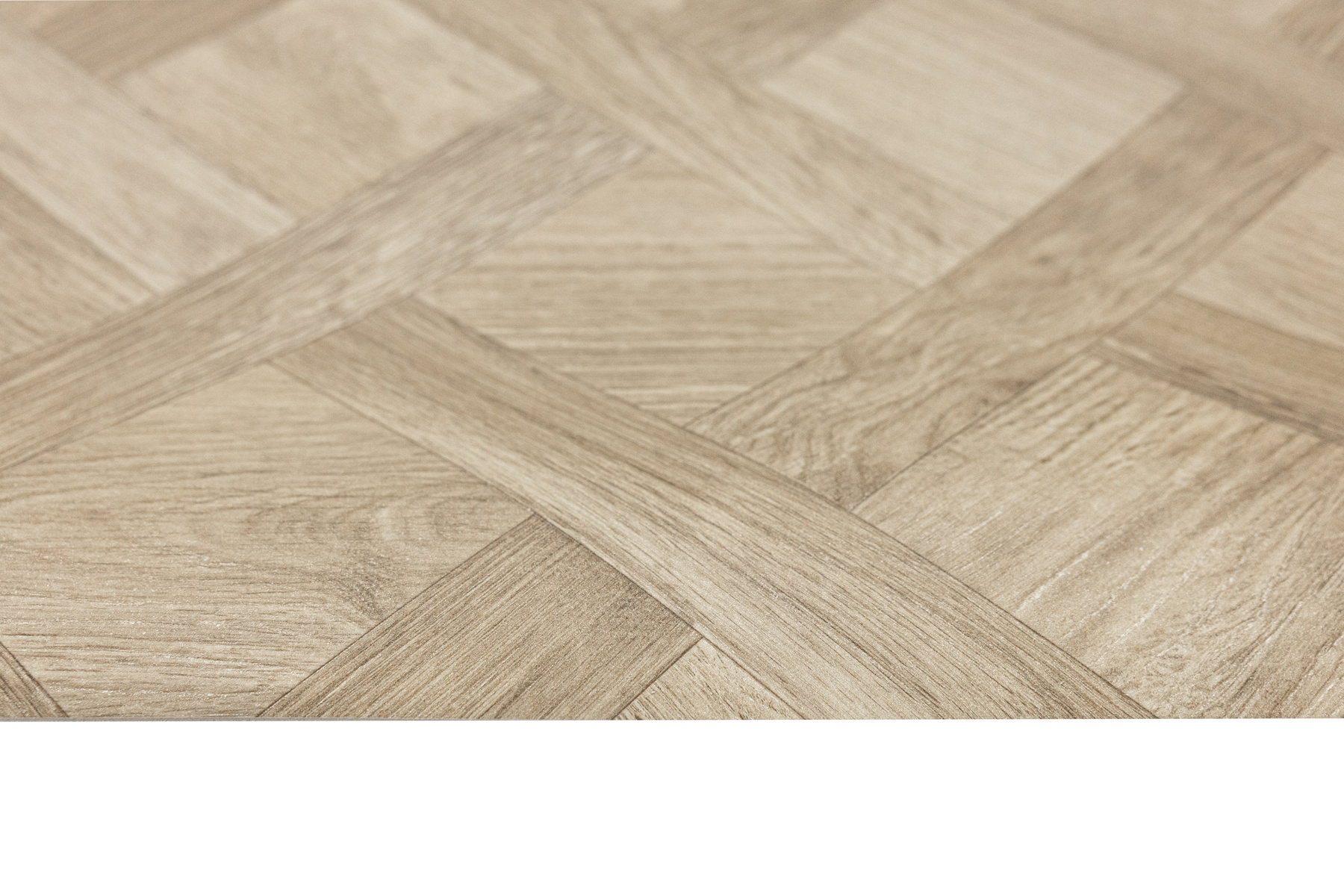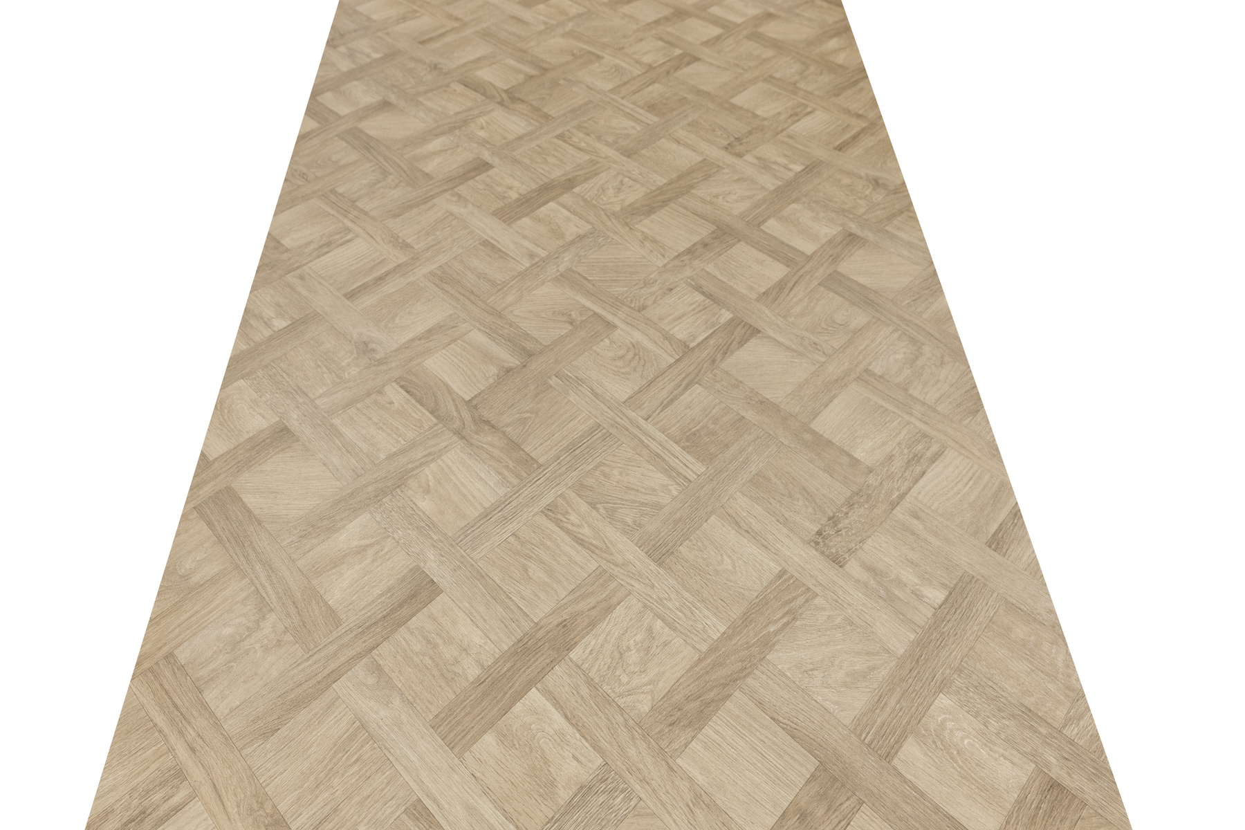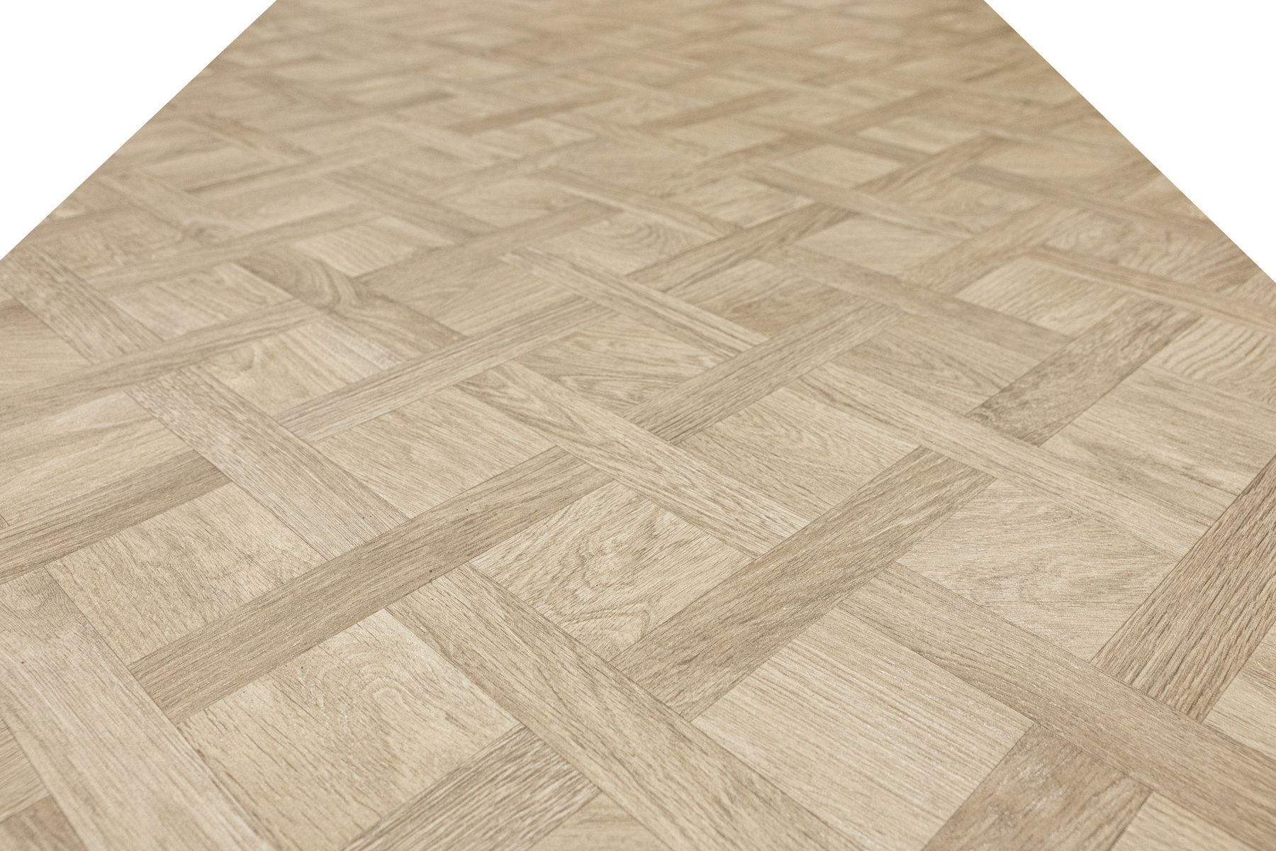 • Wykładzina PCV Bingo Giuliano ze wzorem imitującym parkiet, podłogę z desek, klepek ułożonych w pałacowym stylu wersalskim w odcieniach beżu i brązu.
