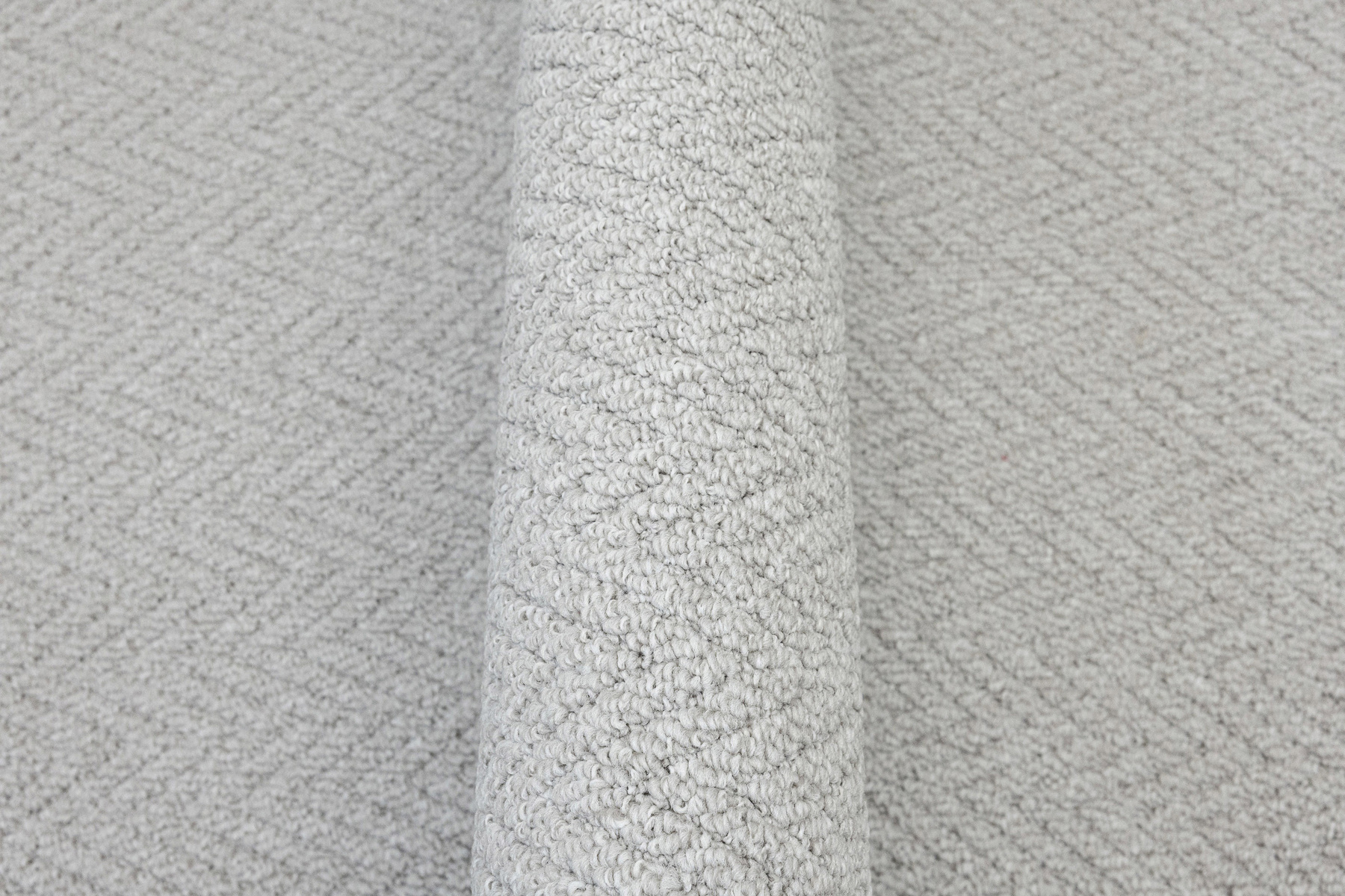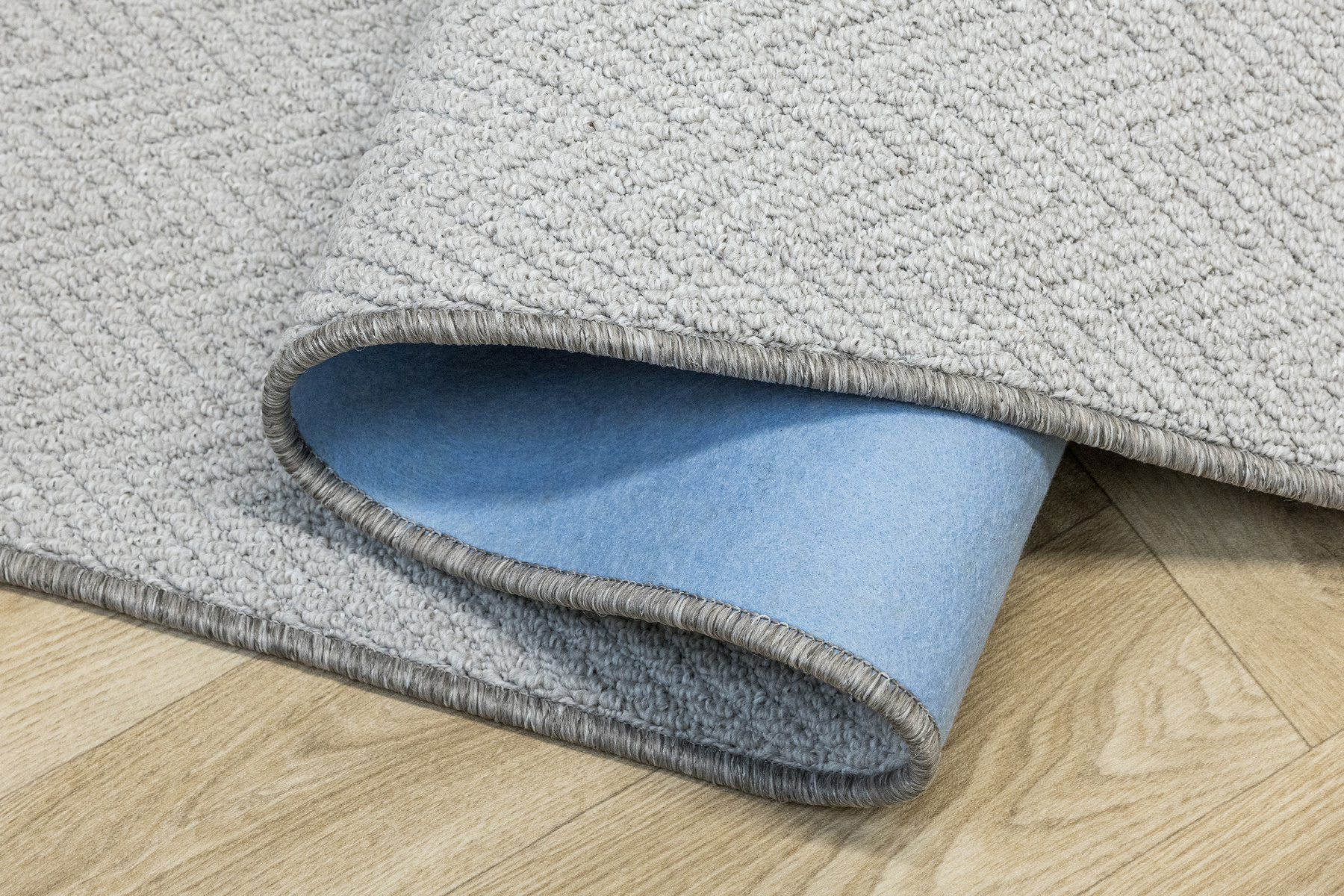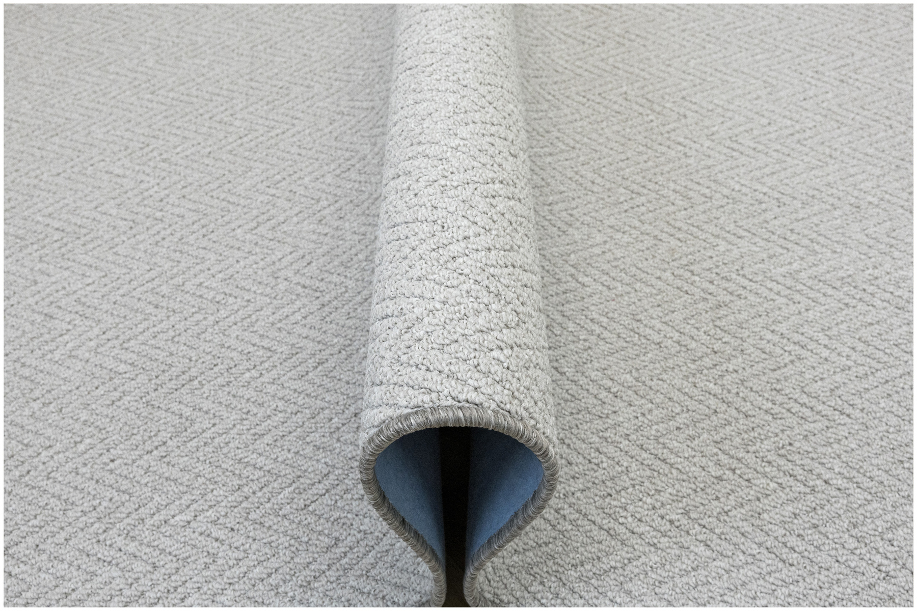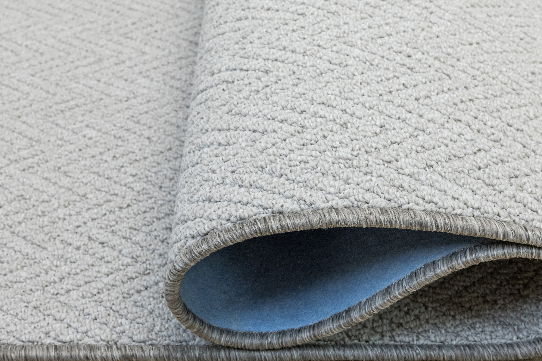 - Dywan wykonany z wykładziny pętelkowej Havanna z unikalnym, oryginalnym grubym splotem w jodełkę w odcieniu szarości ze spodem wykończonym niebieskim filcem.