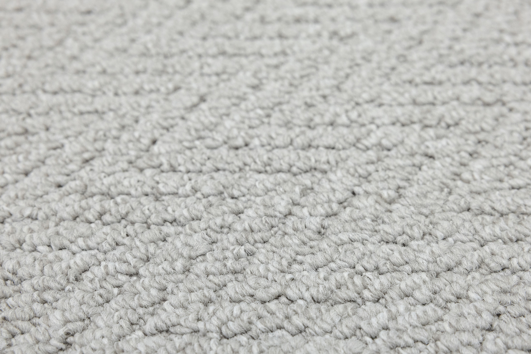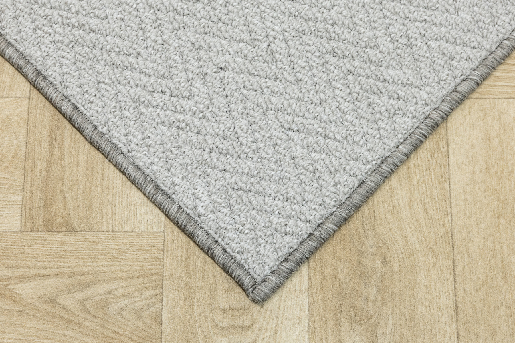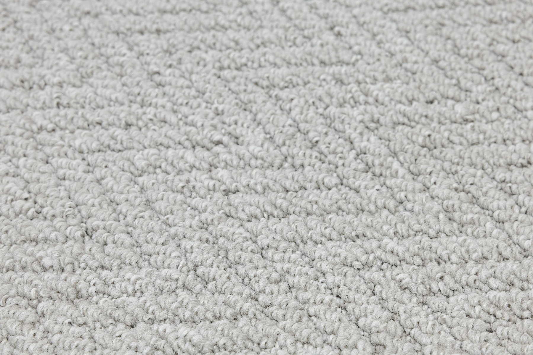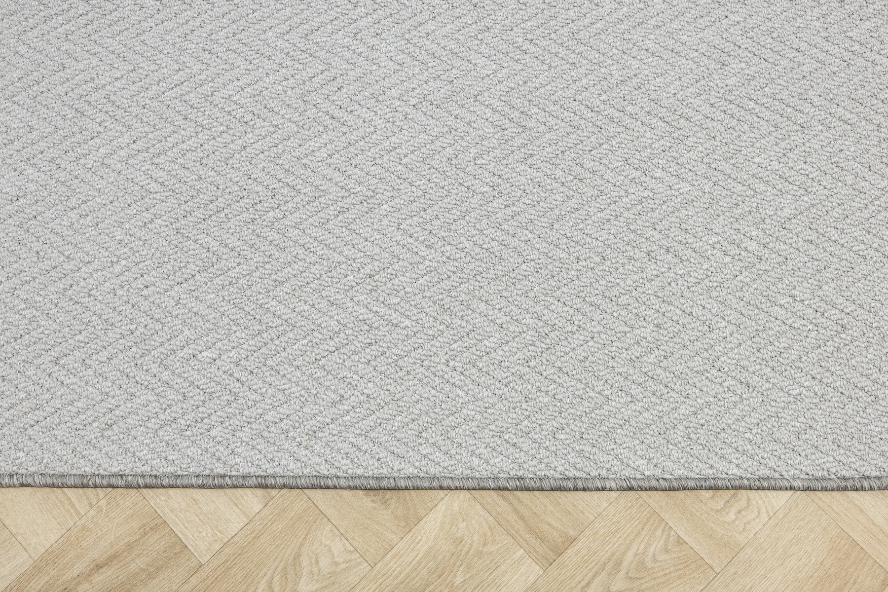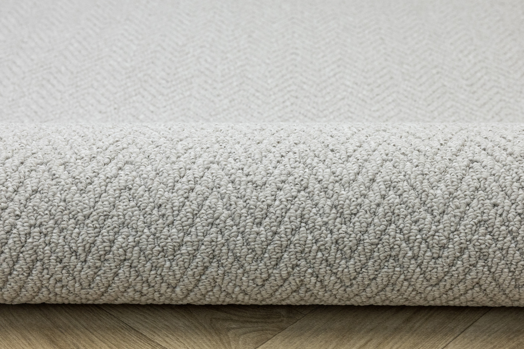 - Dywan wykonany z wykładziny pętelkowej Havanna z unikalnym, oryginalnym grubym splotem w jodełkę w odcieniu szarości ze spodem wykończonym niebieskim filcem.