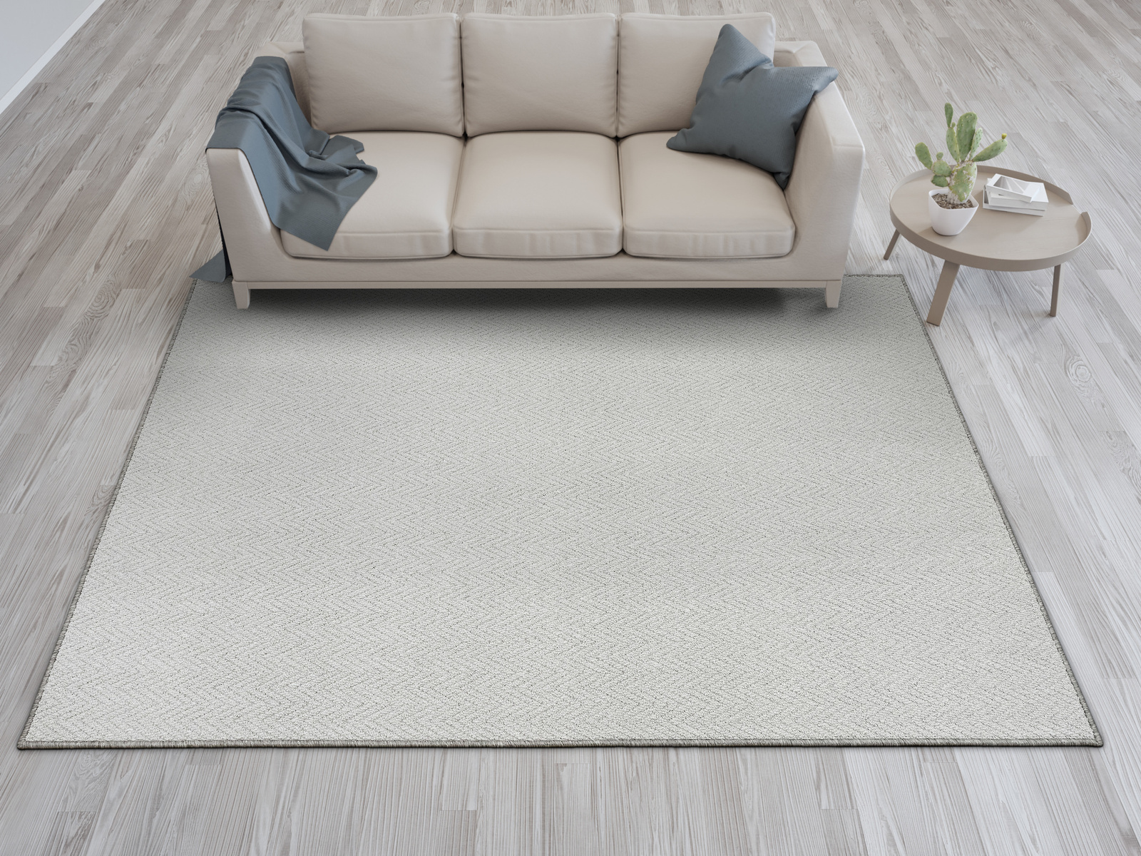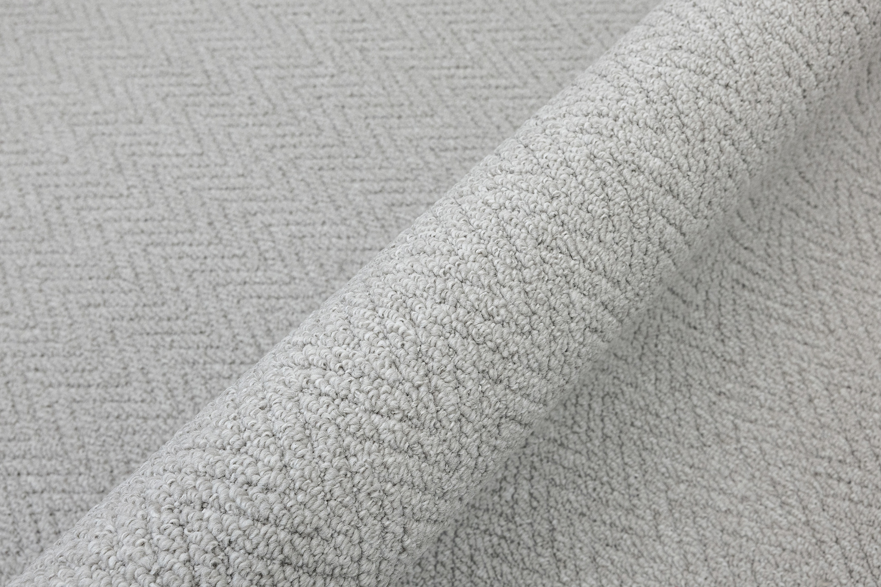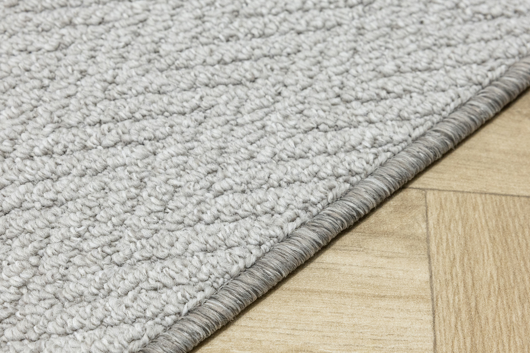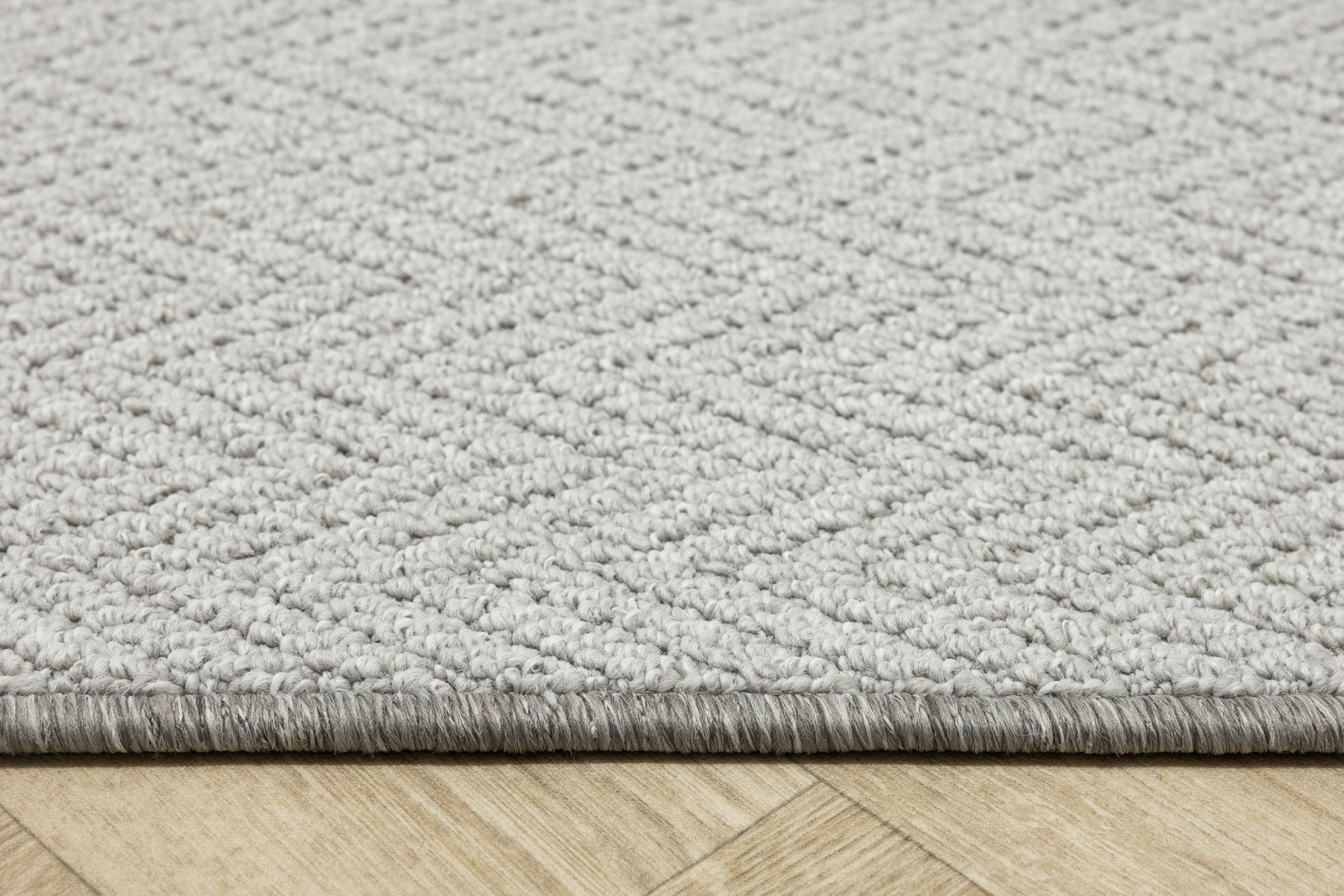 - Dywan wykonany z wykładziny pętelkowej Havanna z unikalnym, oryginalnym grubym splotem w jodełkę w odcieniu szarości ze spodem wykończonym niebieskim filcem.