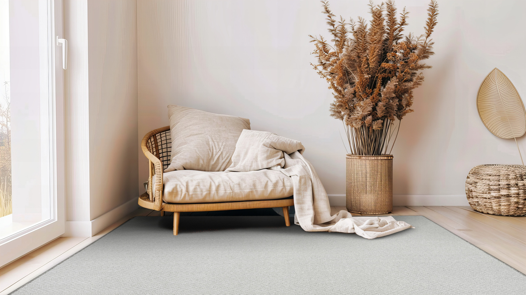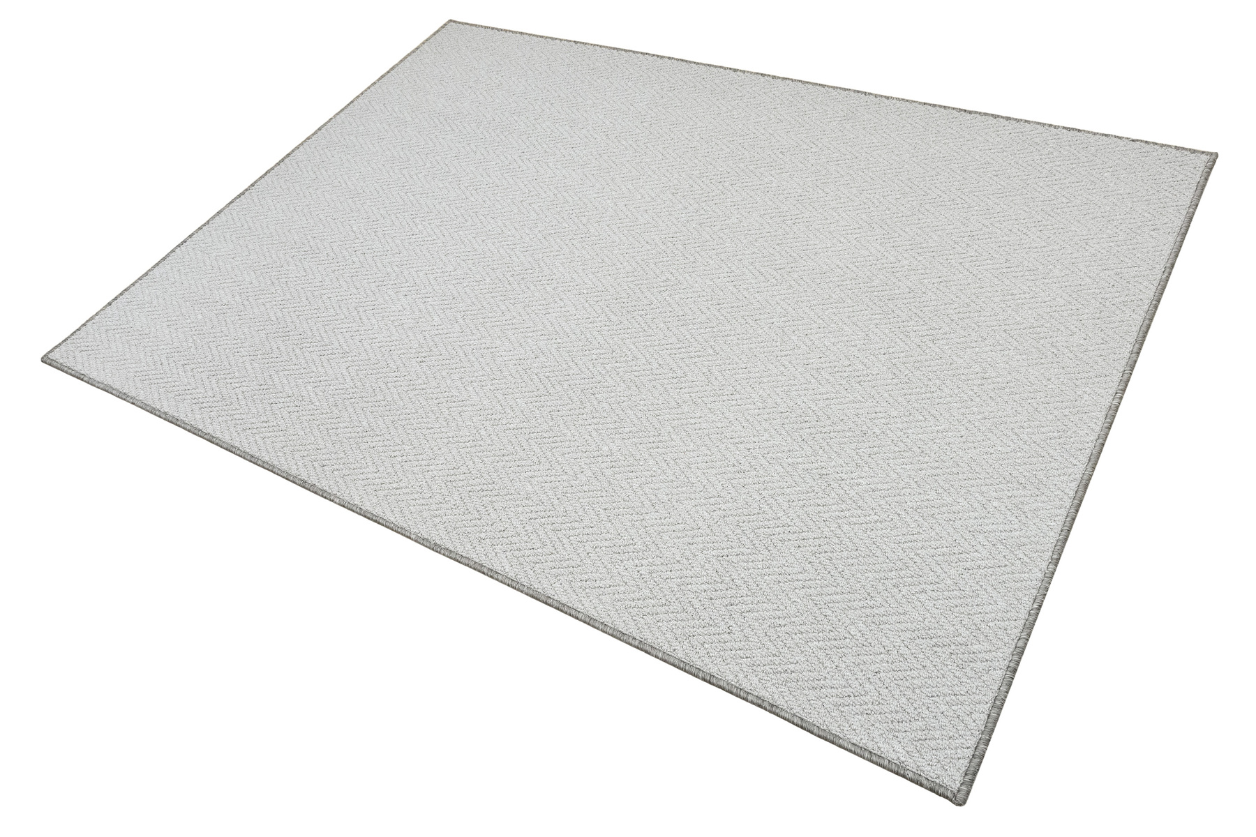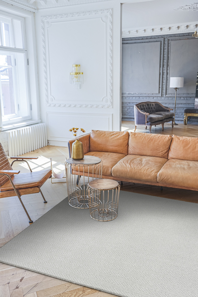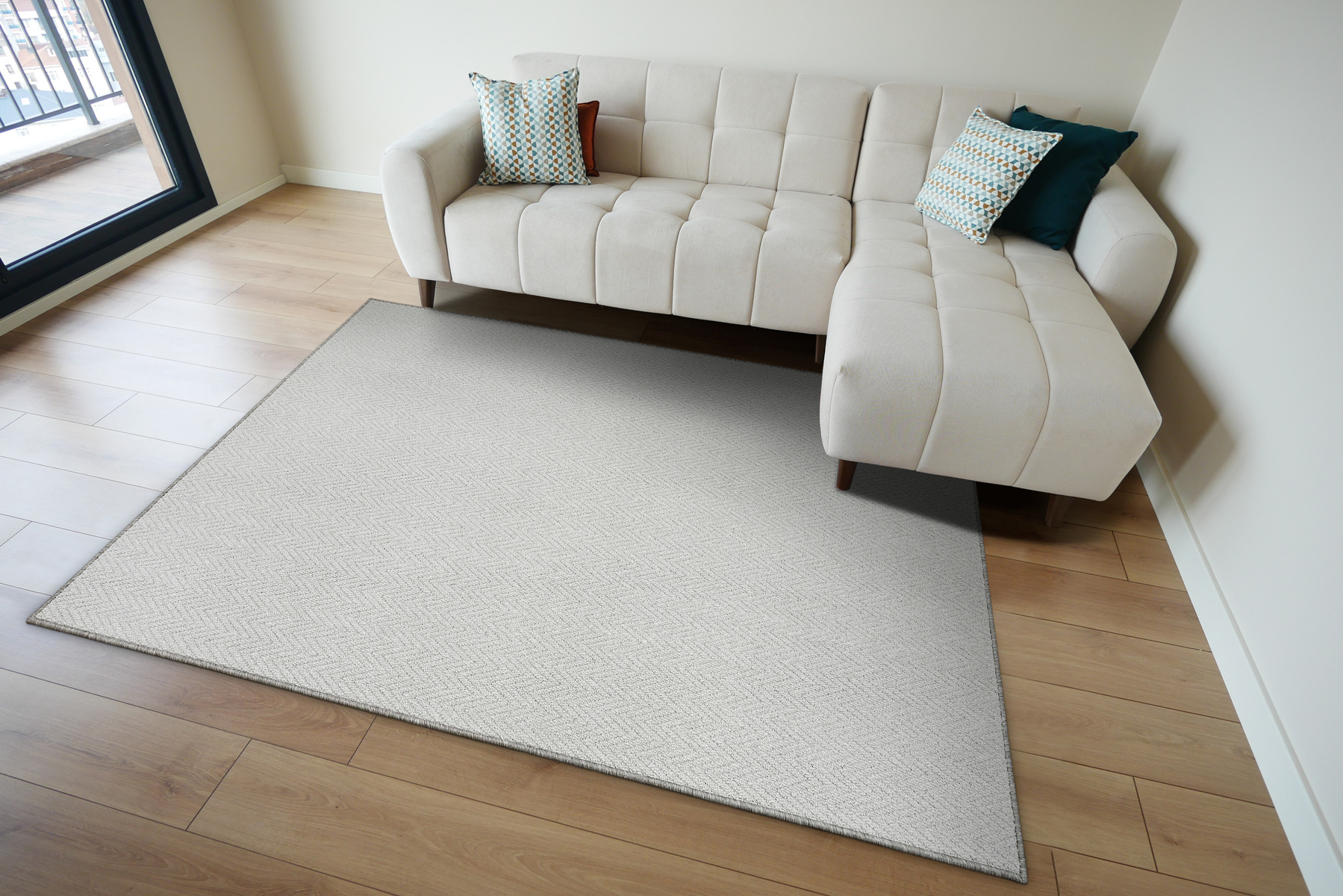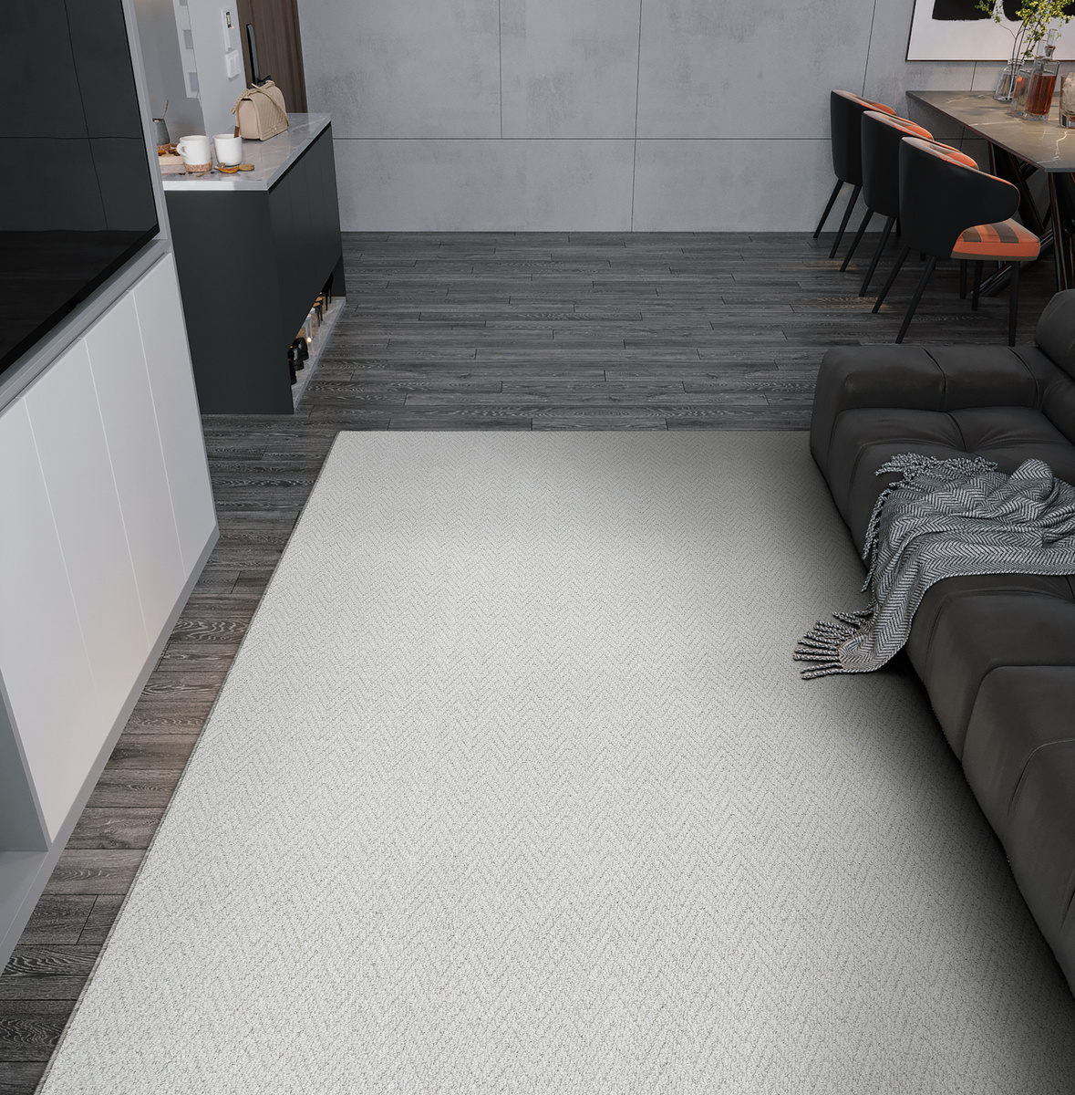 - Dywan wykonany z wykładziny pętelkowej Havanna z unikalnym, oryginalnym grubym splotem w jodełkę w odcieniu szarości ze spodem wykończonym niebieskim filcem.