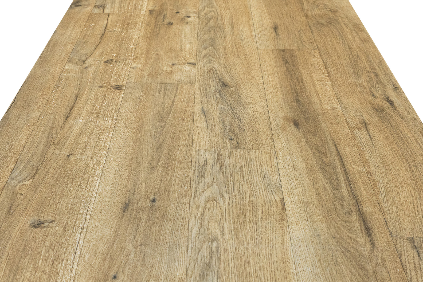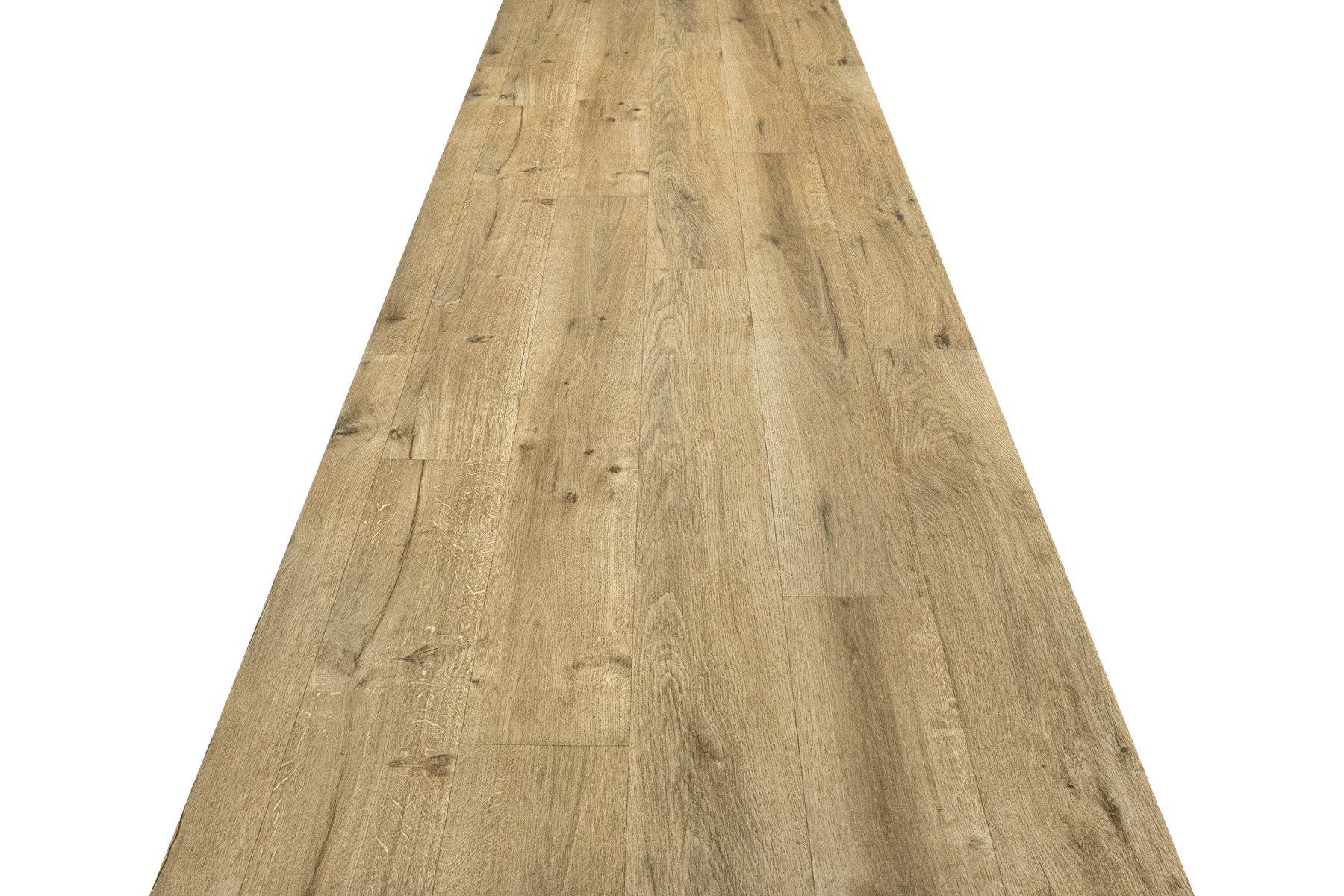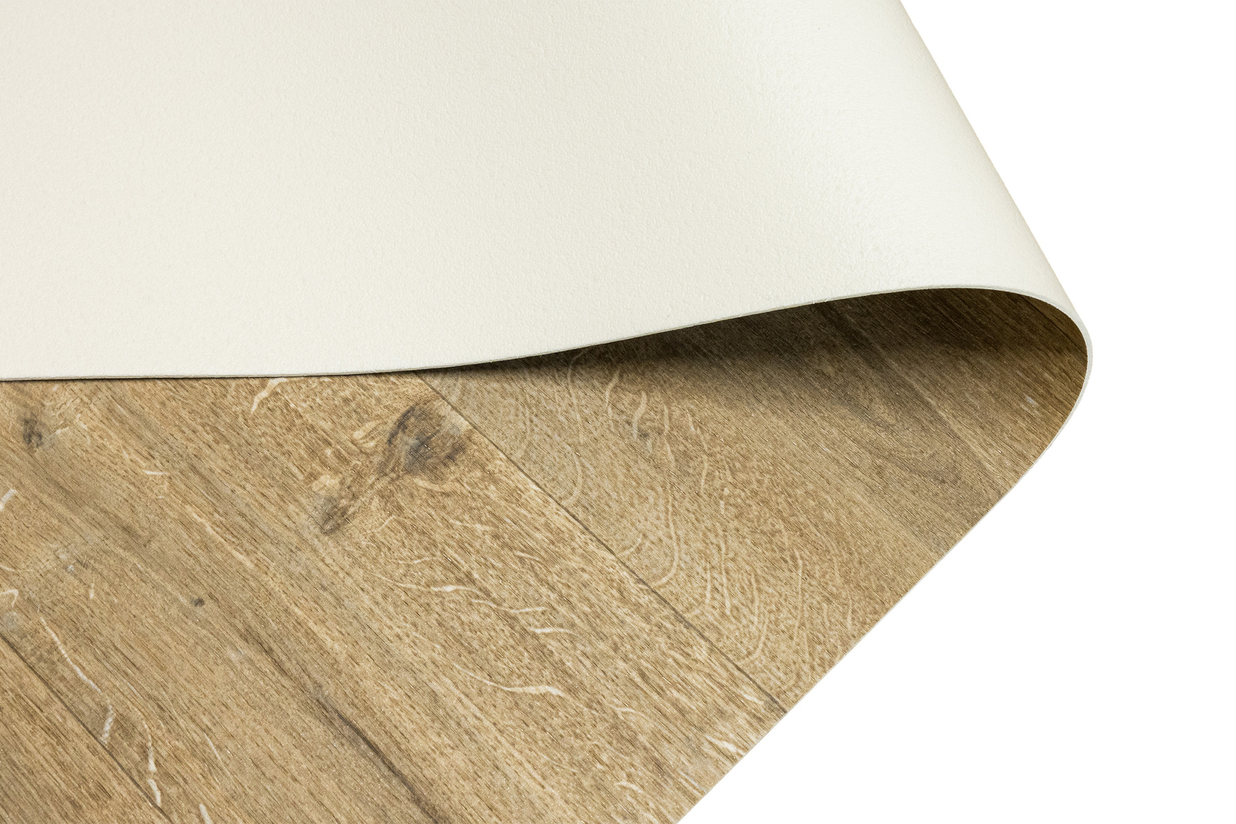 - Trwała wykładzina PCV Feelings Sweet Oak 633M ze wzorem i fakturą imitującą podłogę z desek dębowych, paneli w odcieniach beżu, brązu z akcentami szarości.