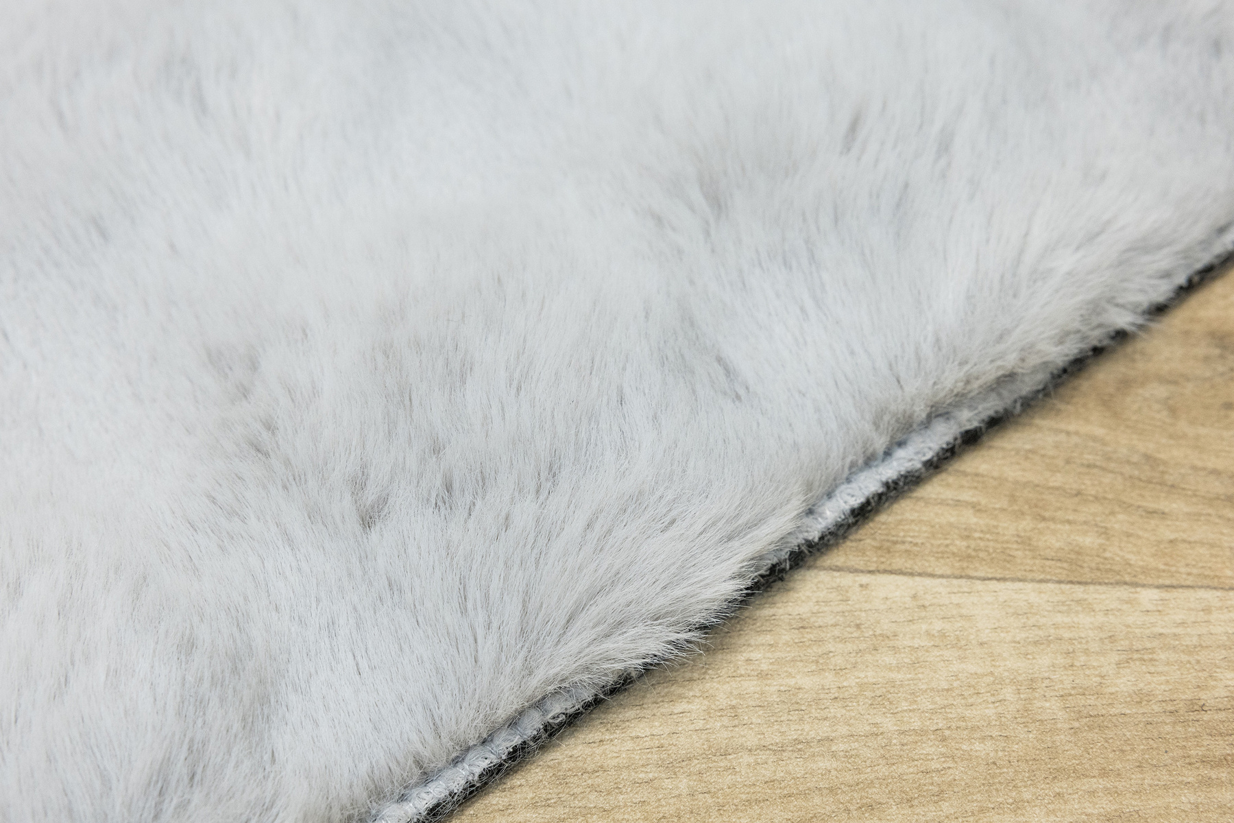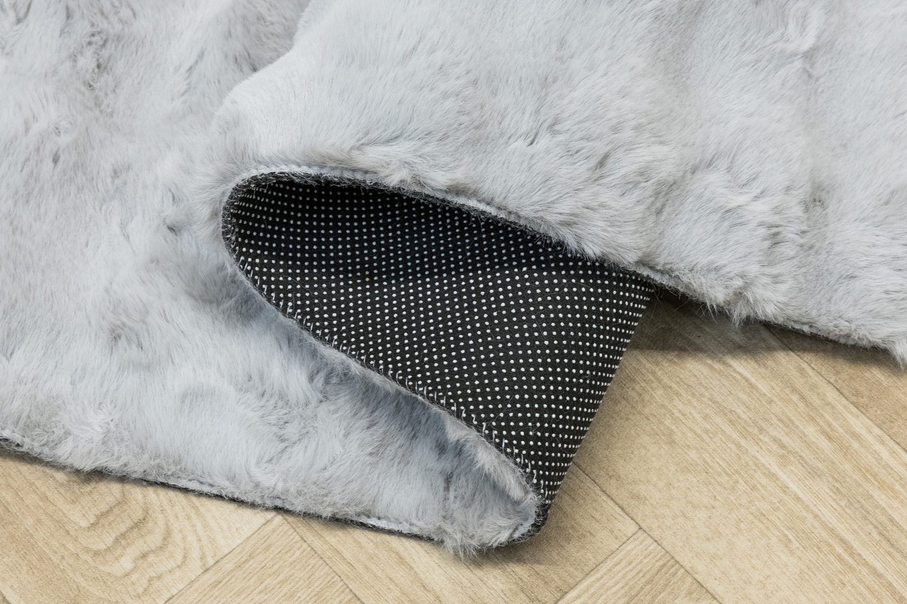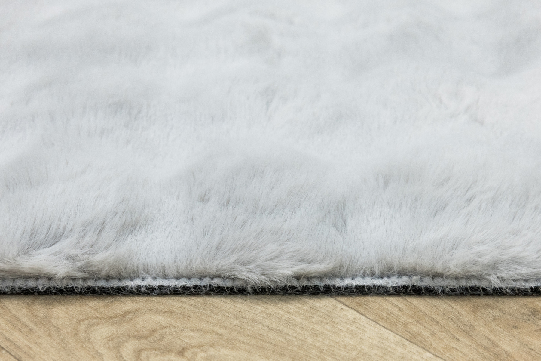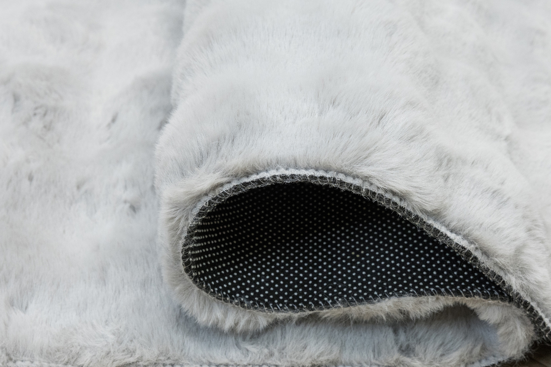 - Miękki i puszysty dywan Oslo z jasnym szarym runem przypominającym w dotyku królicze futerko z geometrycznym dwupoziomowym runem i nakrapianym antypoślizgowym spodem.