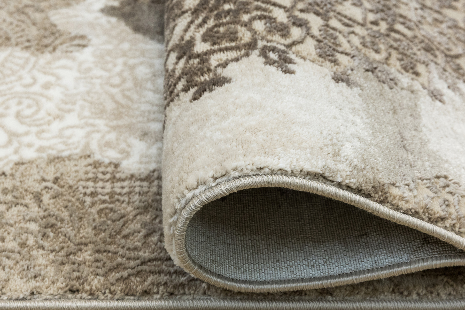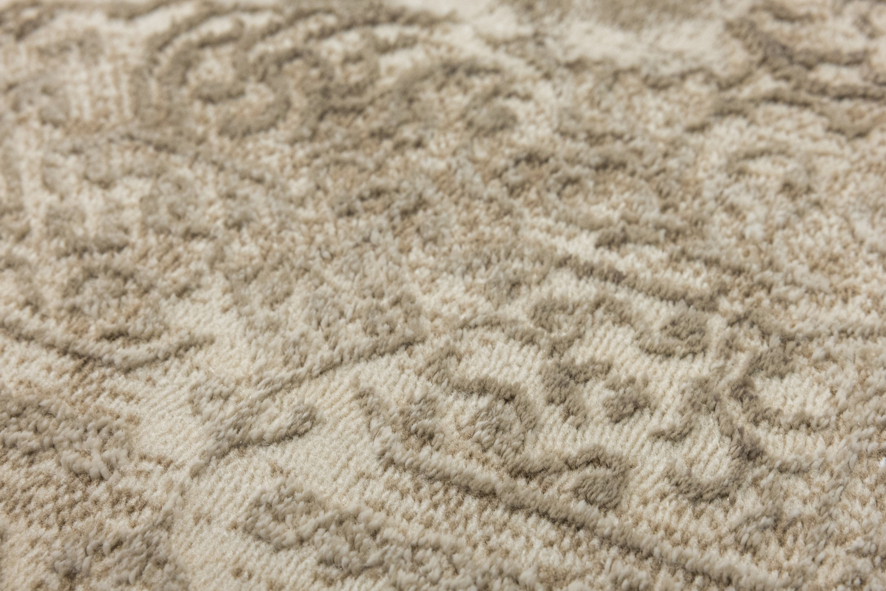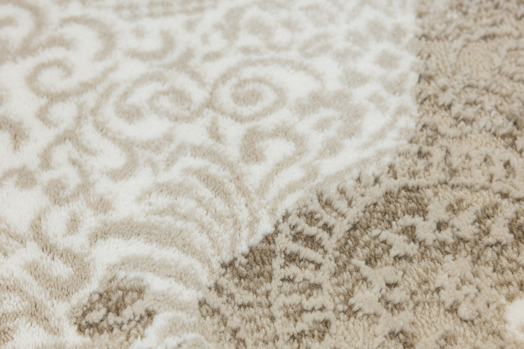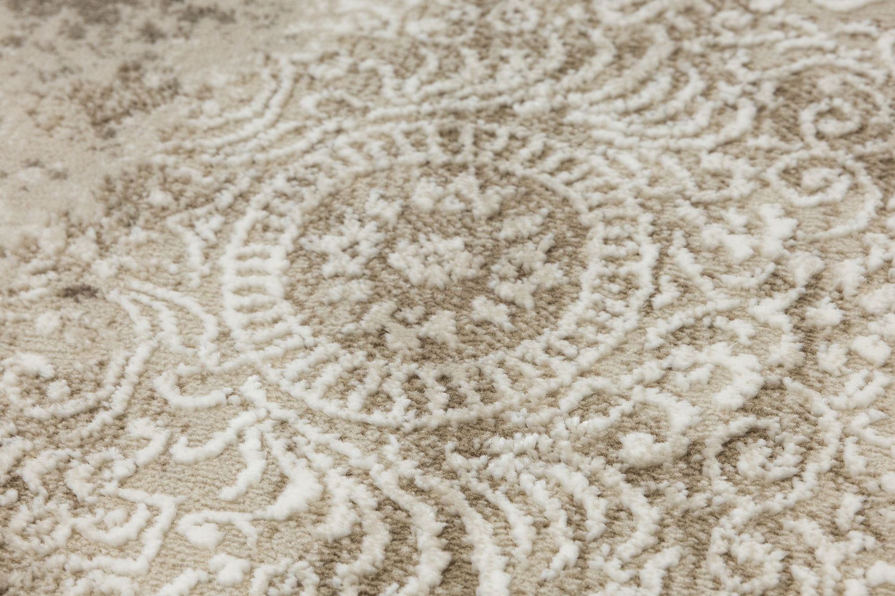 - Miękki dywan Galya z ornamentowym wzorem w stylu boutique, z dwupoziomowym mięciutkim runem w odcieniach beżu i kremu oraz spodem wykończonym jutą.