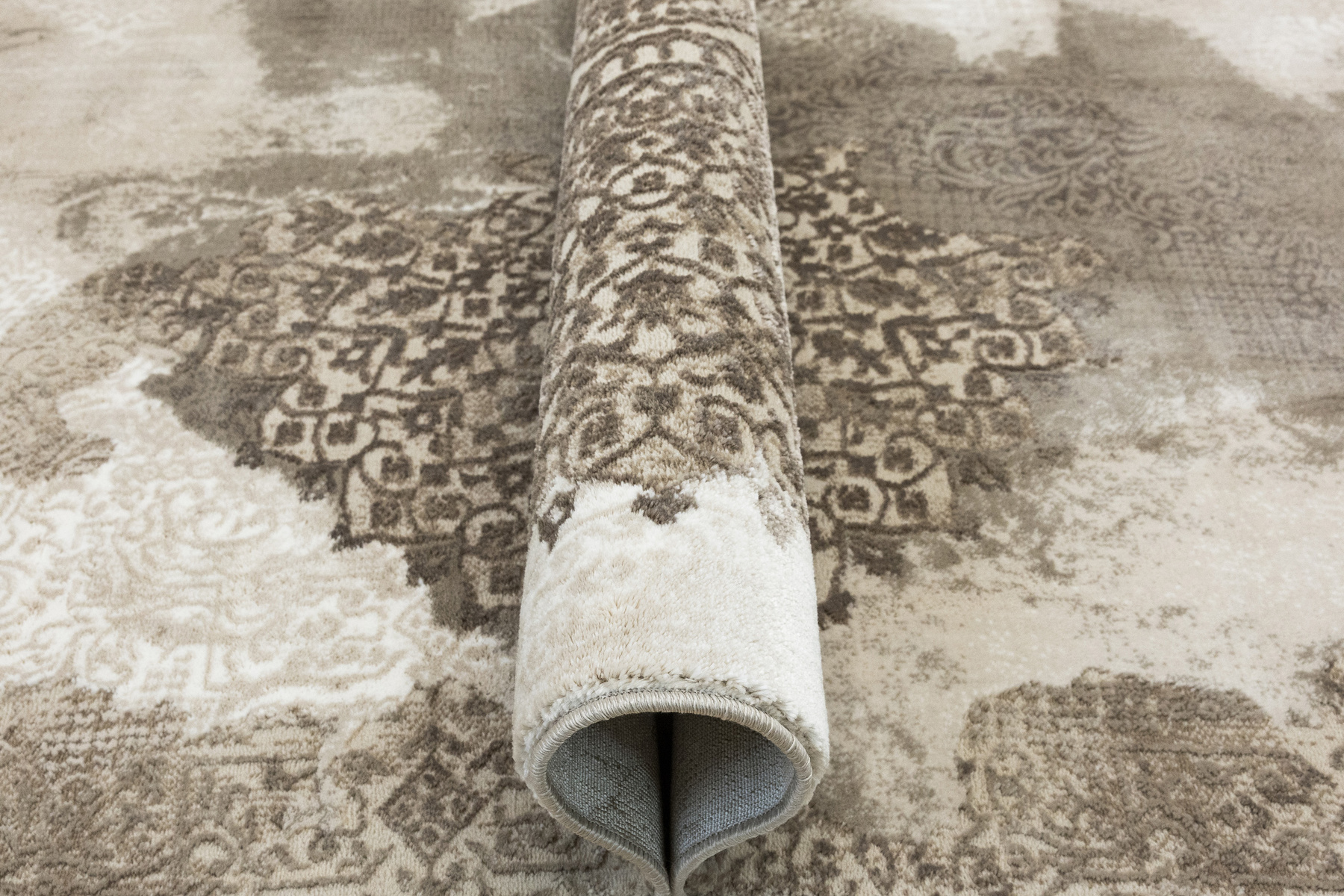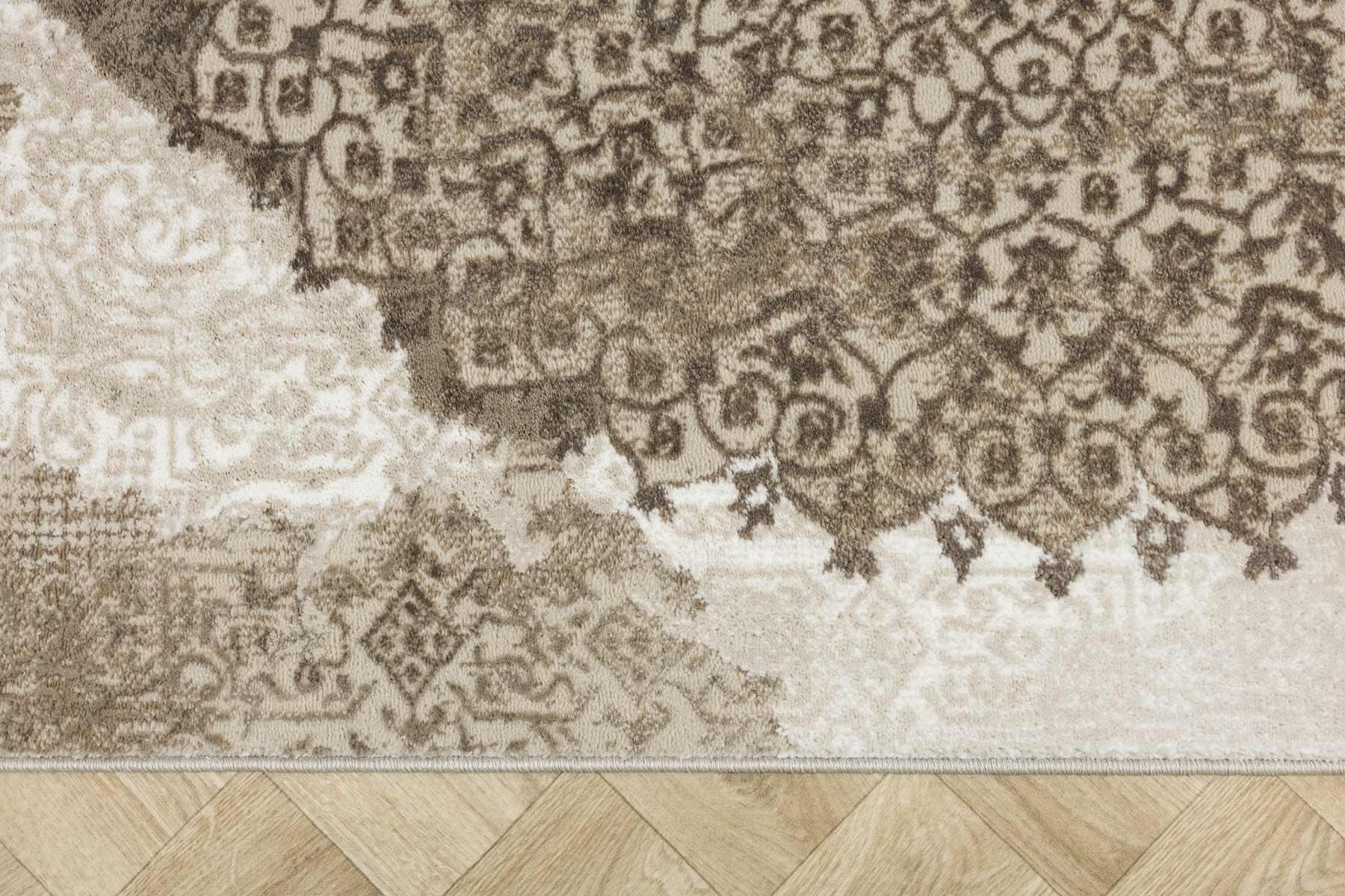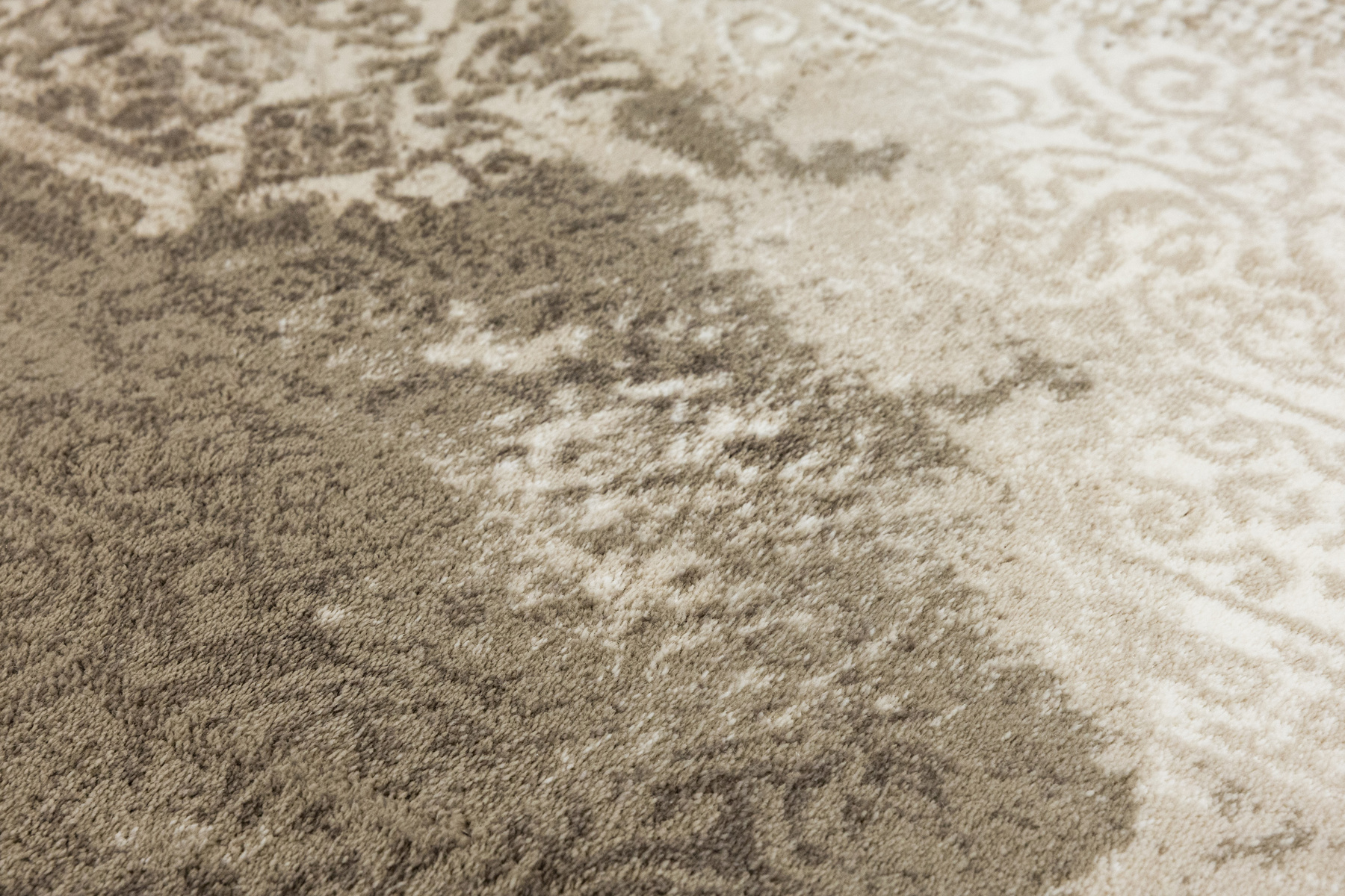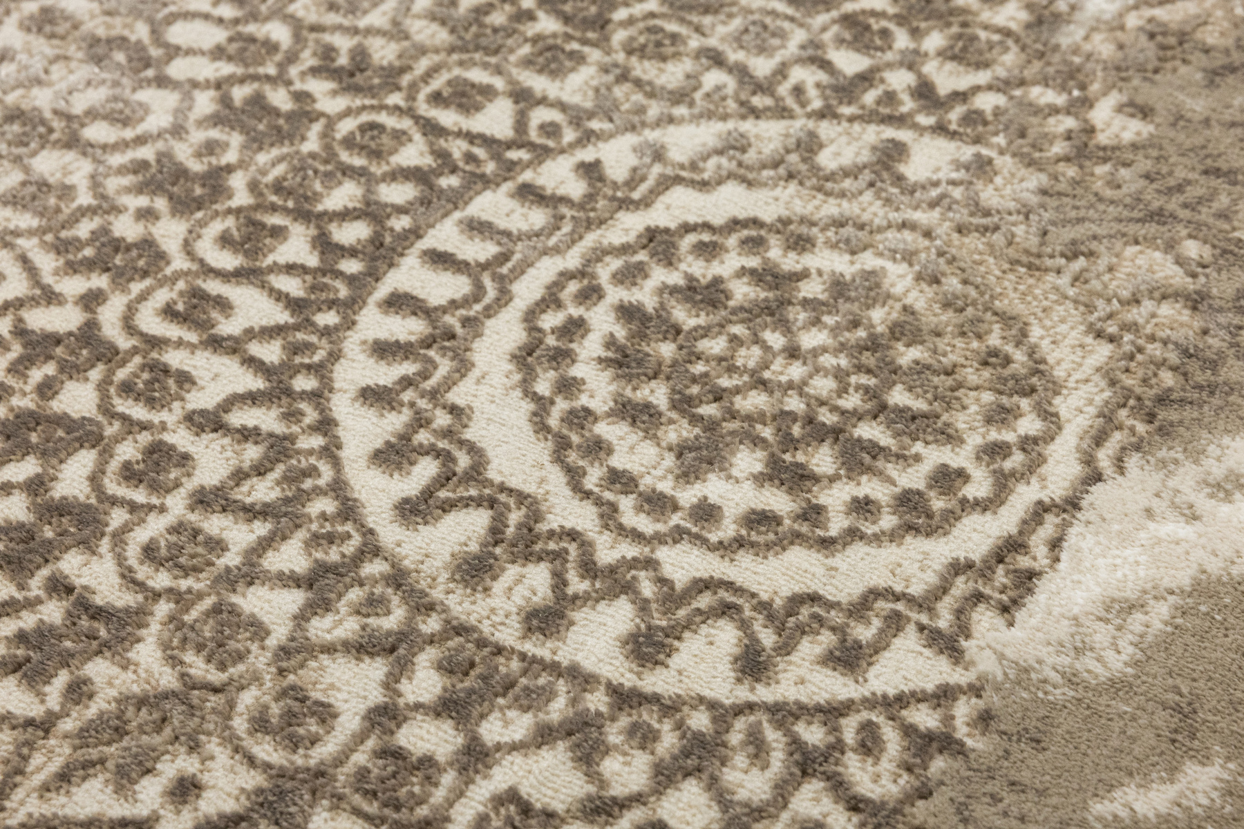 - Miękki dywan Galya z ornamentowym wzorem w stylu boutique, z dwupoziomowym mięciutkim runem w odcieniach beżu i kremu oraz spodem wykończonym jutą.