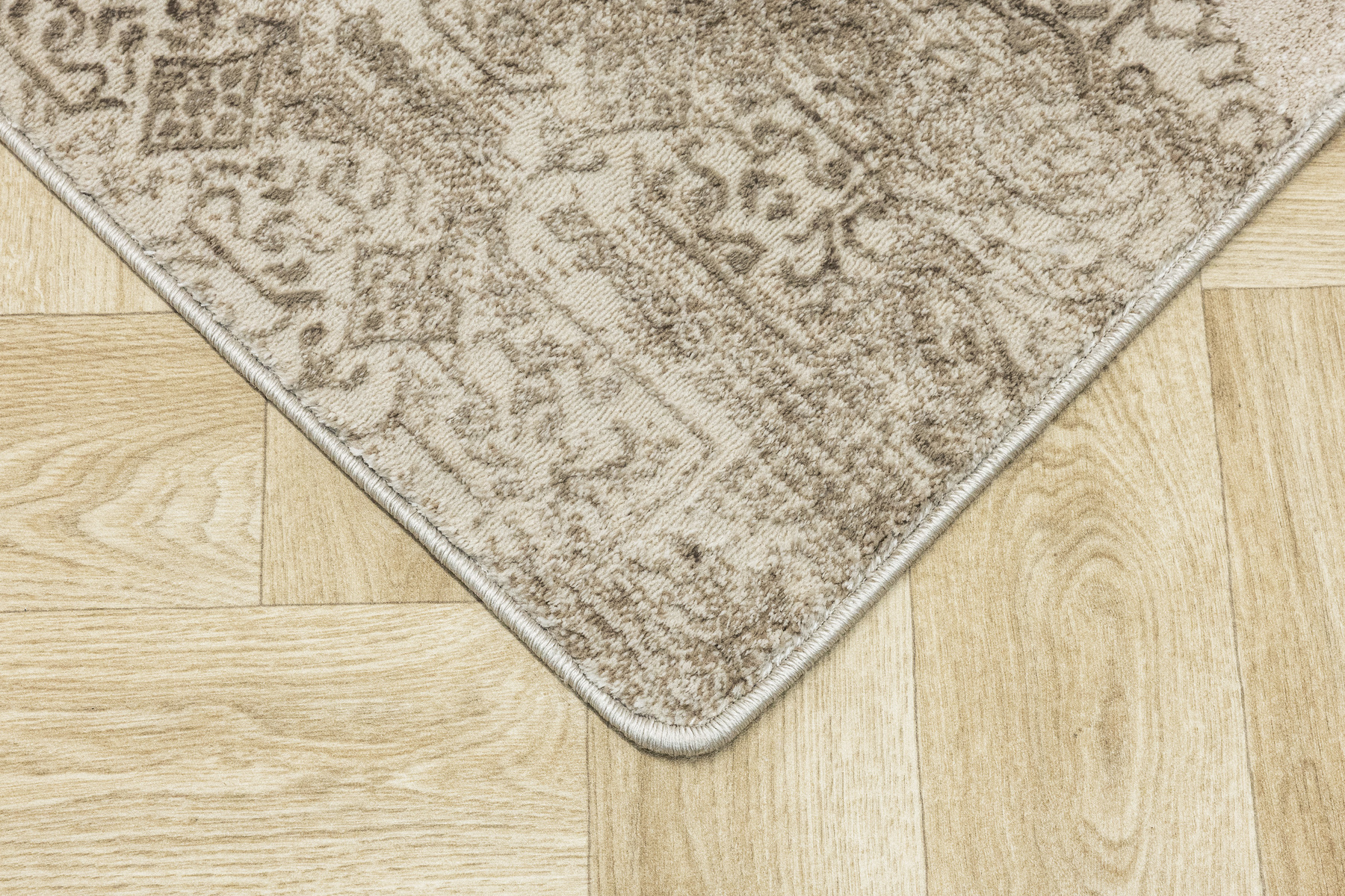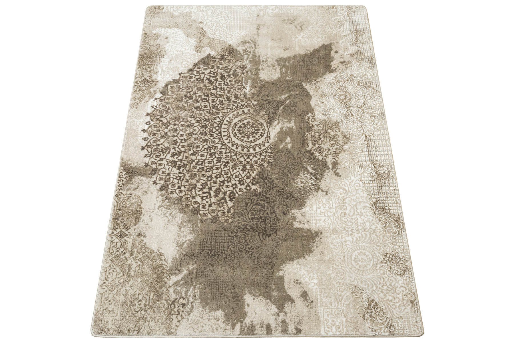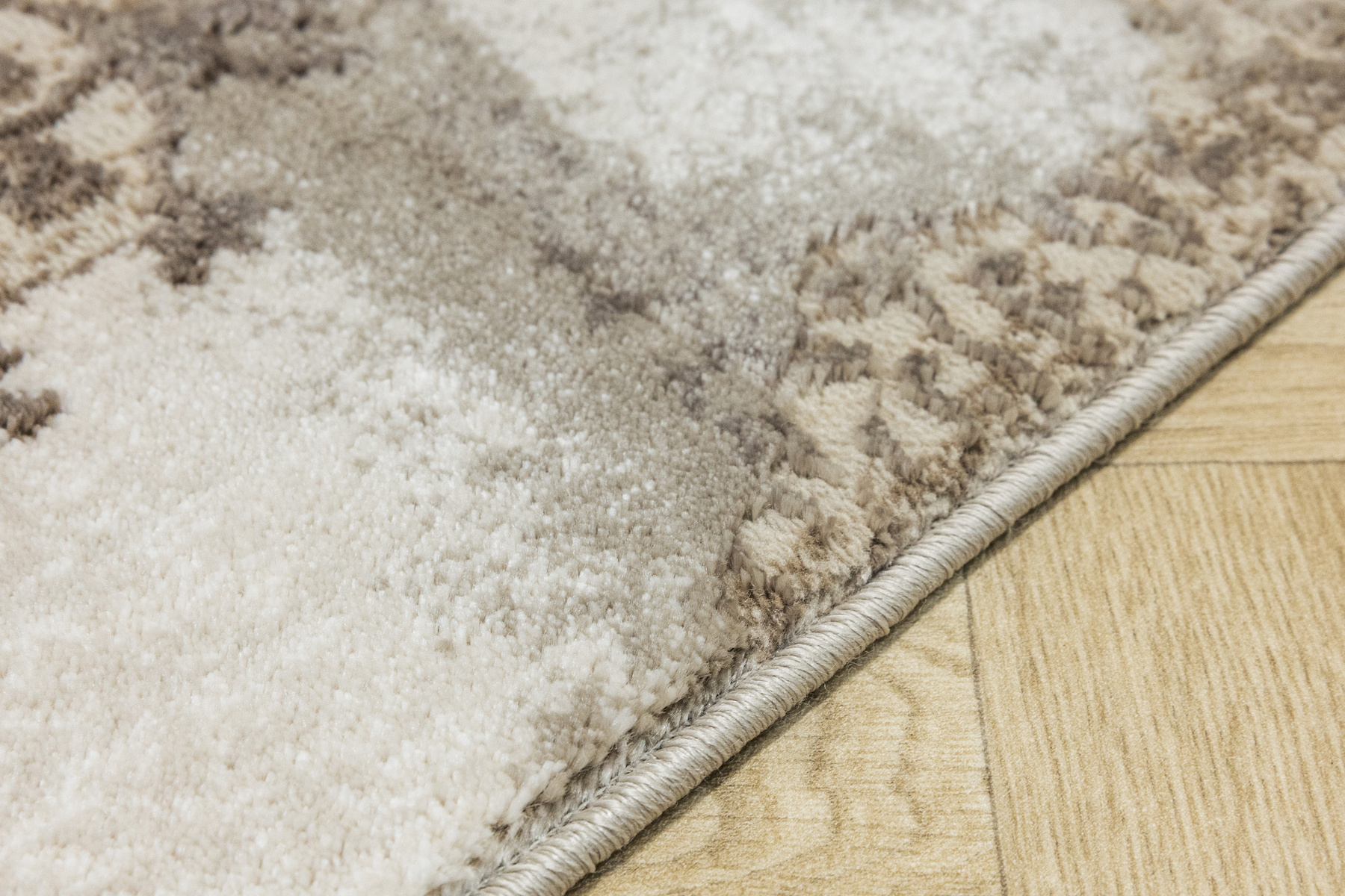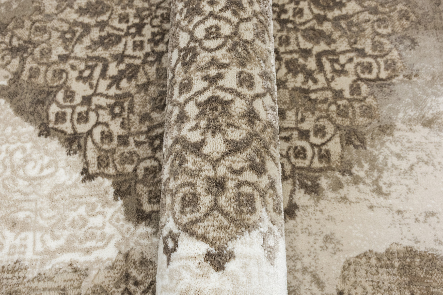 - Miękki dywan Galya z ornamentowym wzorem w stylu boutique, z dwupoziomowym mięciutkim runem w odcieniach beżu i kremu oraz spodem wykończonym jutą.