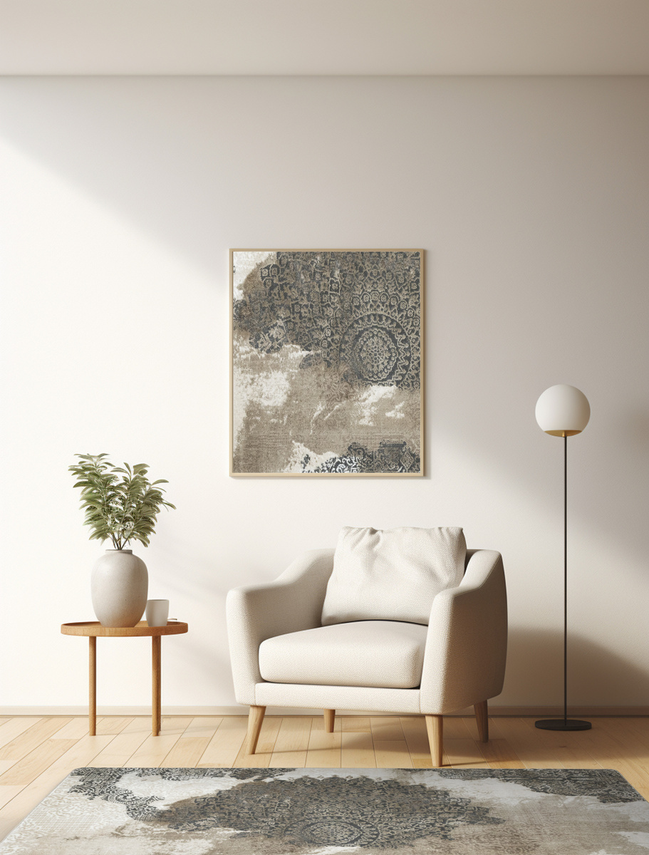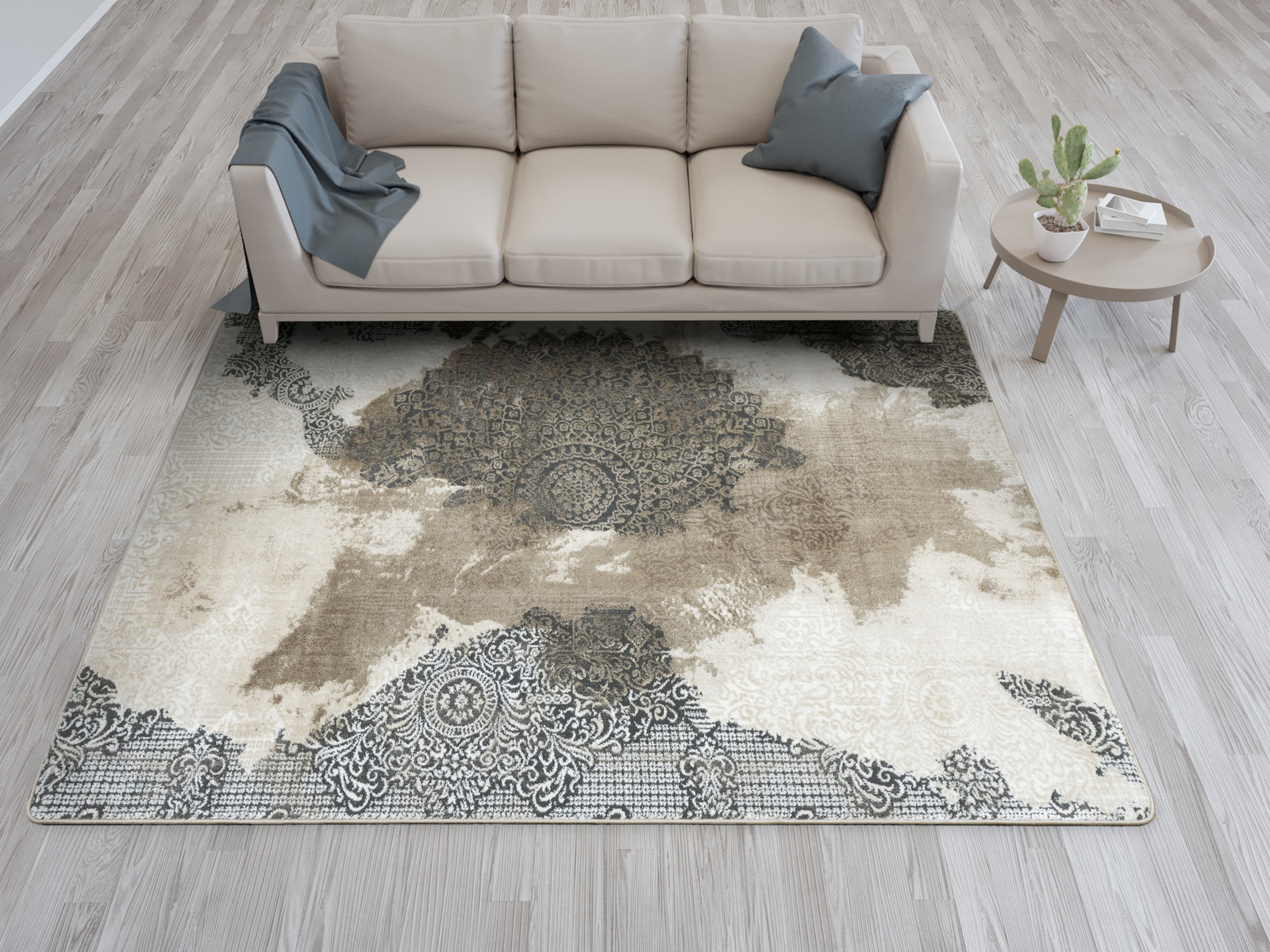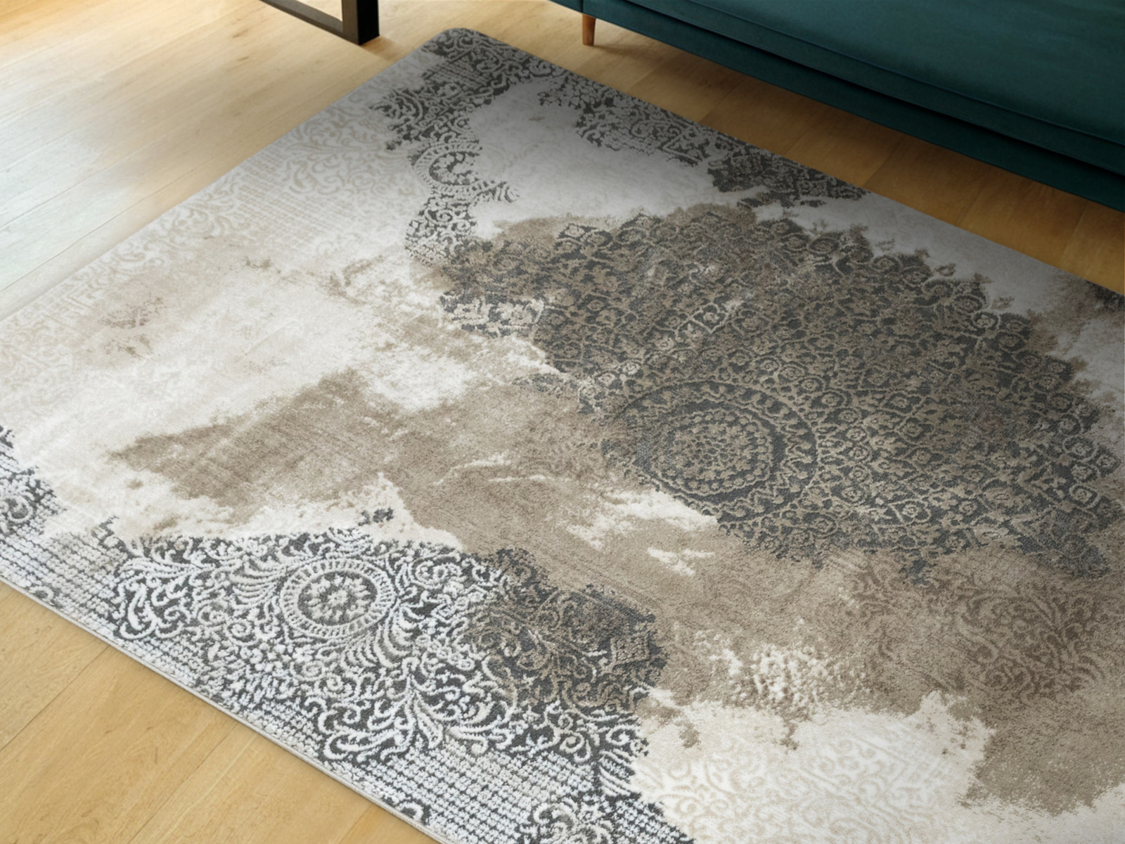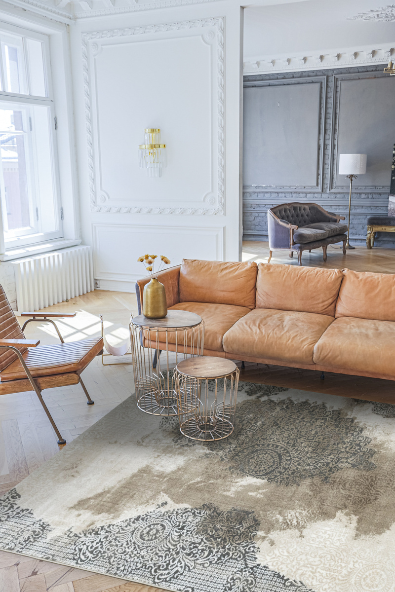 - Miękki dywan Galya z ornamentowym wzorem w stylu boutique, z dwupoziomowym mięciutkim runem w odcieniach beżu, kremu i szarości oraz spodem wykończonym jutą.