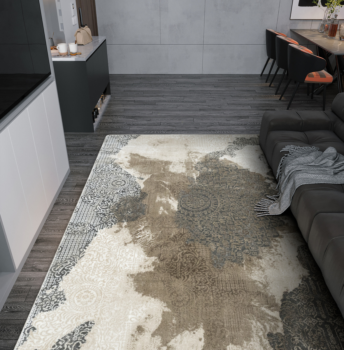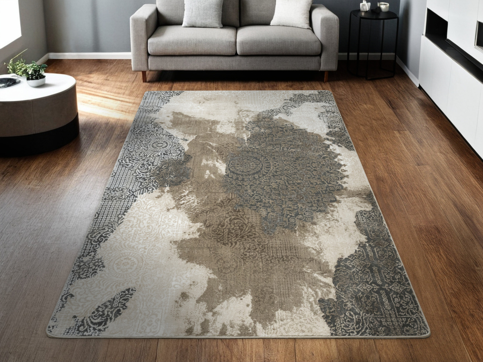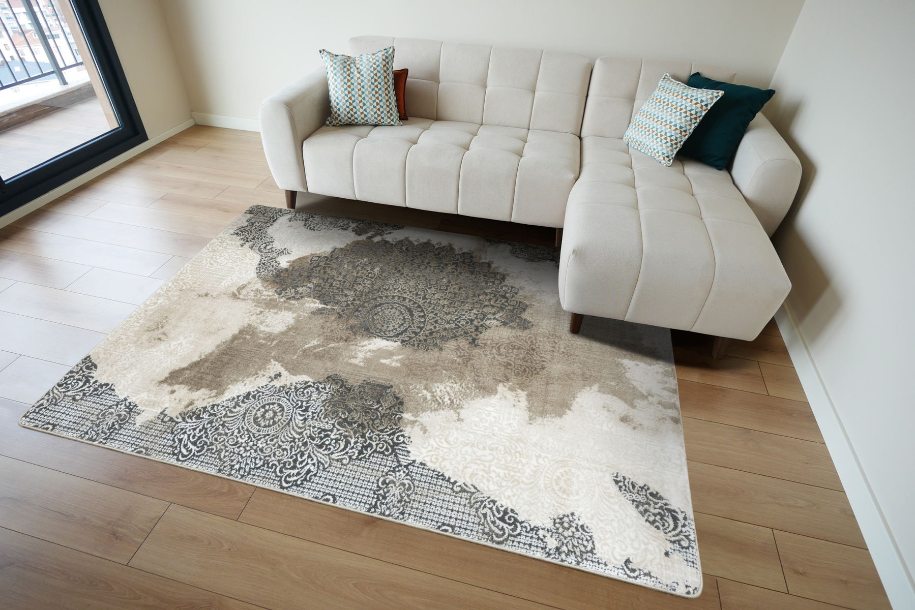 - Miękki dywan Galya z ornamentowym wzorem w stylu boutique, z dwupoziomowym mięciutkim runem w odcieniach beżu, kremu i szarości oraz spodem wykończonym jutą.