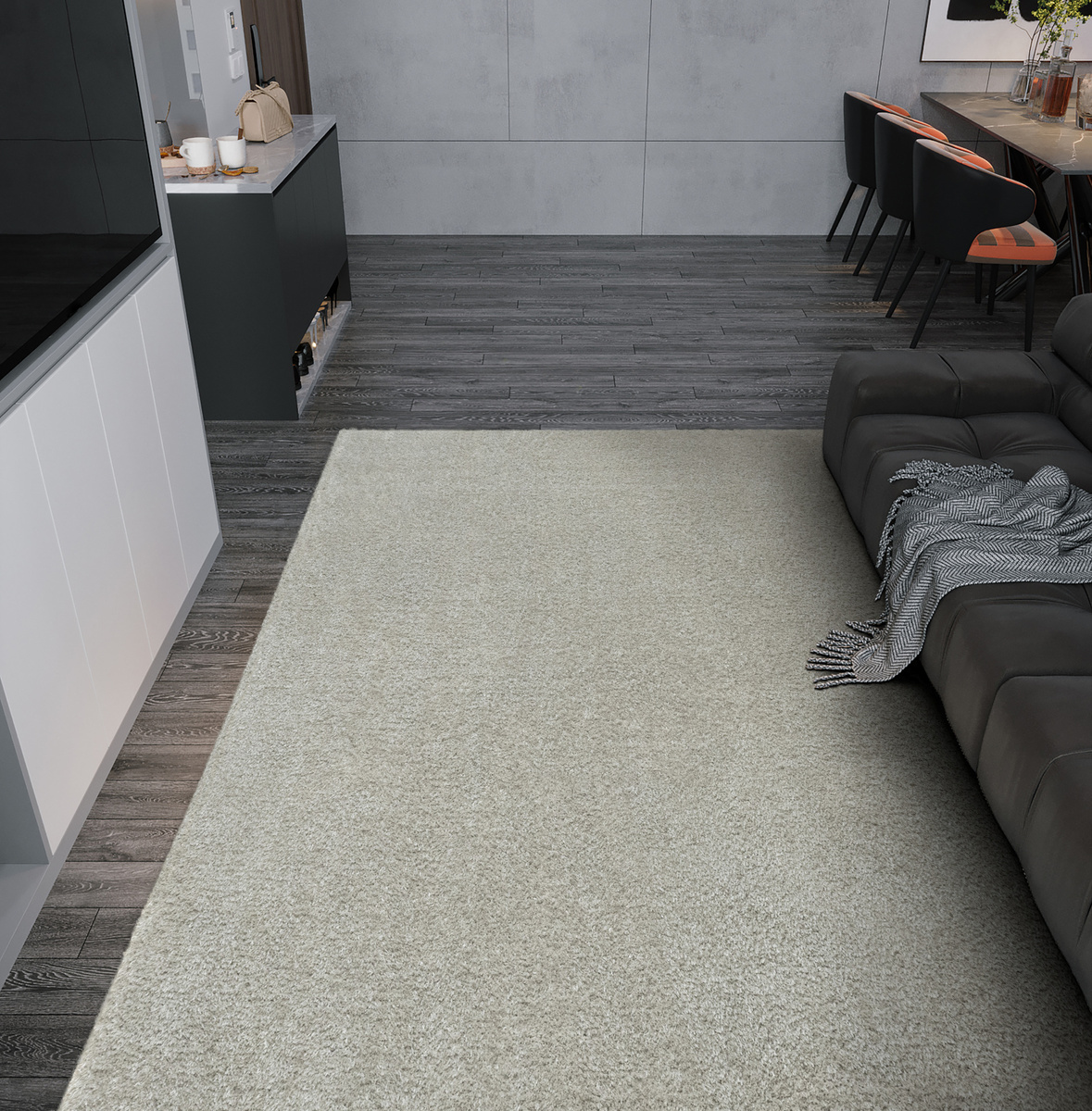 • Luksusowa wykładzina Silky o podwyższonej wytrzymałości, gęstym, grubym lśniącym runie stypu shaggy w odcieniu srebrzystej szarości i spodem wykończonym połączeniem juty i filcu.