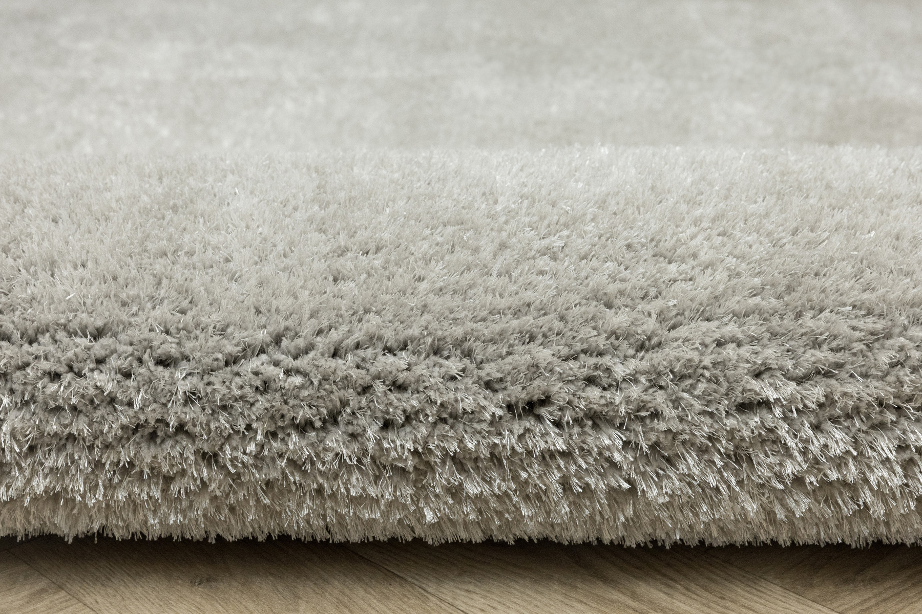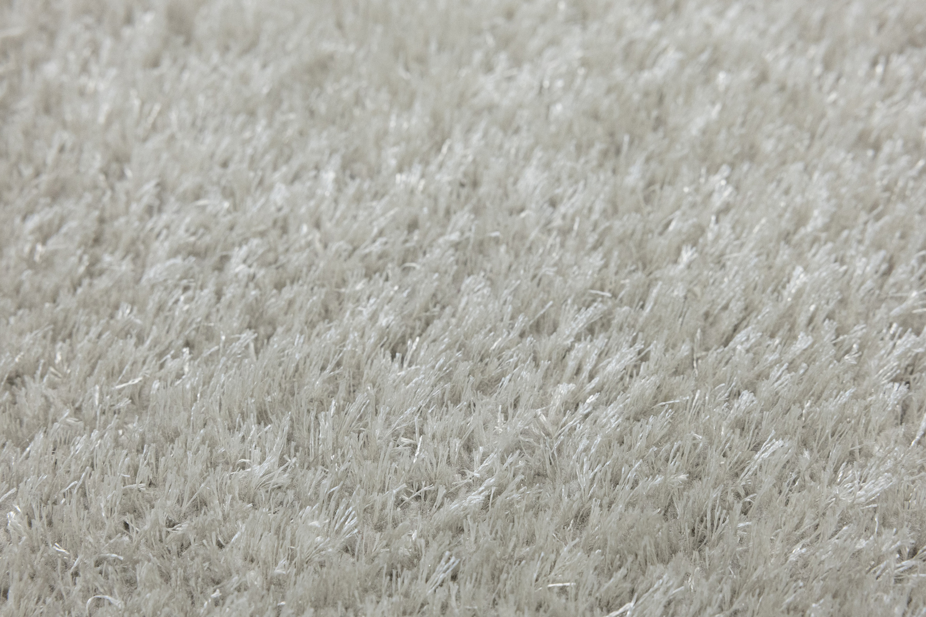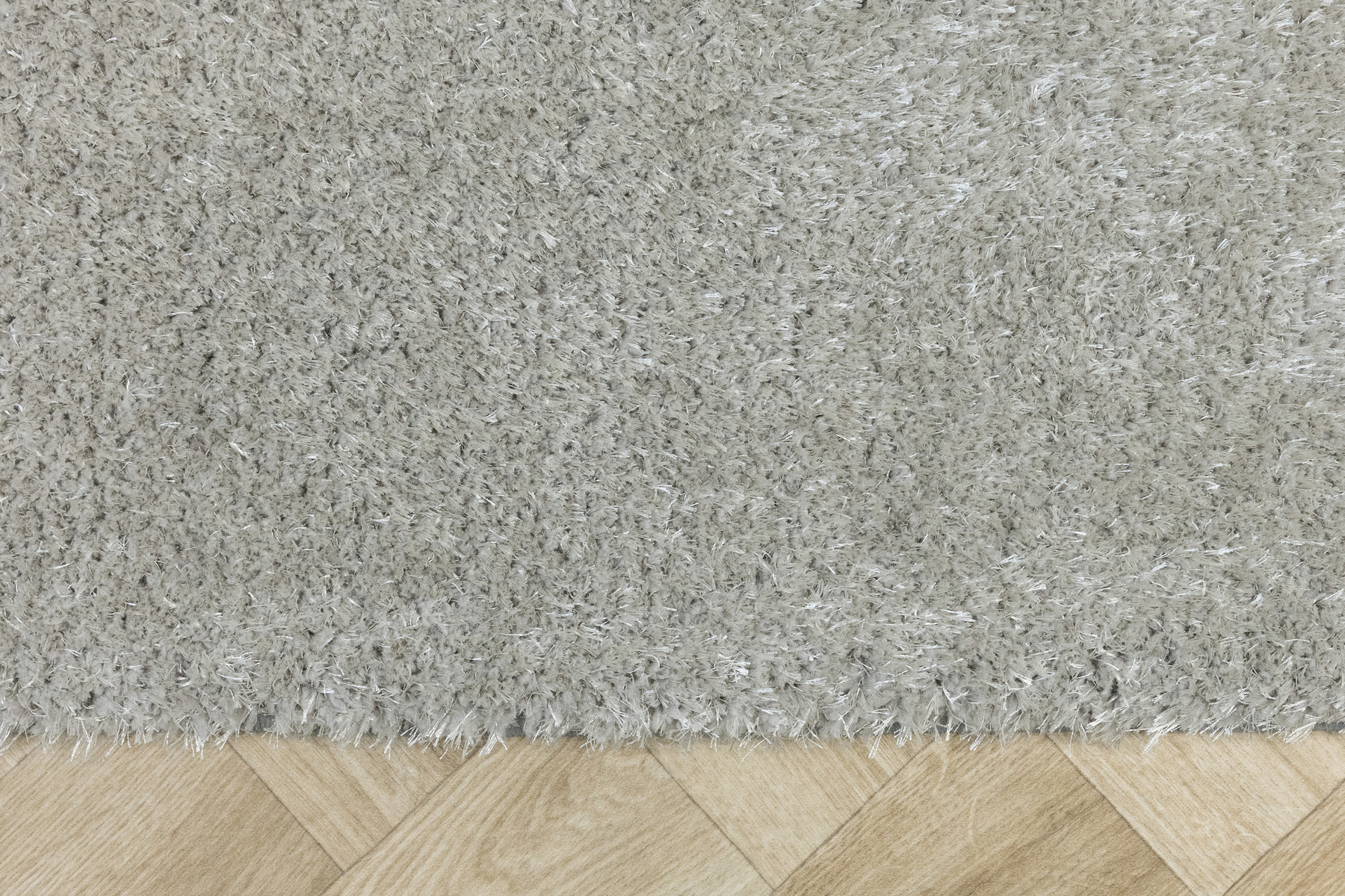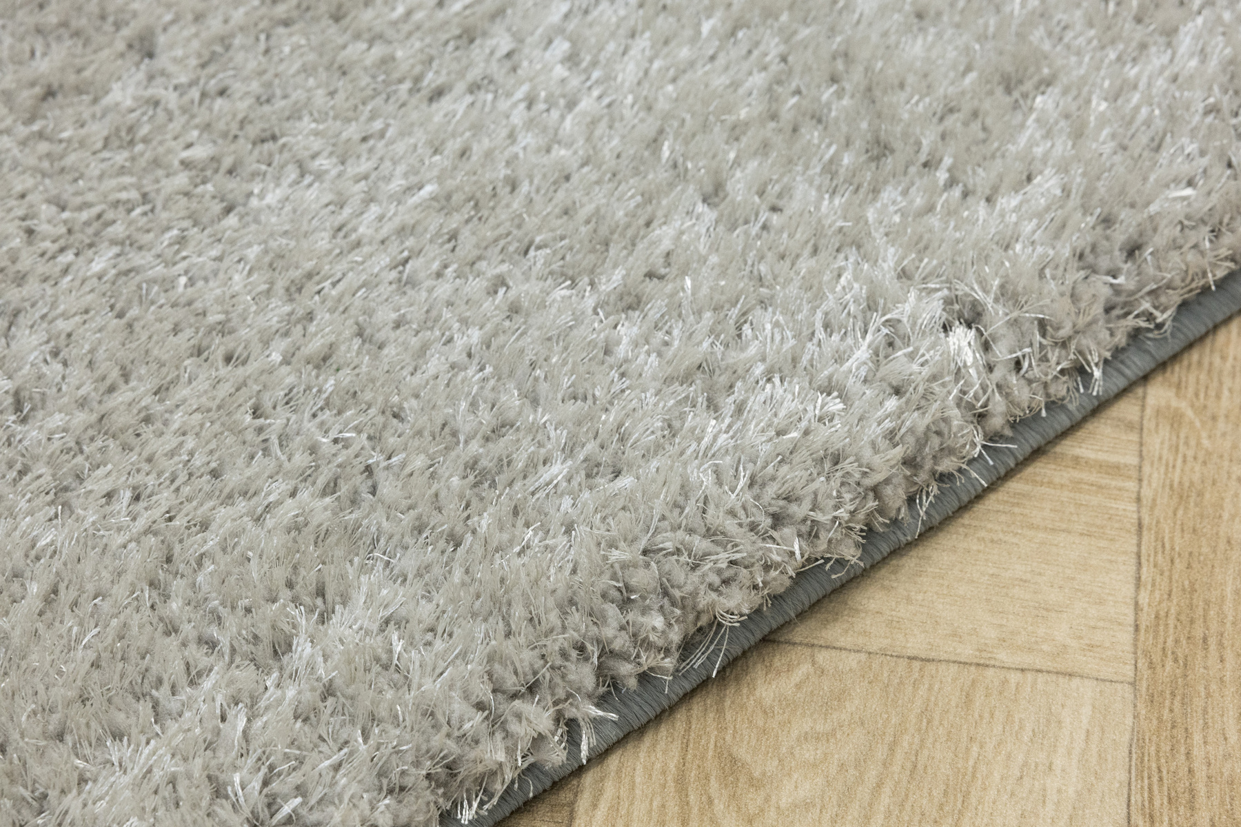 - Luksusowy dywan z wykładziny Silky o podwyższonej wytrzymałości, gęstym, grubym lśniącym runie stypu shaggy w odcieniu srebrzystej szarości i spodem wykończonym połączeniem juty i filcu.