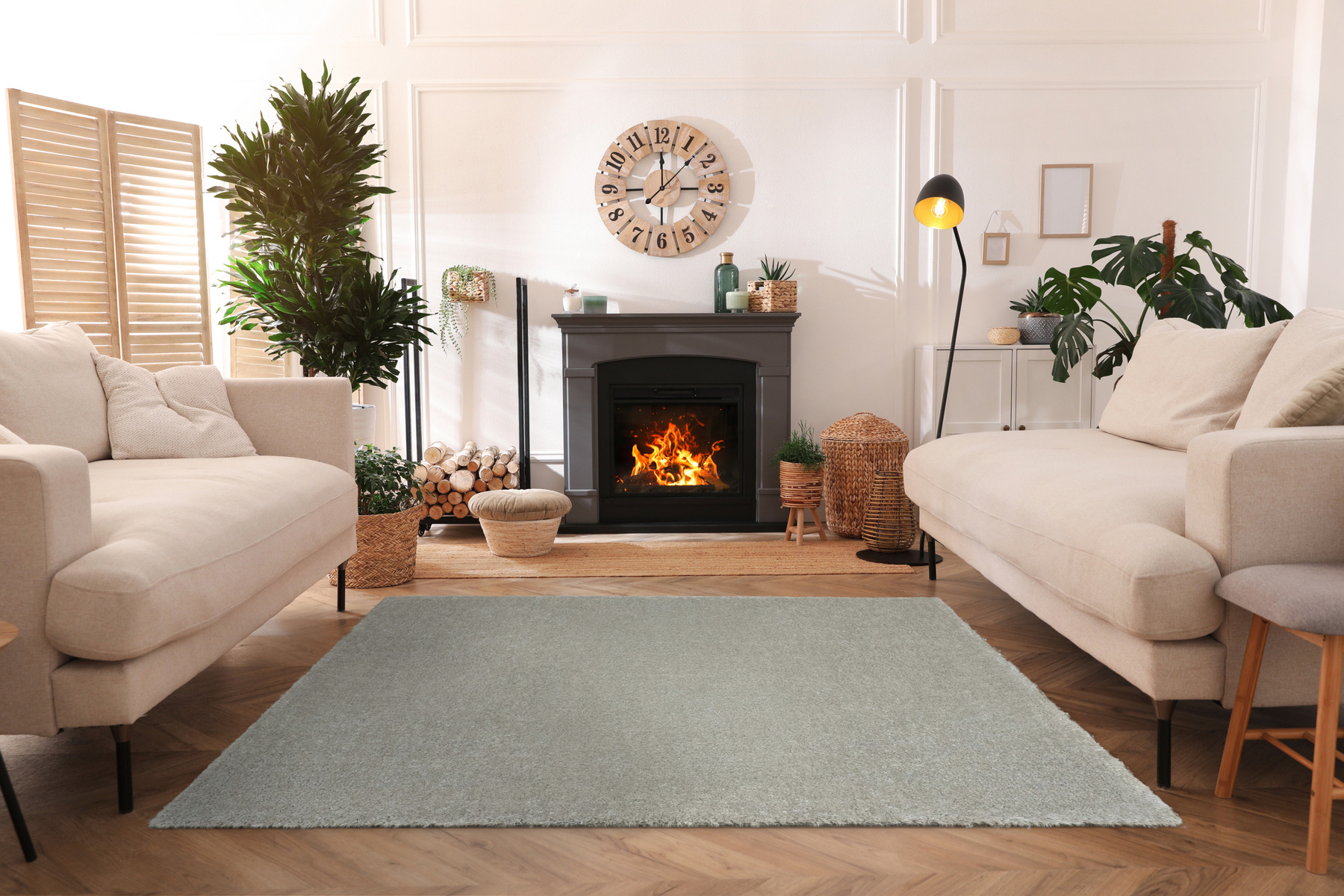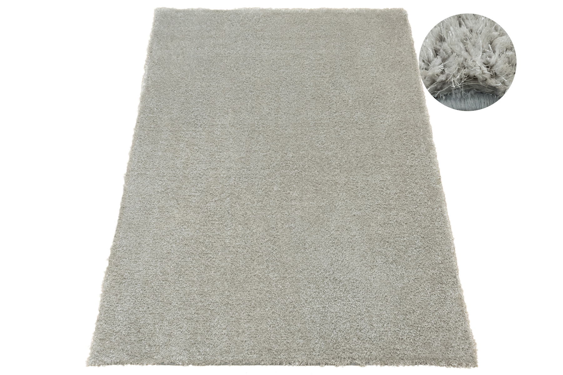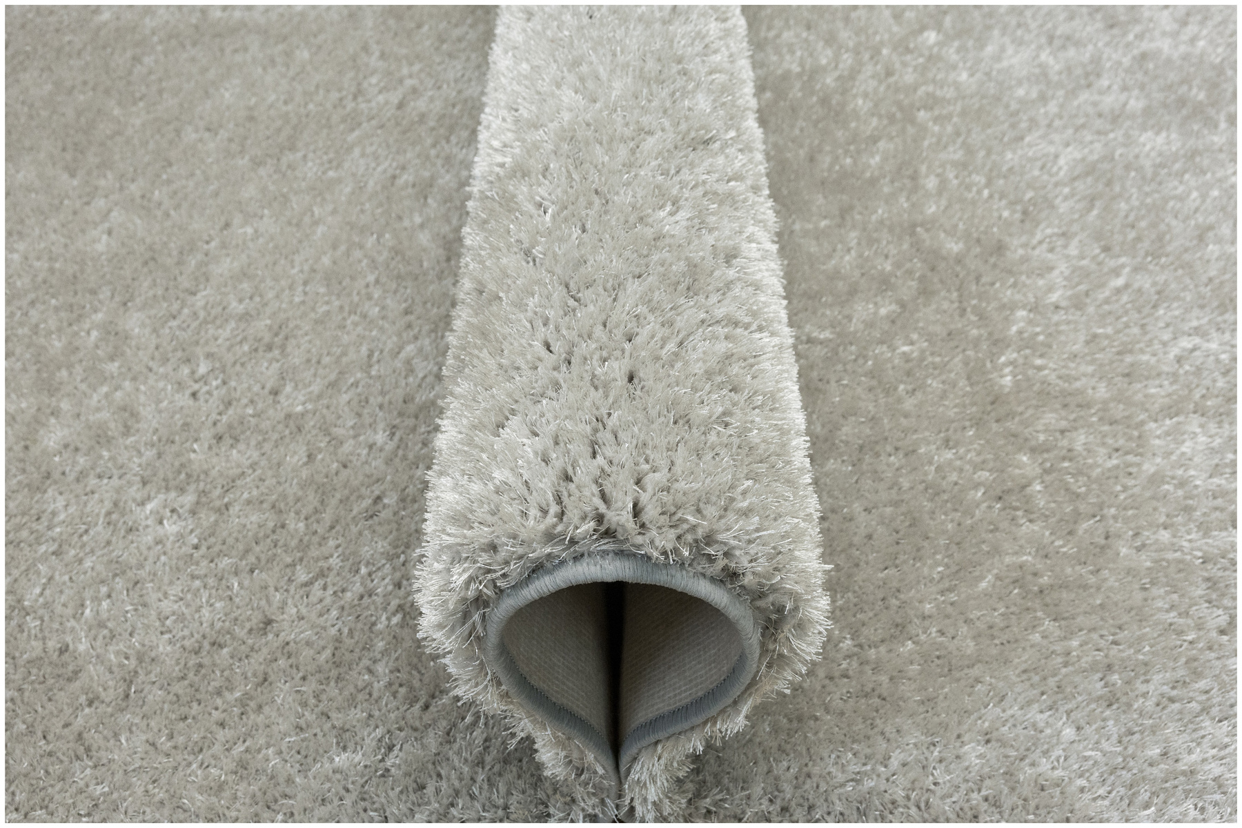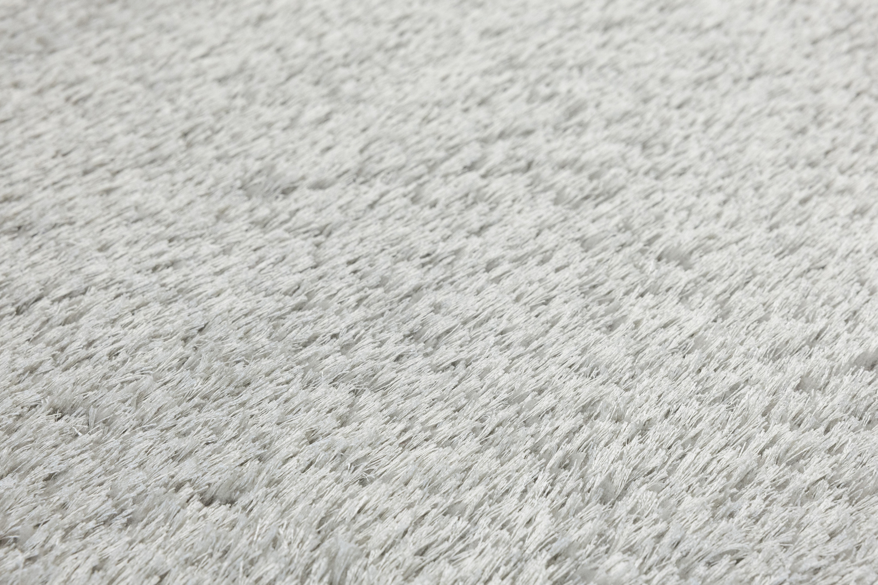 - Luksusowy dywan z wykładziny Silky o podwyższonej wytrzymałości, gęstym, grubym lśniącym runie stypu shaggy w odcieniu srebrzystej szarości i spodem wykończonym połączeniem juty i filcu.