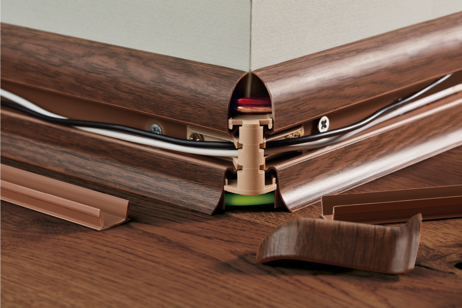 - Umieść okablowanie w kanale listwy. Włóż zaślepkę z przodu listwy, dociśnij, aż się zatrzaśnie.