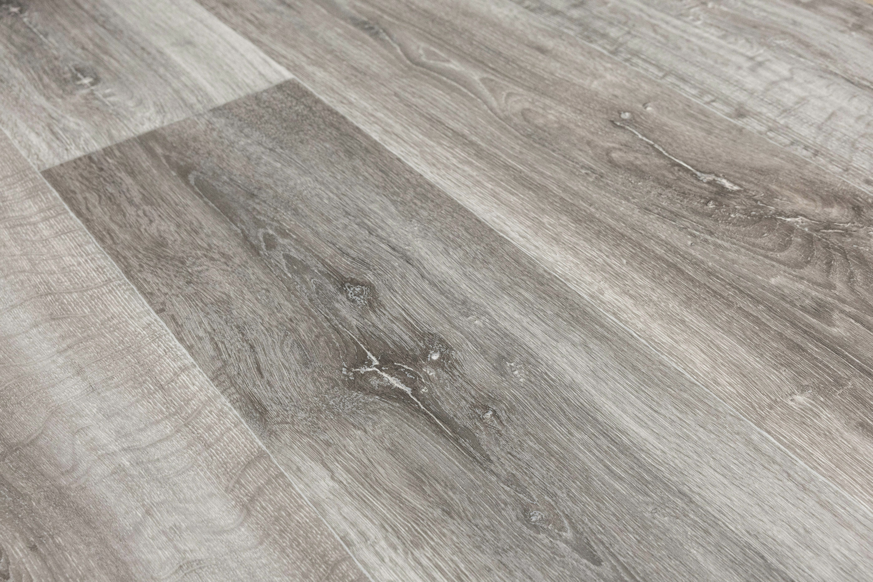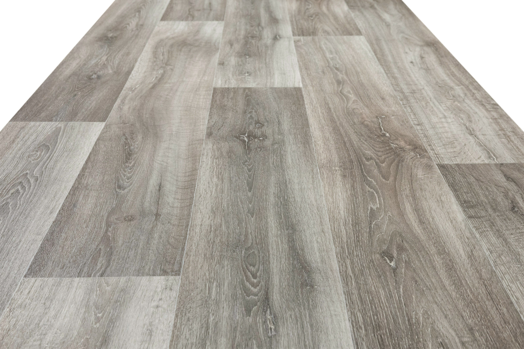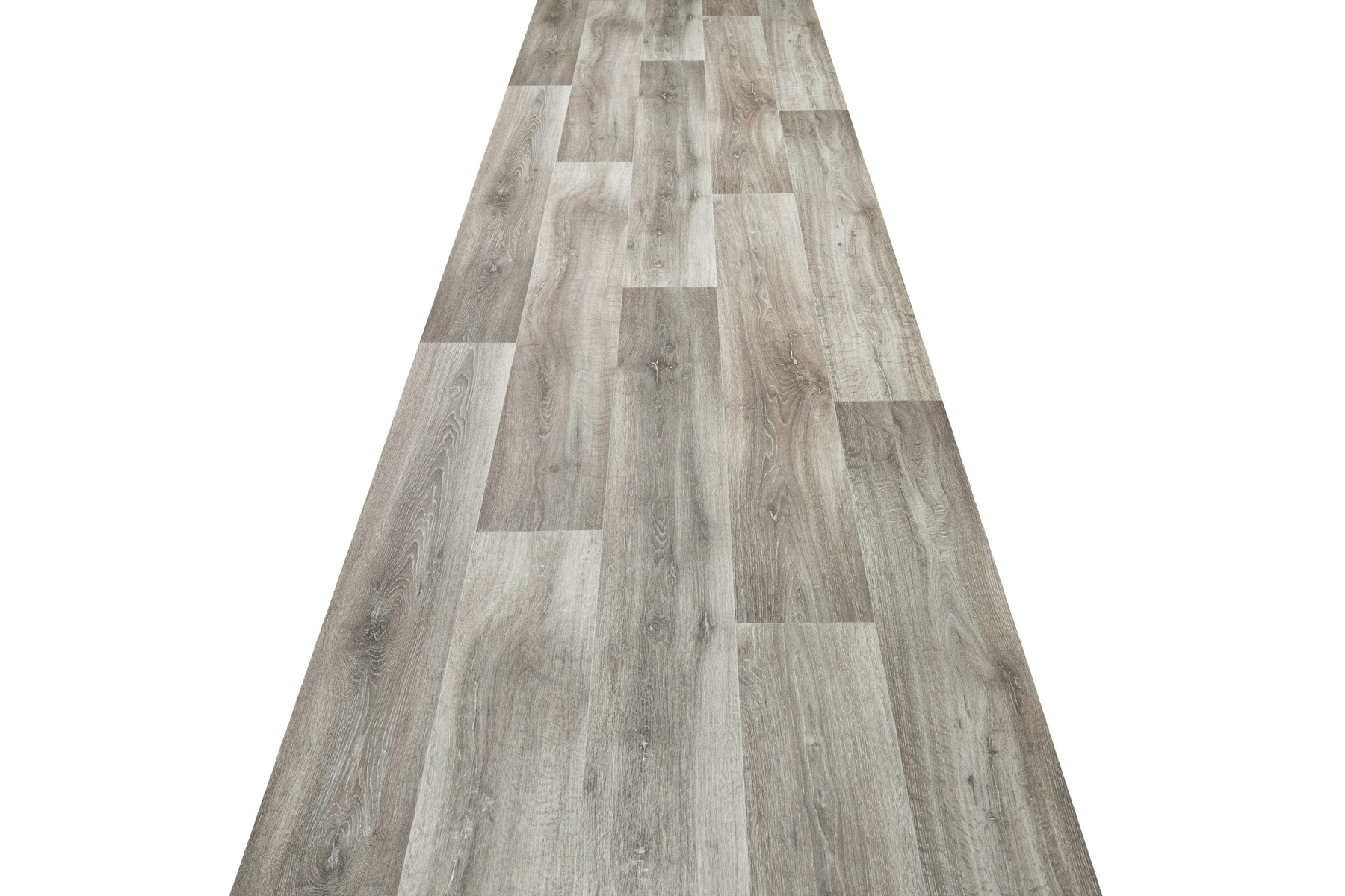 - Elastyczna wykładzina PCV Tex-Style Lime Oak o podwyższonej wytrzymałości ze wzorem imitującym podłogę z desek w odcieniach szarości, kremu i beżu oraz spodem wykończonym filcem.