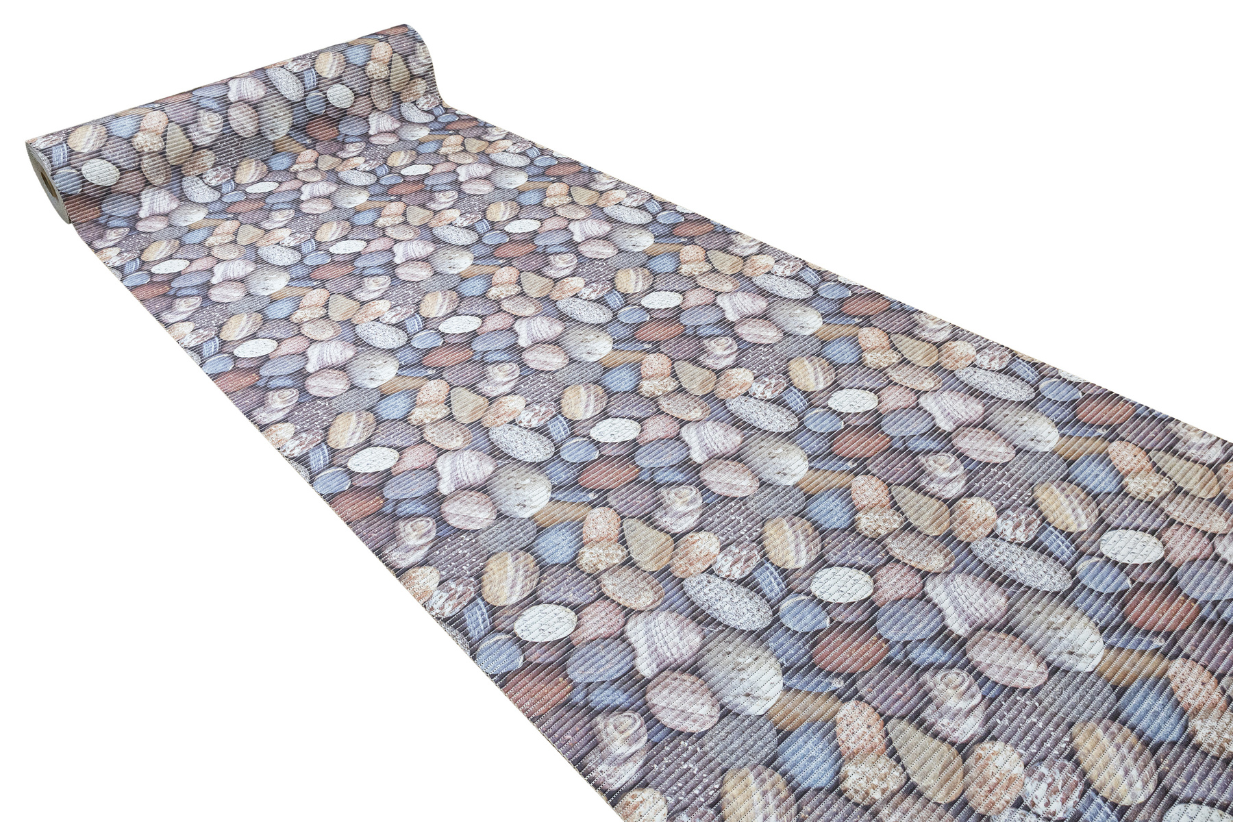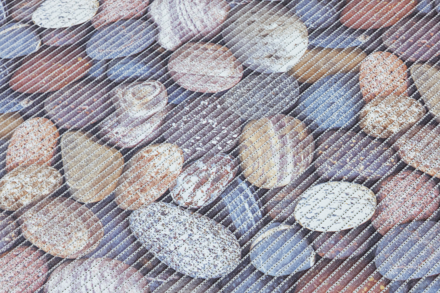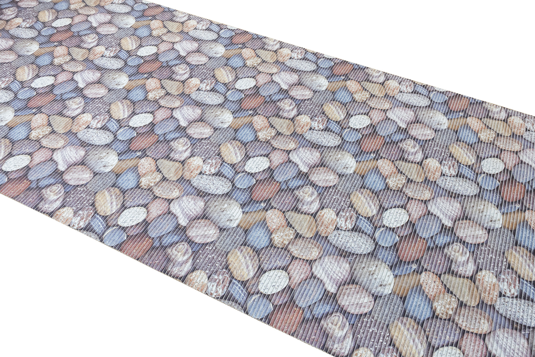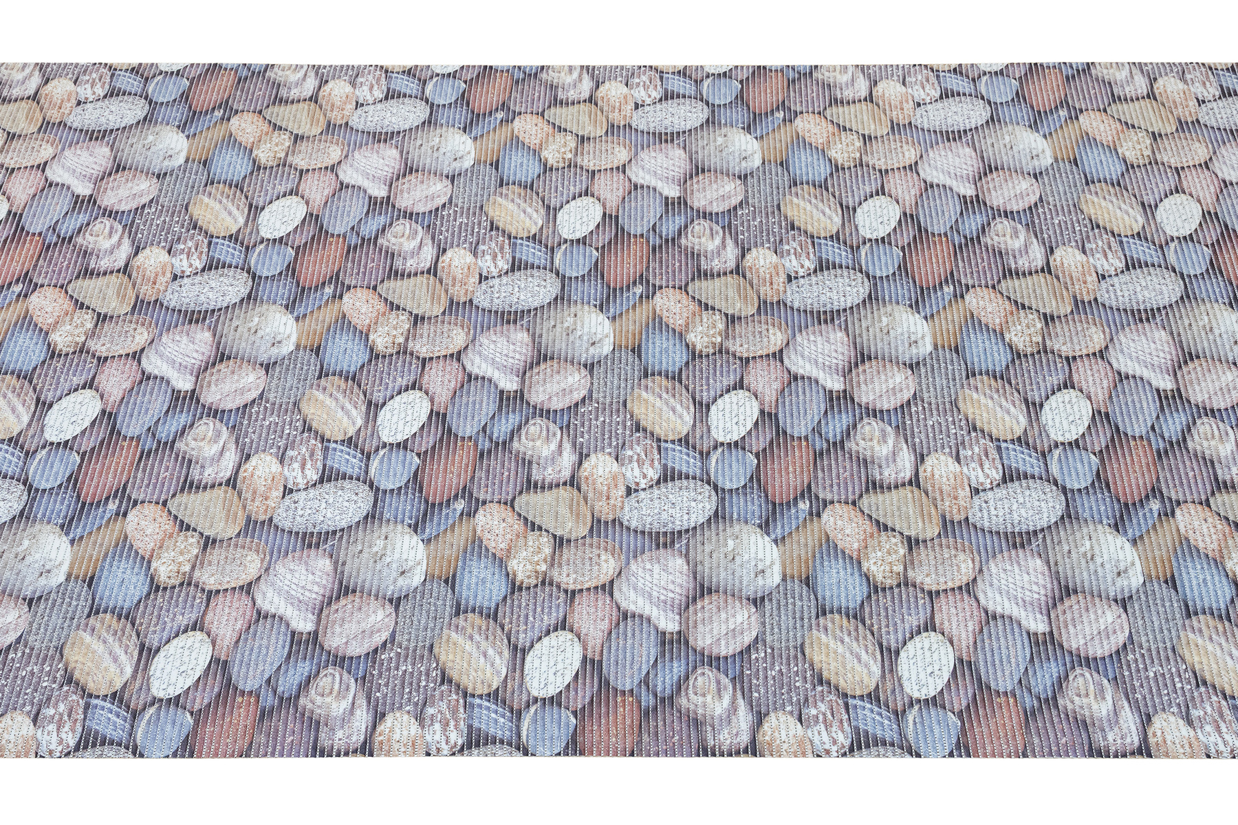 - Antypoślizgowa mata łazienkowa z wzorem kamyków w odcieniach brązu, beżu, szarości, niebieskiego i kremu.