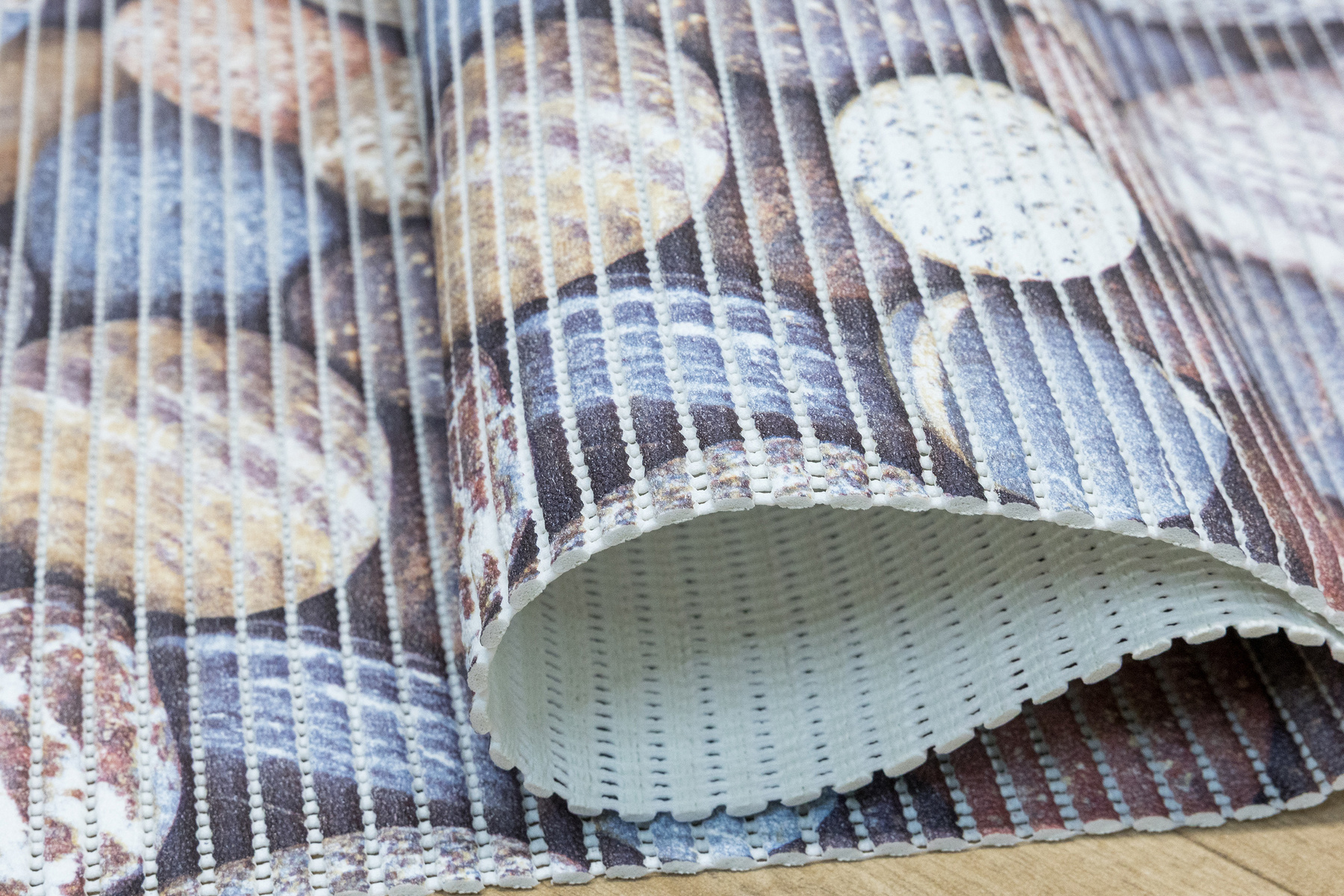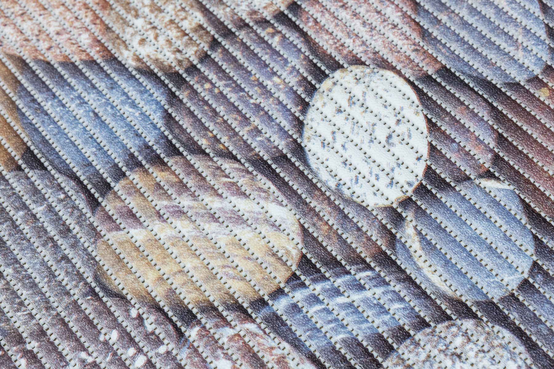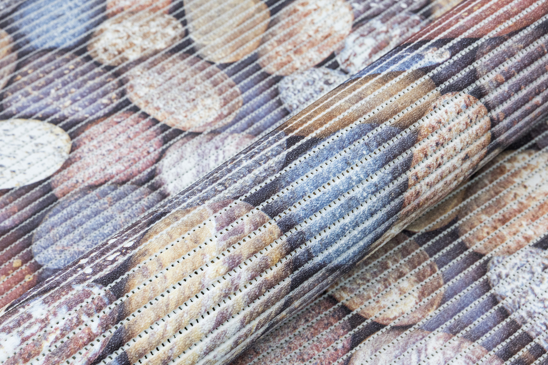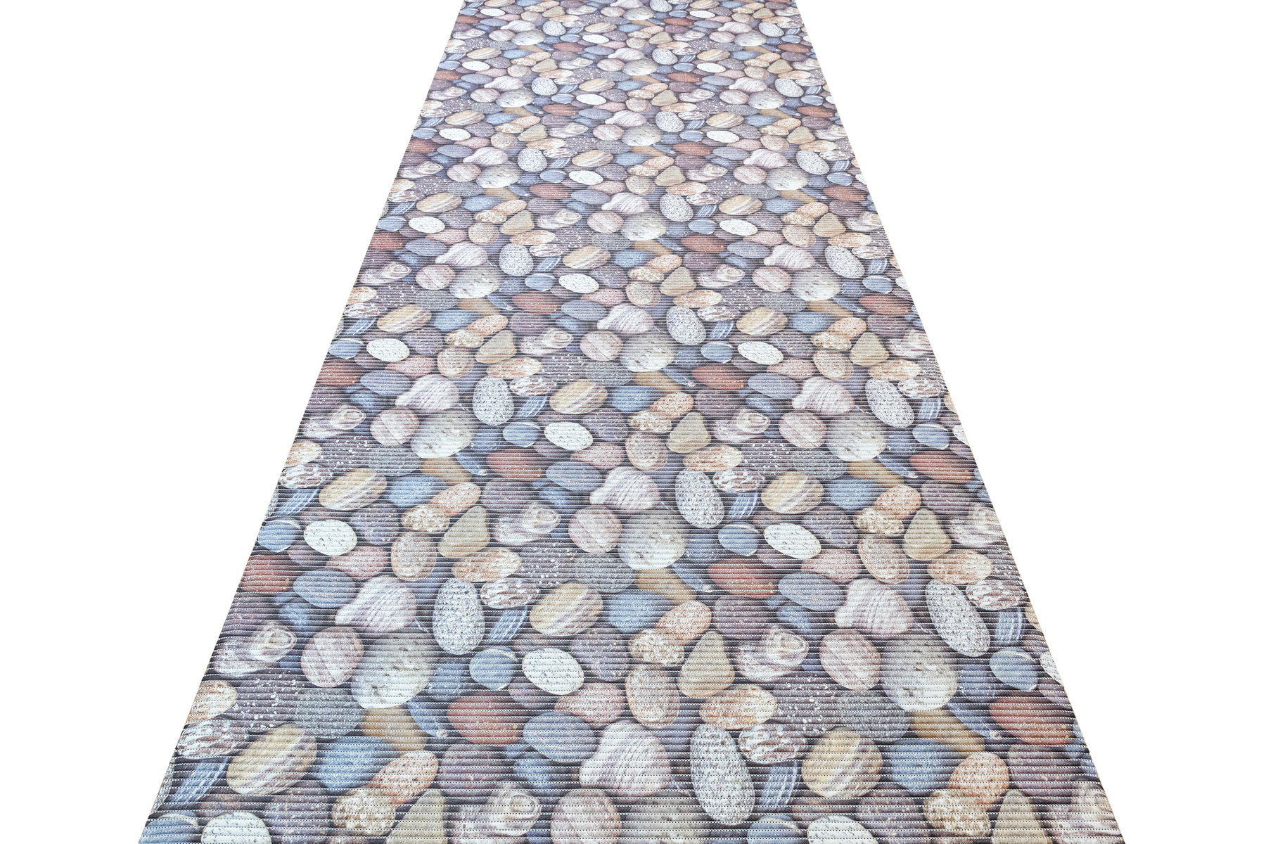 - Antypoślizgowa mata łazienkowa z wzorem kamyków w odcieniach brązu, beżu, szarości, niebieskiego i kremu.