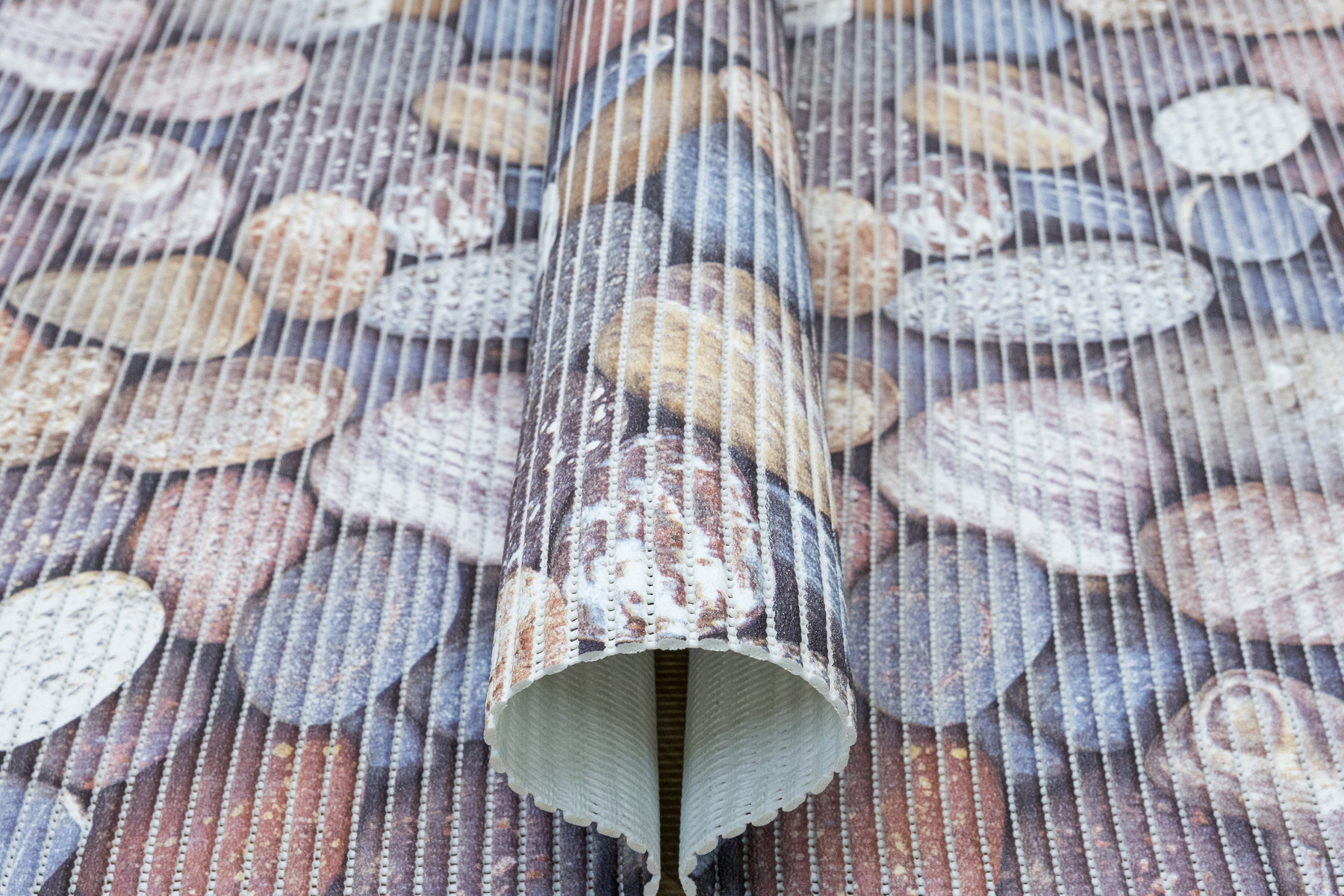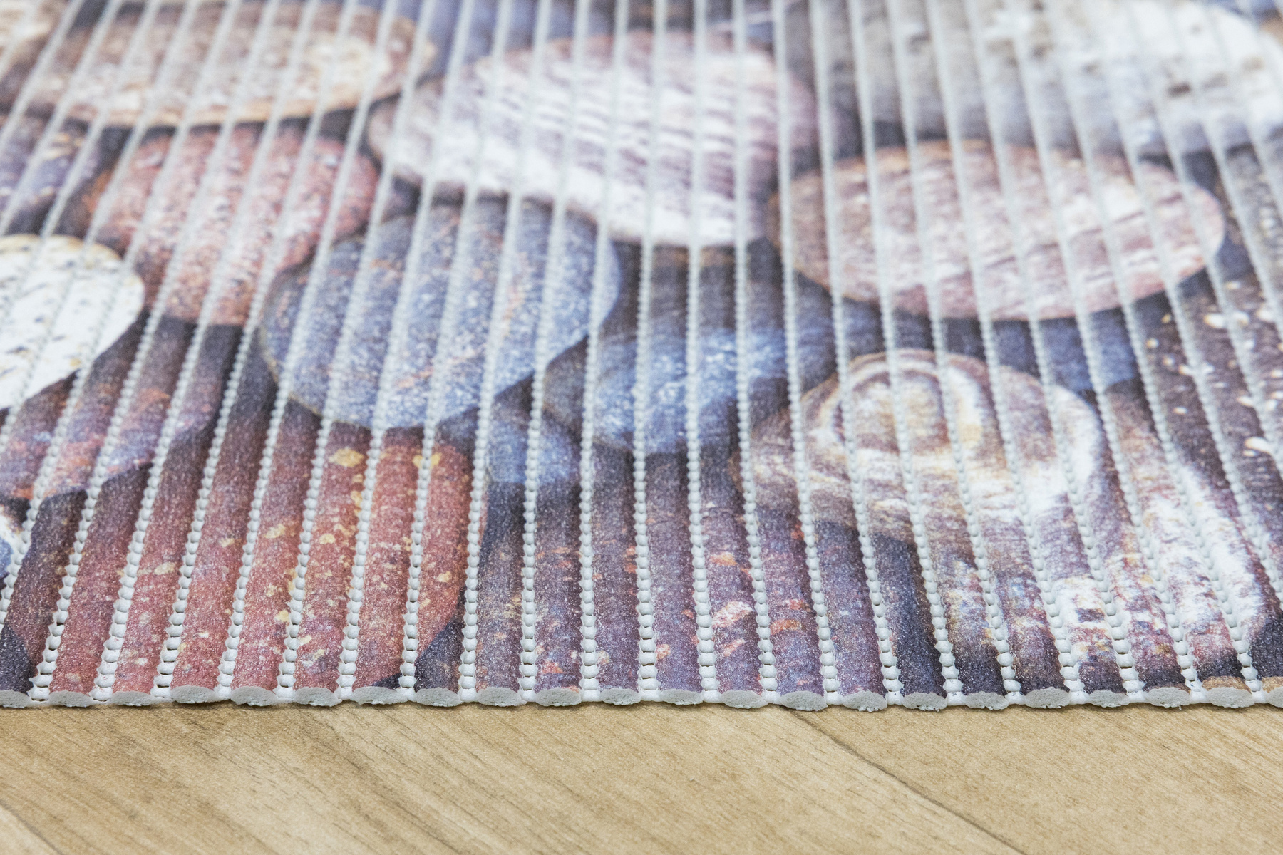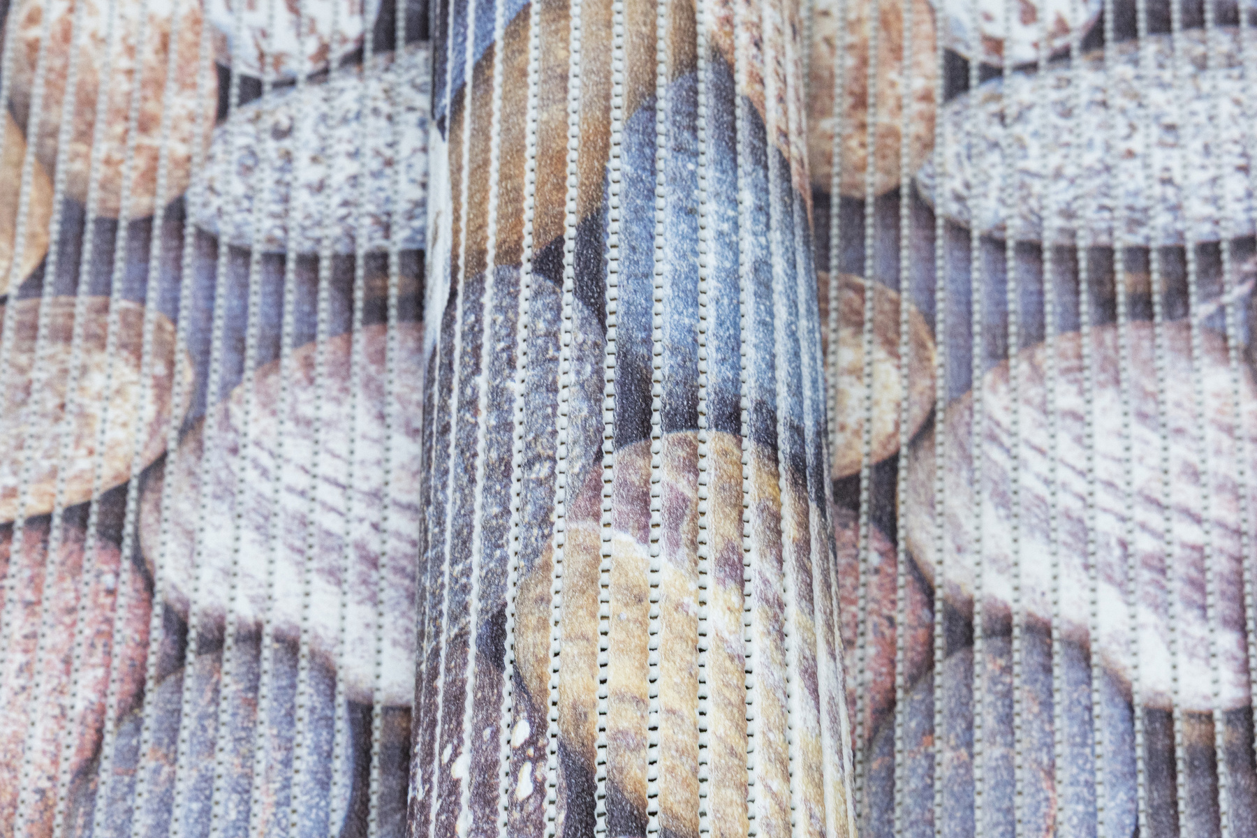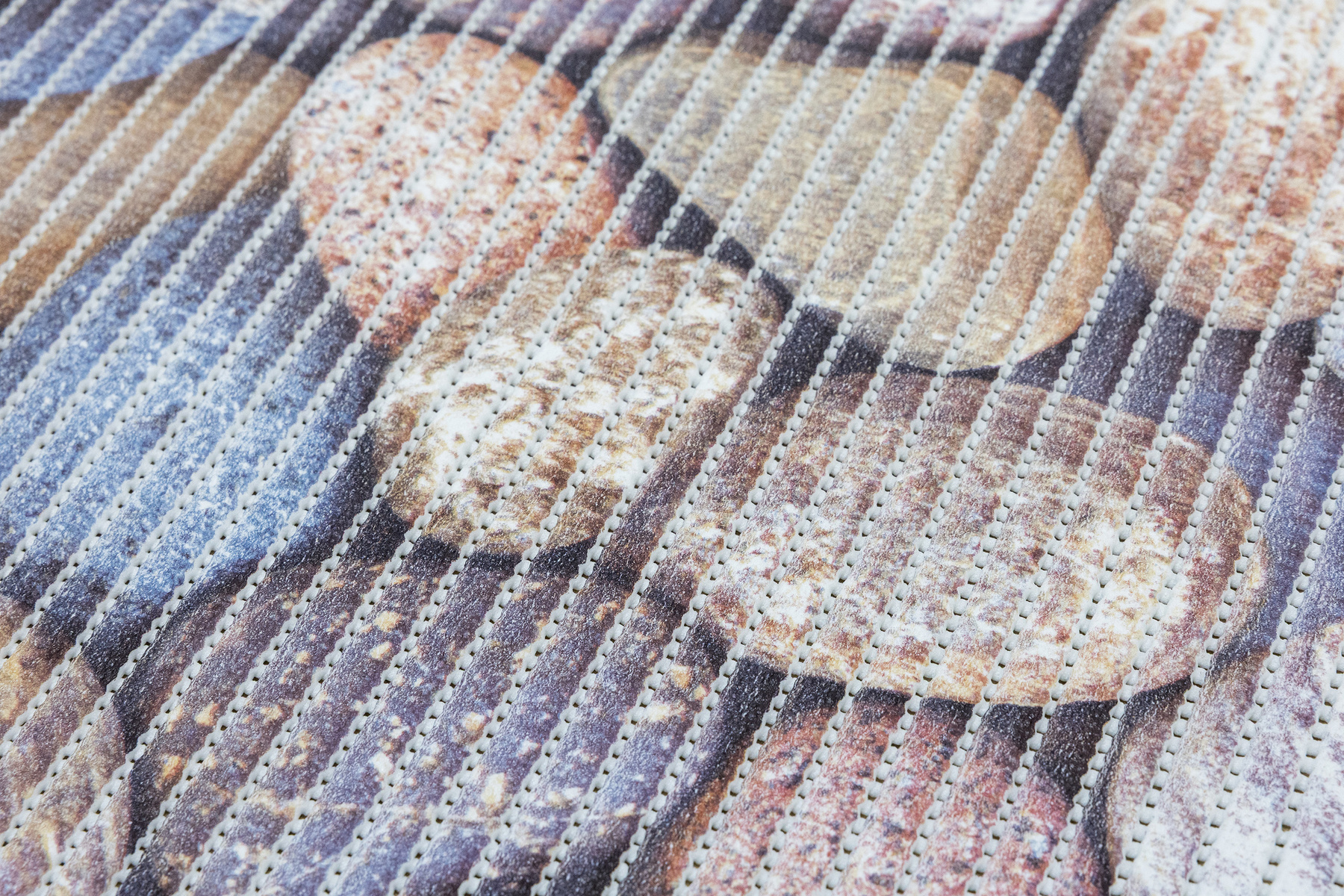 - Antypoślizgowa mata łazienkowa z wzorem kamyków w odcieniach brązu, beżu, szarości, niebieskiego i kremu.
