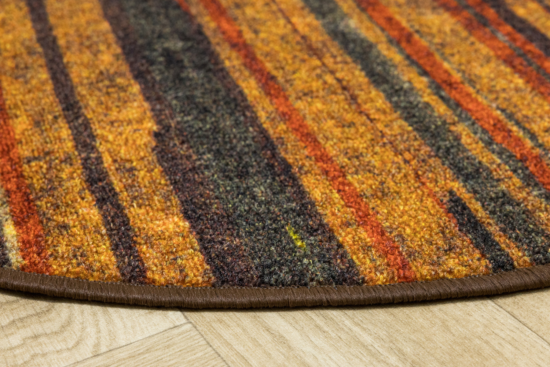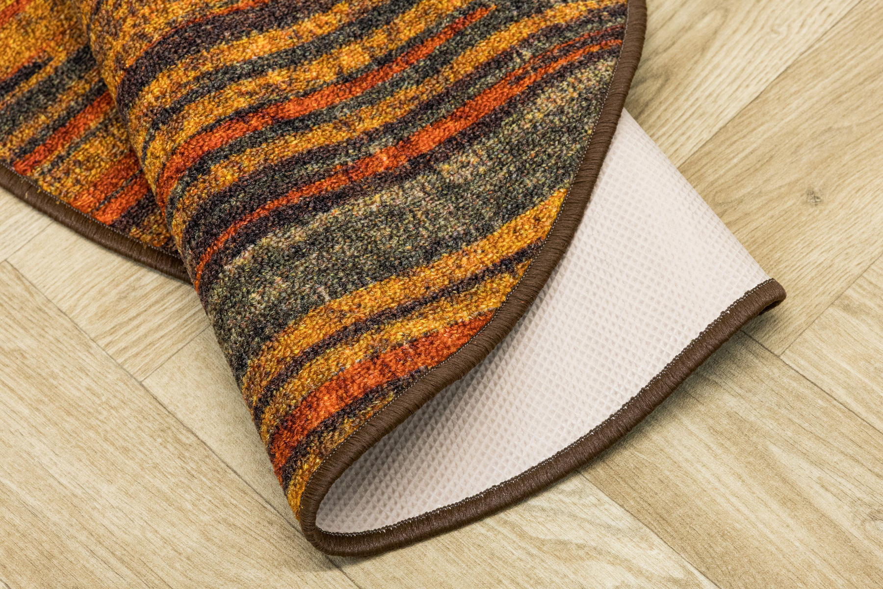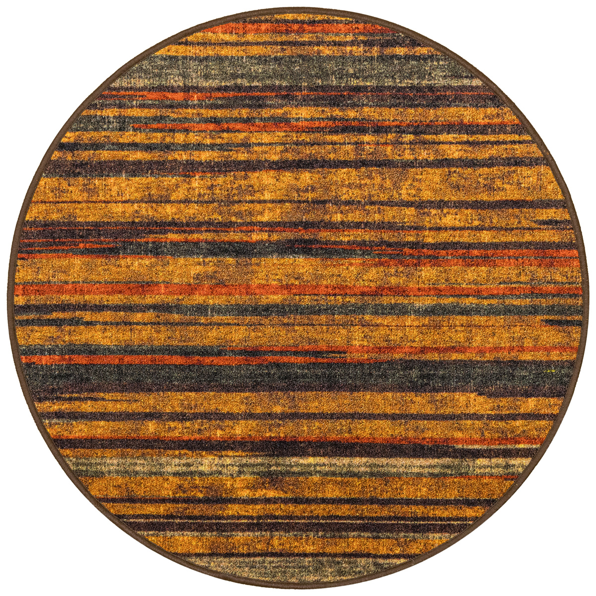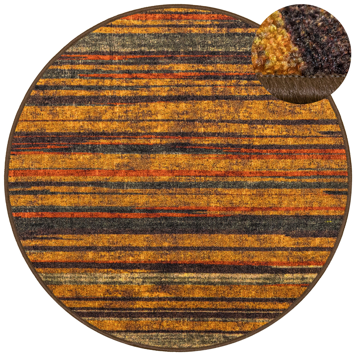 - Okrągły dywanik z chodnika Fusion z niskim pętelkowym poliamidowym runem o wzorze w pasy w odcieniach szarościach, pomarańczowego z akcentami kremu i żółtego oraz podgumowanym spodem.