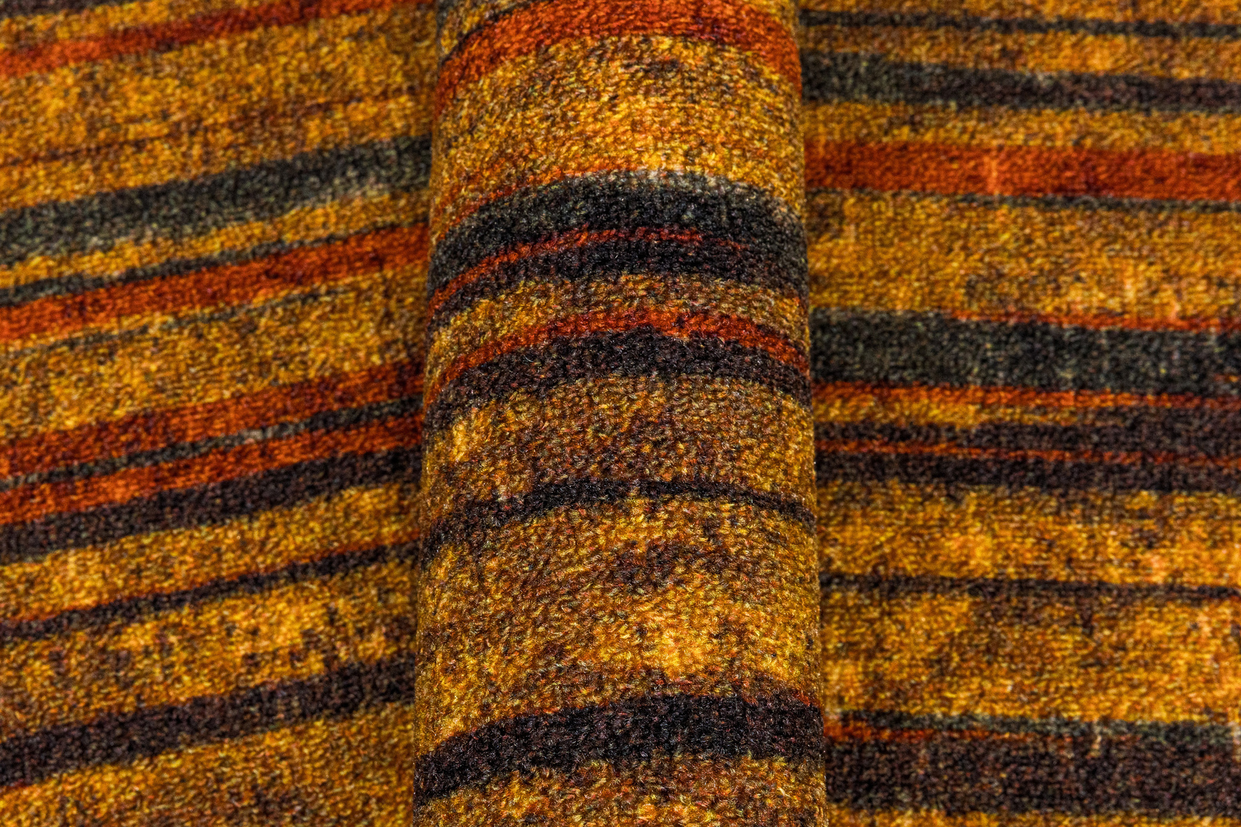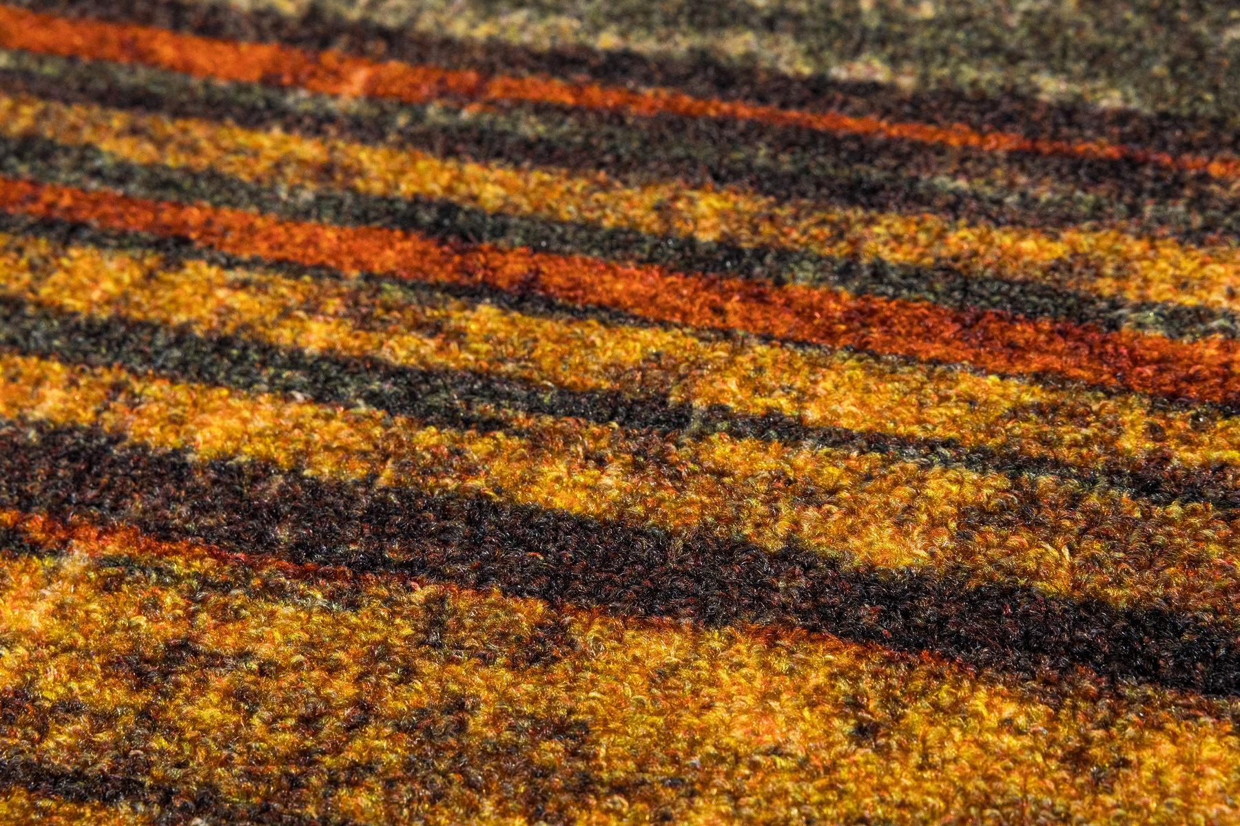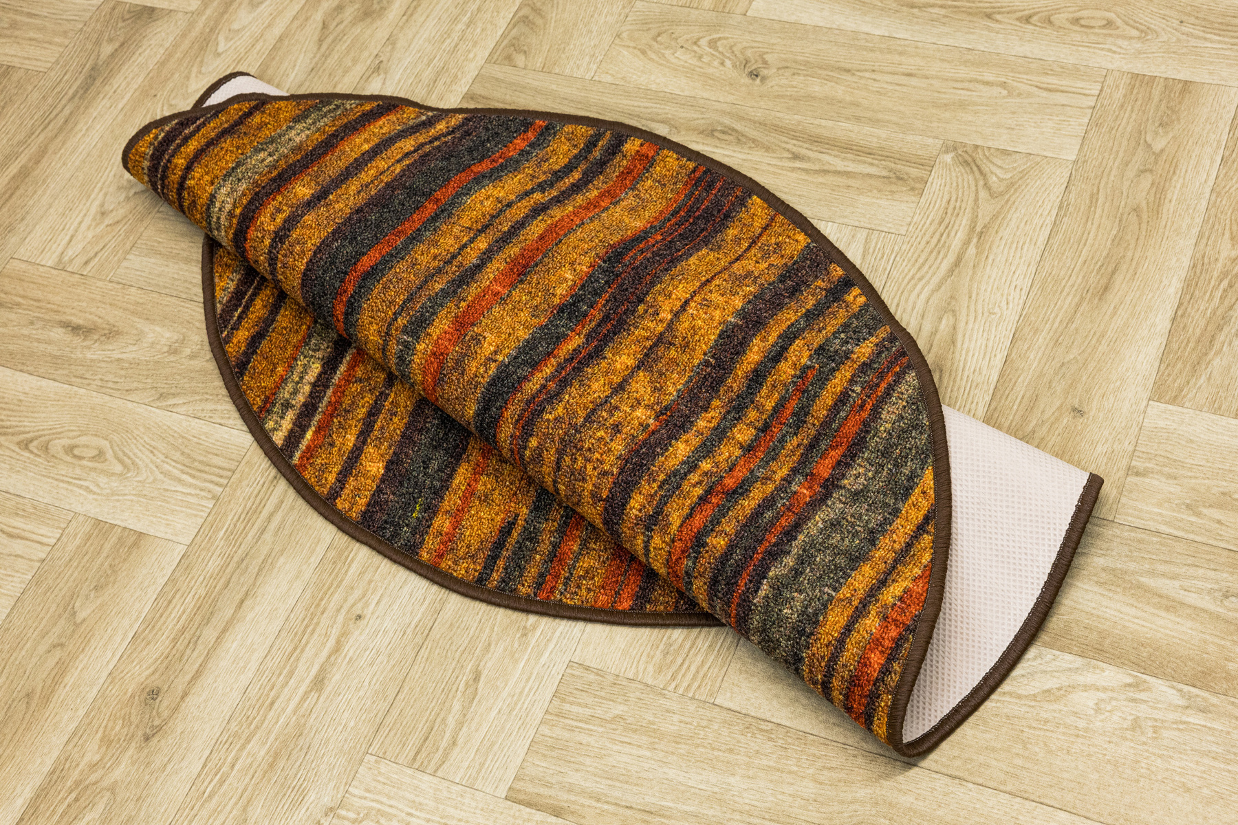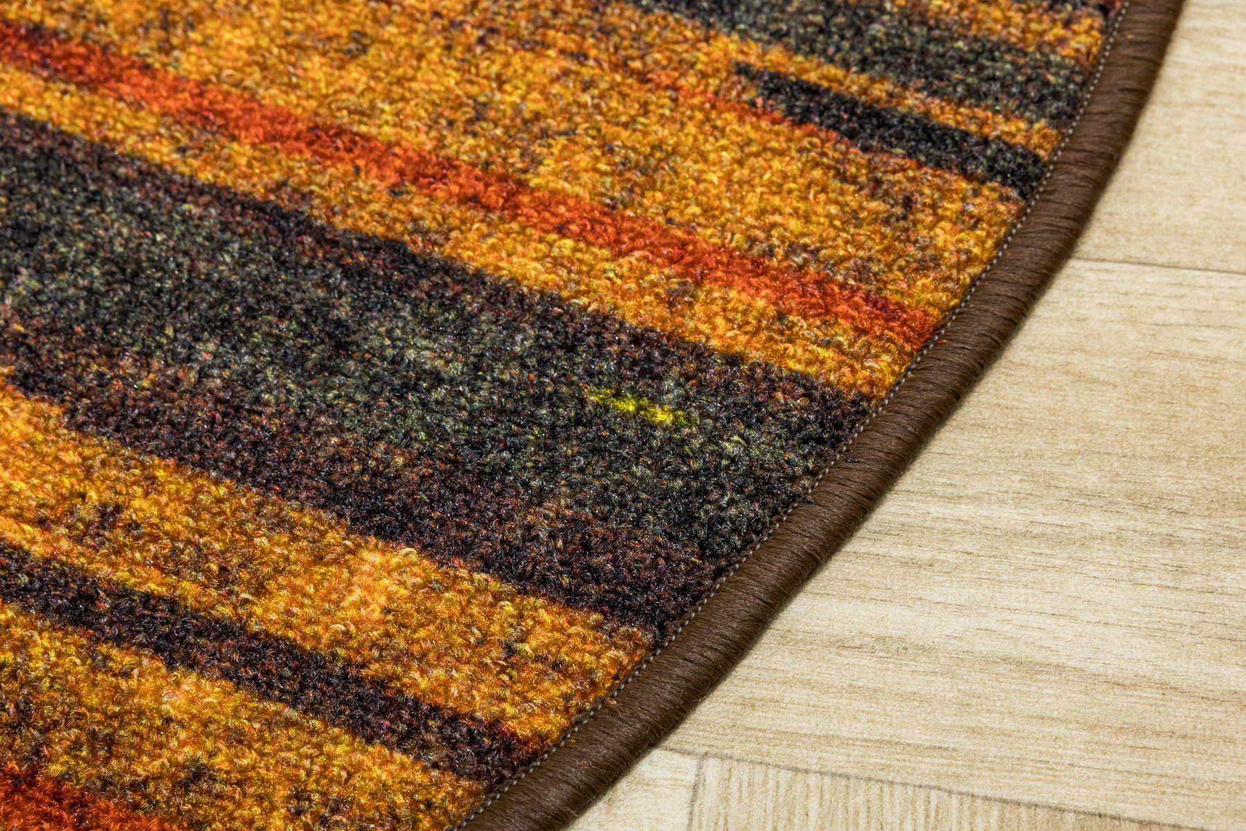 - Okrągły dywanik z chodnika Fusion z niskim pętelkowym poliamidowym runem o wzorze w pasy w odcieniach szarościach, pomarańczowego z akcentami kremu i żółtego oraz podgumowanym spodem.