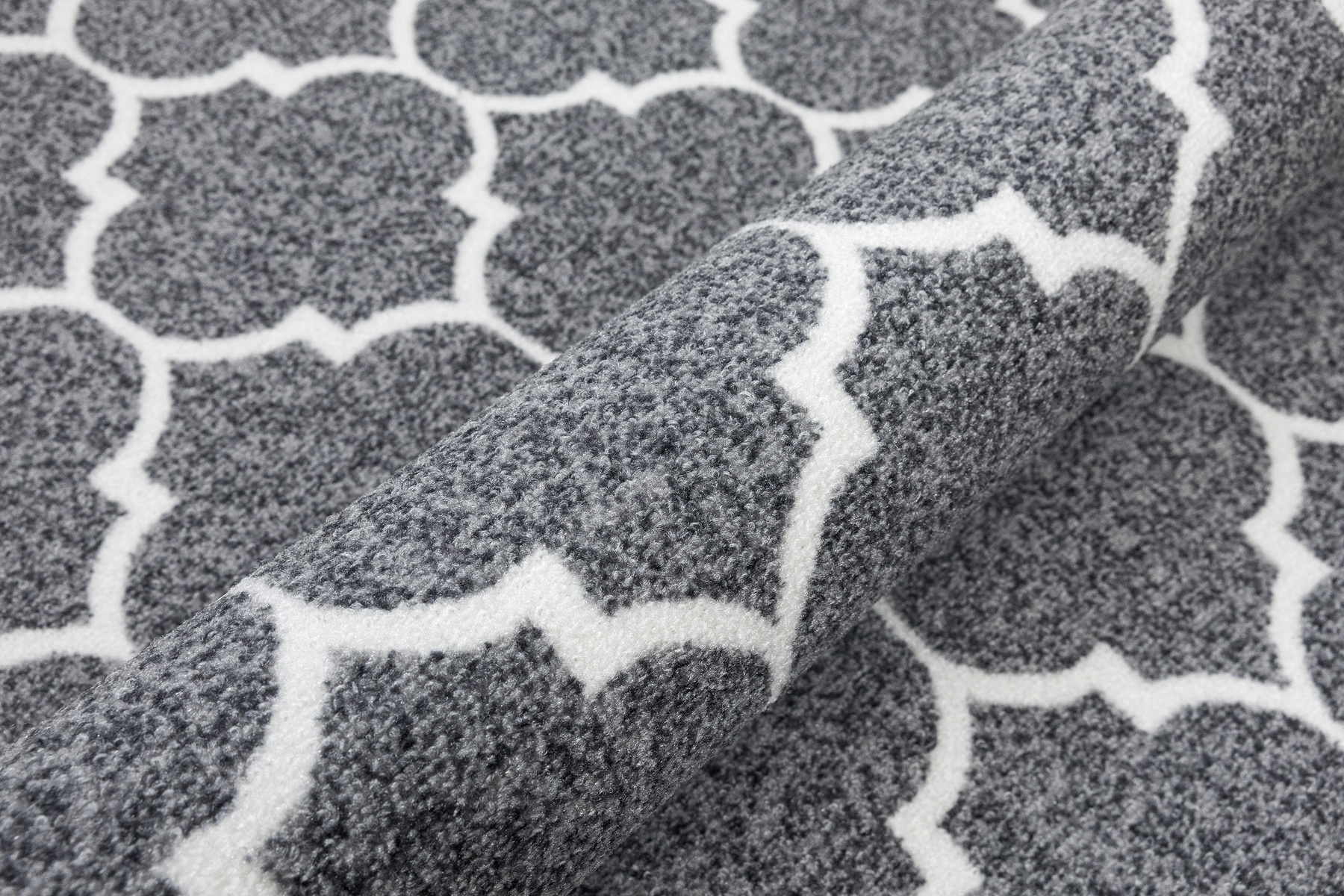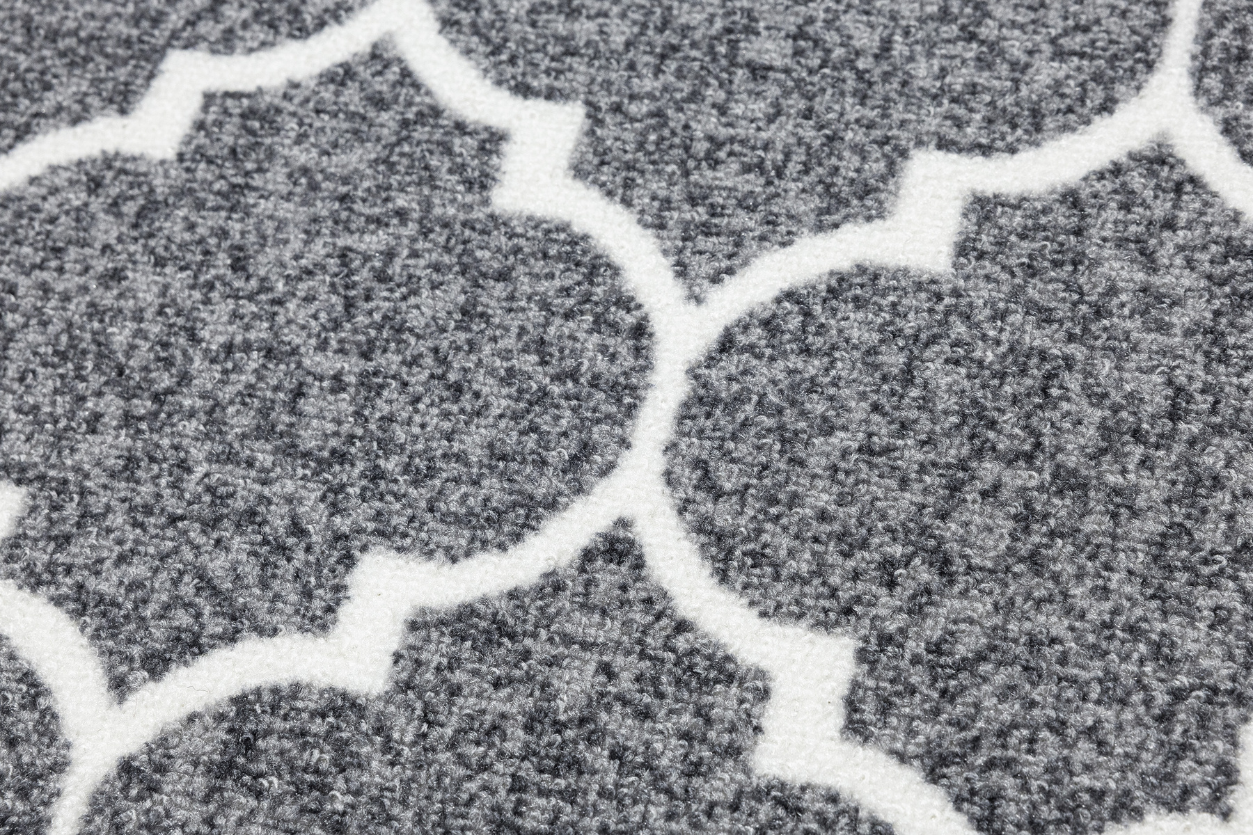 - Antypoślizgowy dywan Clover z pętelkowym runem i ponadczasowym motywem koniczyny marokańskiej w odcieniu jasnej szarości i bieli.