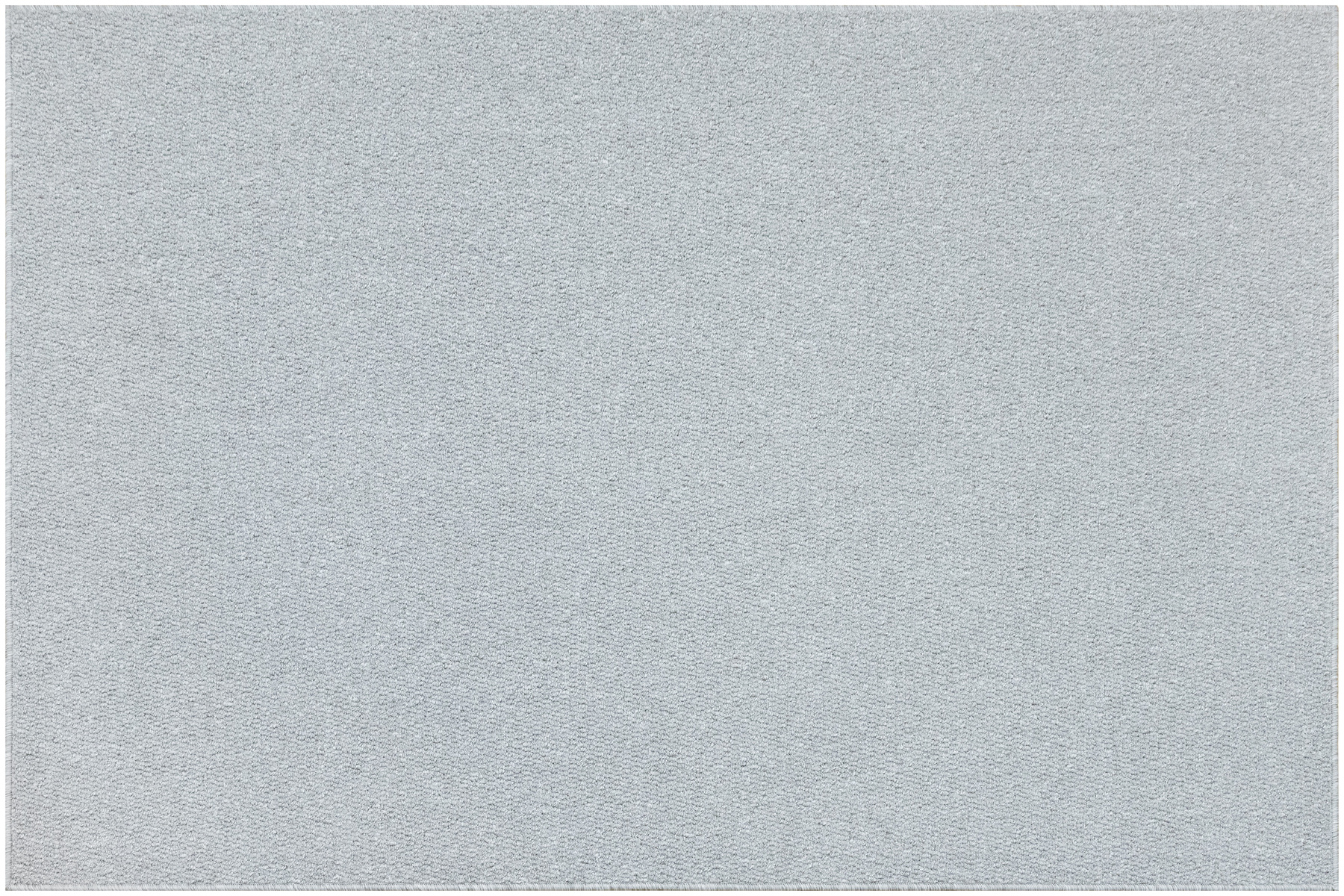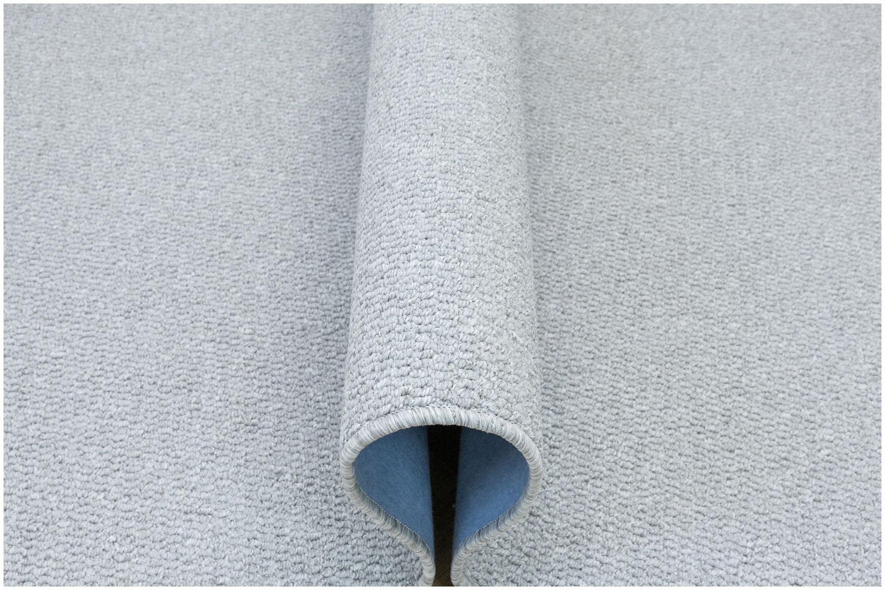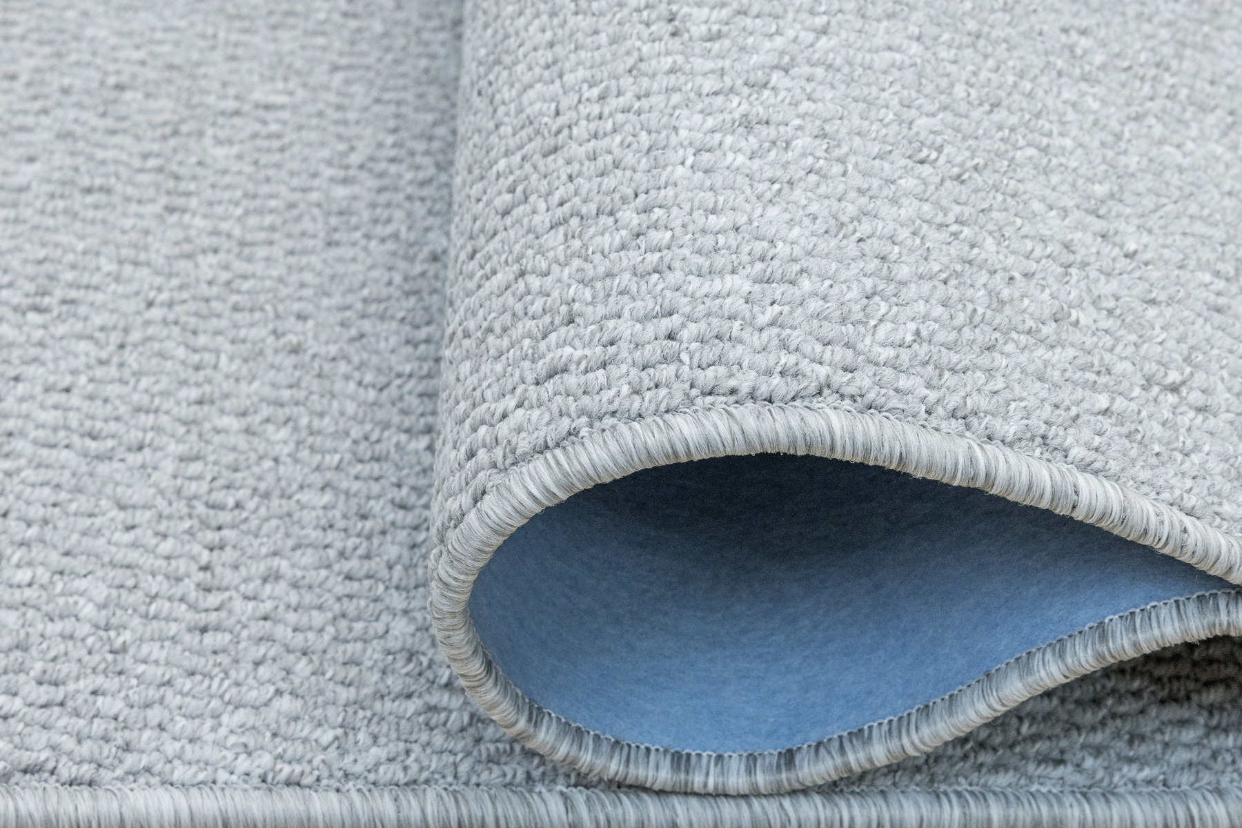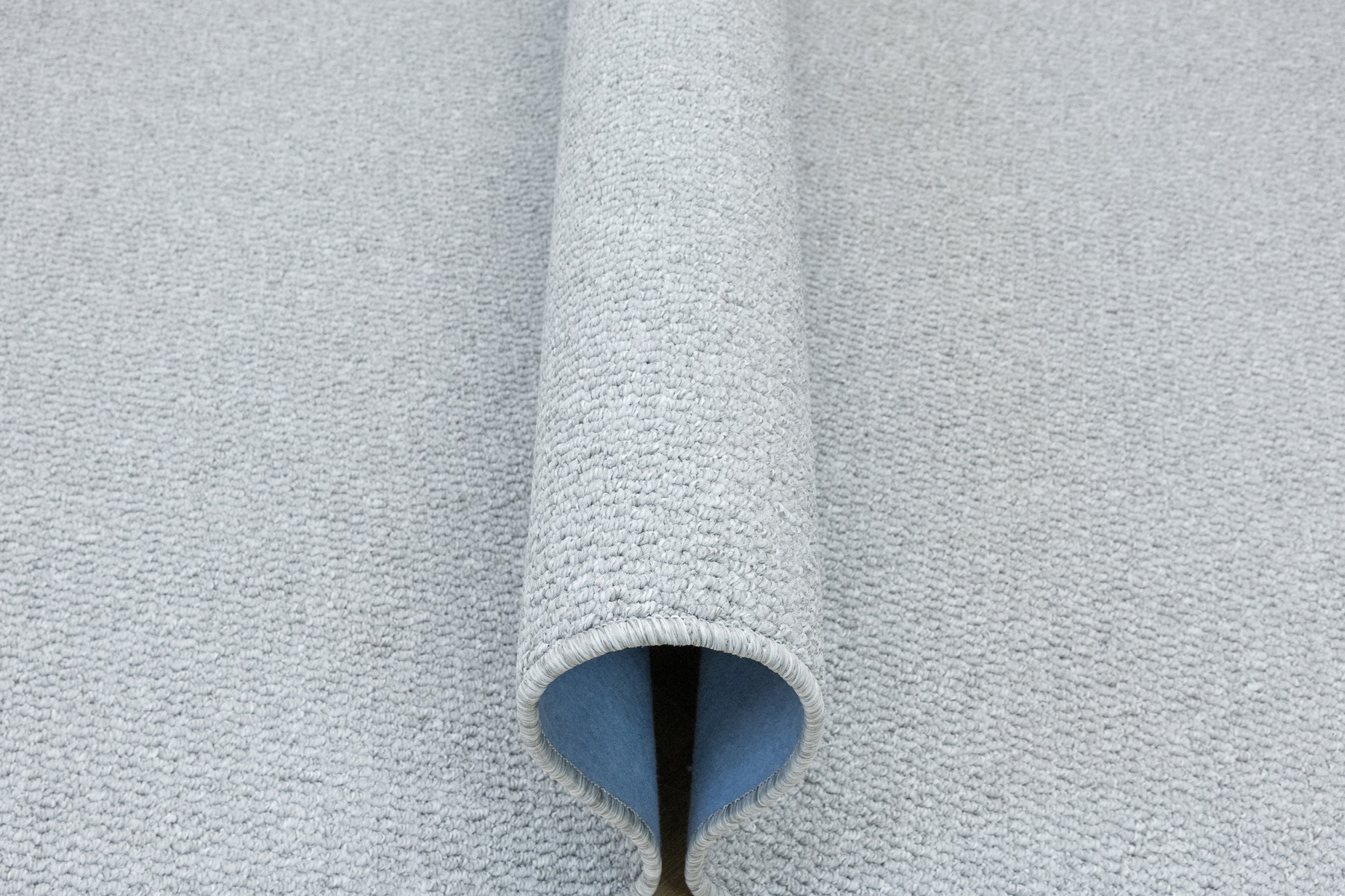 - Wykładzina pętelkowa Brasil z unikalnym, oryginalnym grubym splotem w odcieniu jasnej szarości i spodem wykończonym niebieskim filcem.