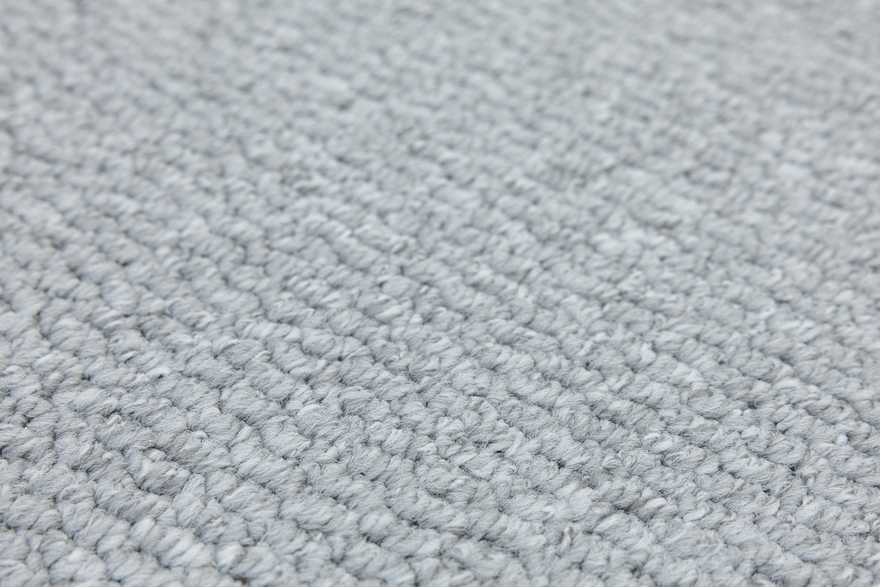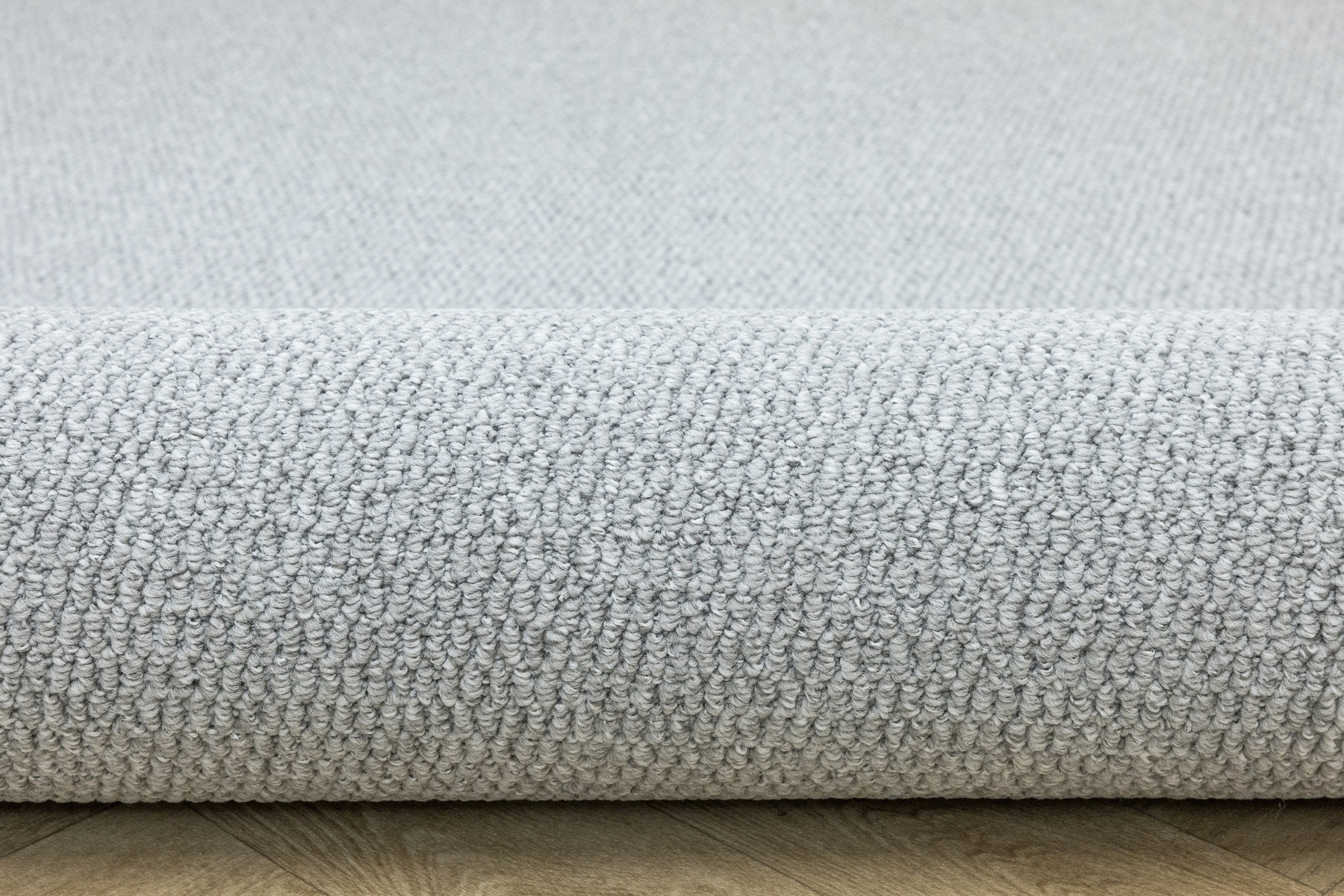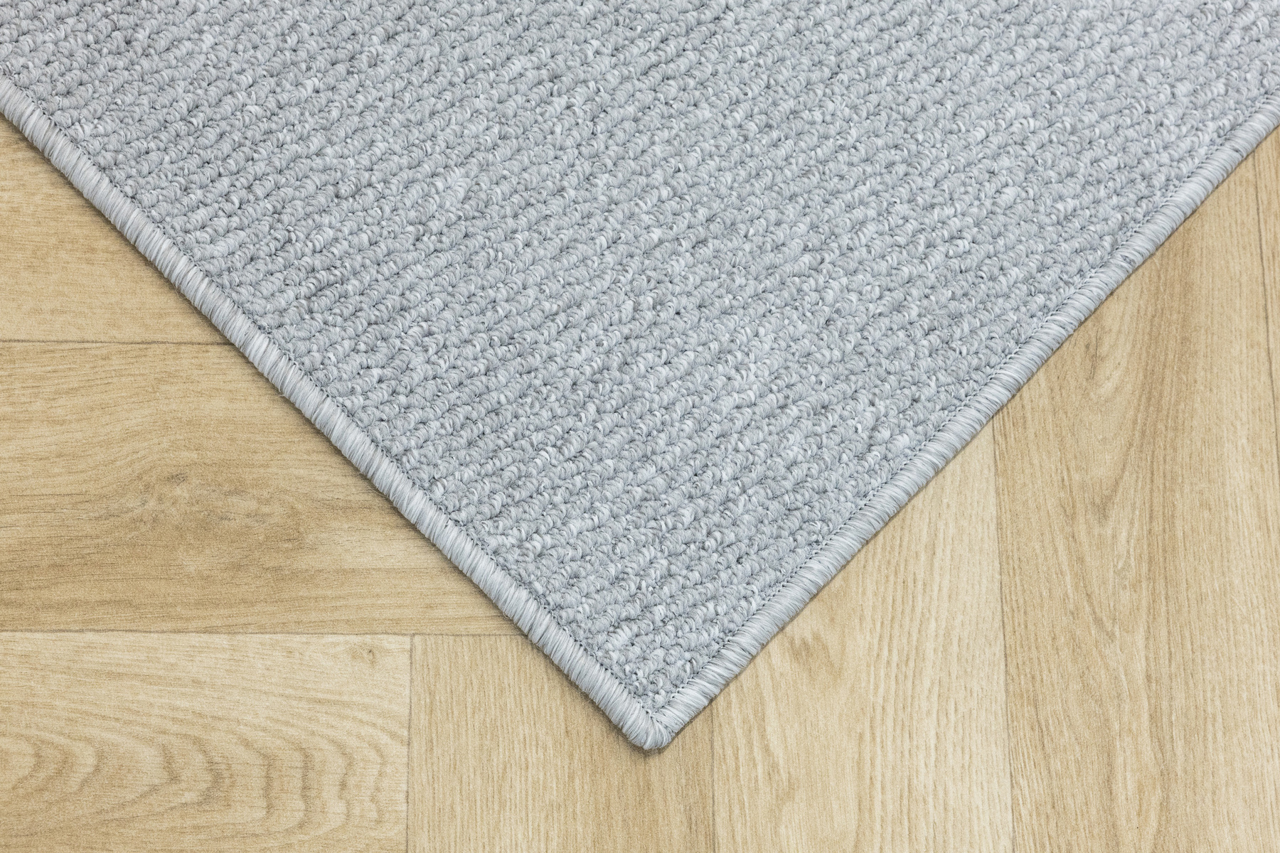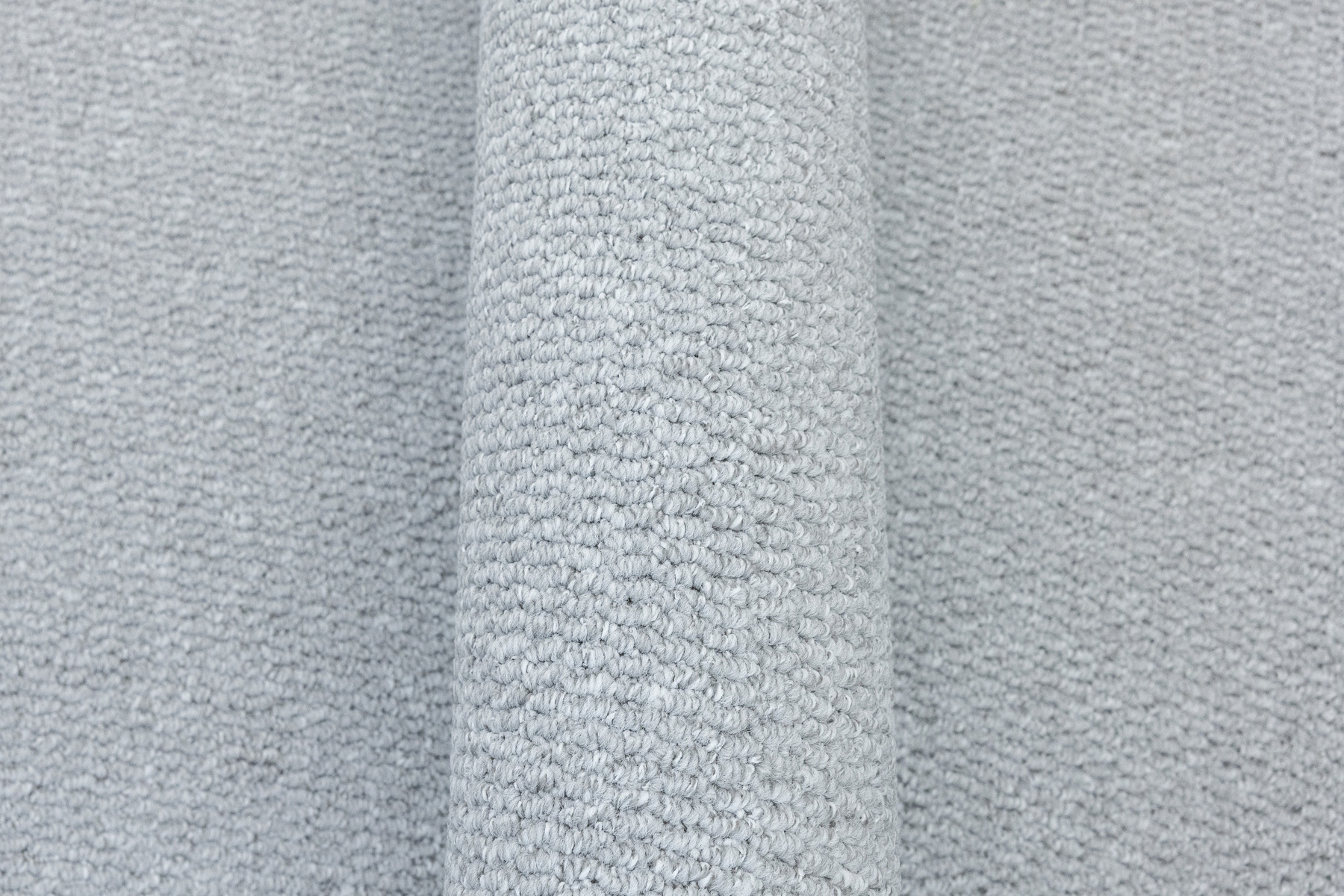 - Wykładzina pętelkowa Brasil z unikalnym, oryginalnym grubym splotem w odcieniu jasnej szarości i spodem wykończonym niebieskim filcem.