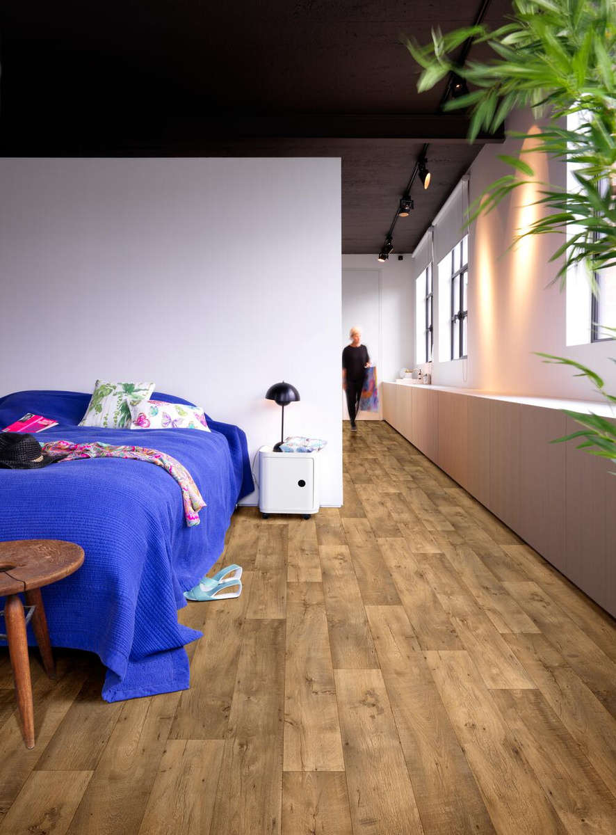 • Elastyczna wykładzina PCV Tex-Style Valley Oak o podwyższonej wytrzymałości ze wzorem imitującym podłogę z desek i spodem wykończonym filcem.