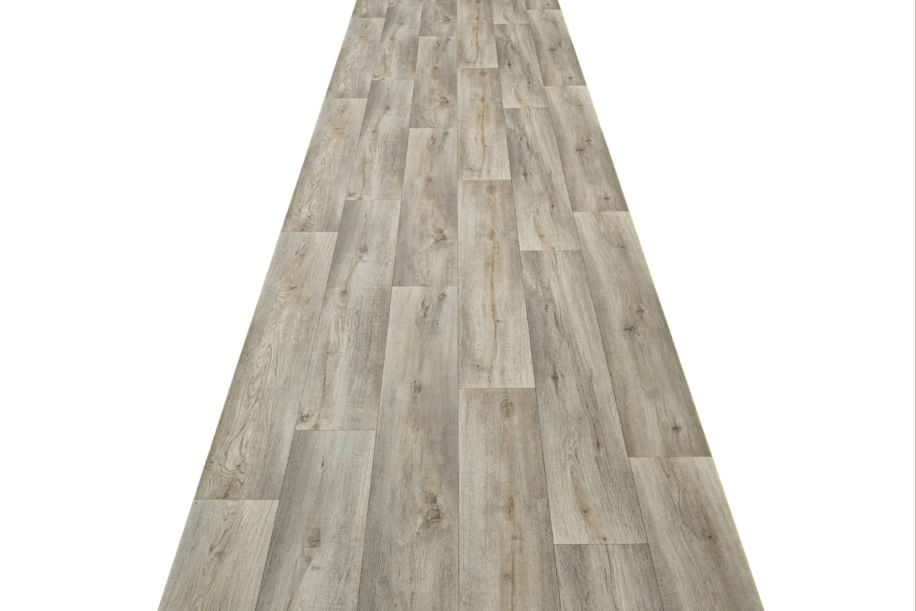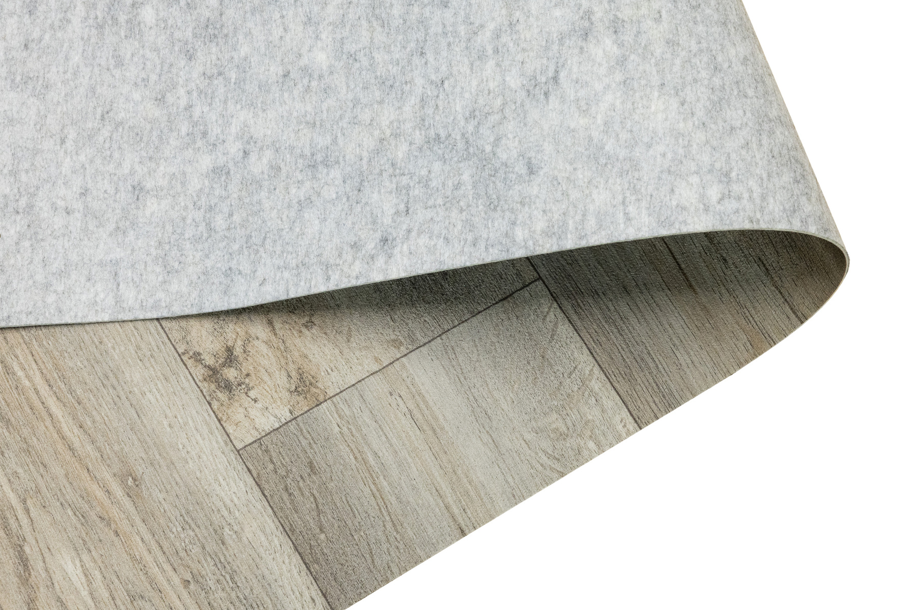 - Elastyczna wykładzina Silvertex Silk Oak o podwyższonej wytrzymałości ze wzorem imitującym podłogę z desek i spodem wykończonym filcem.