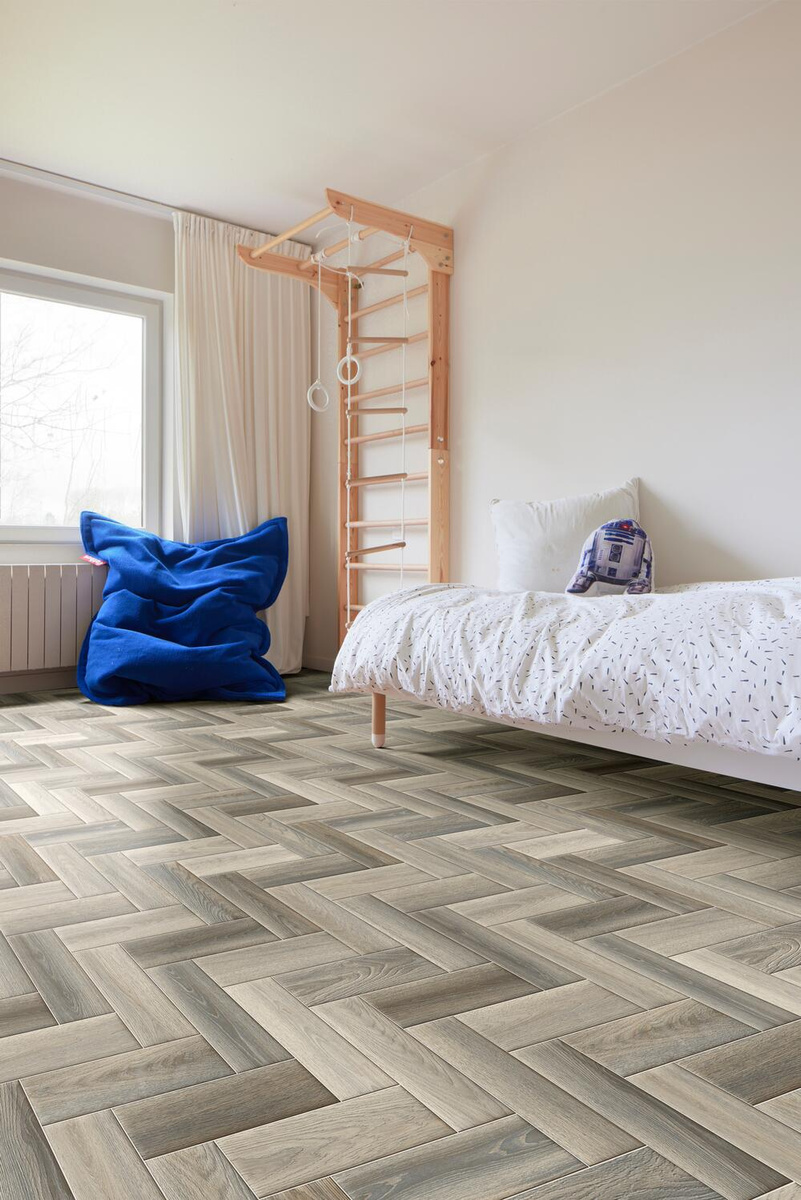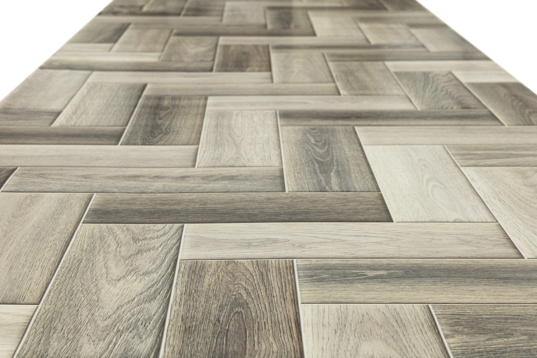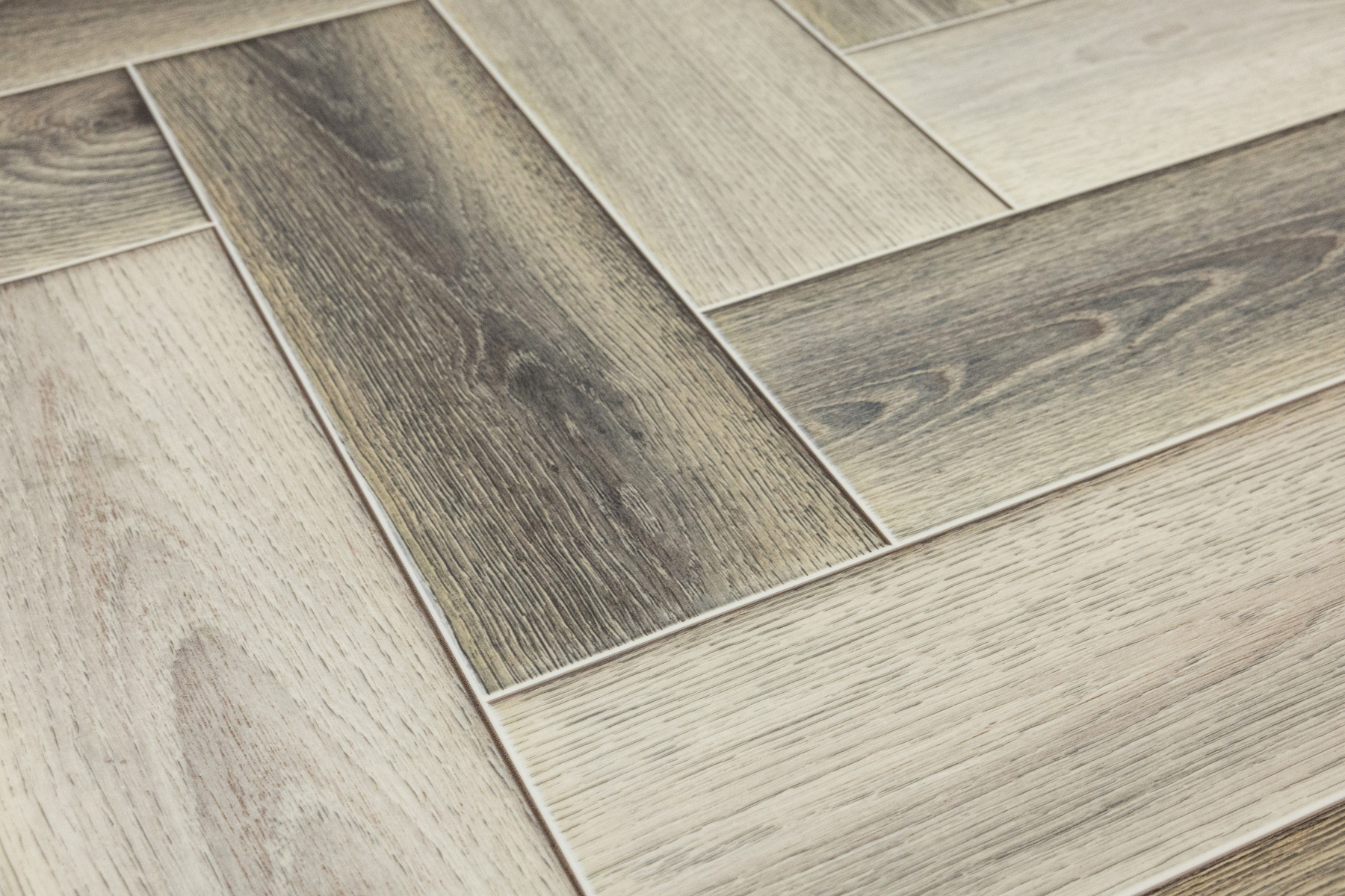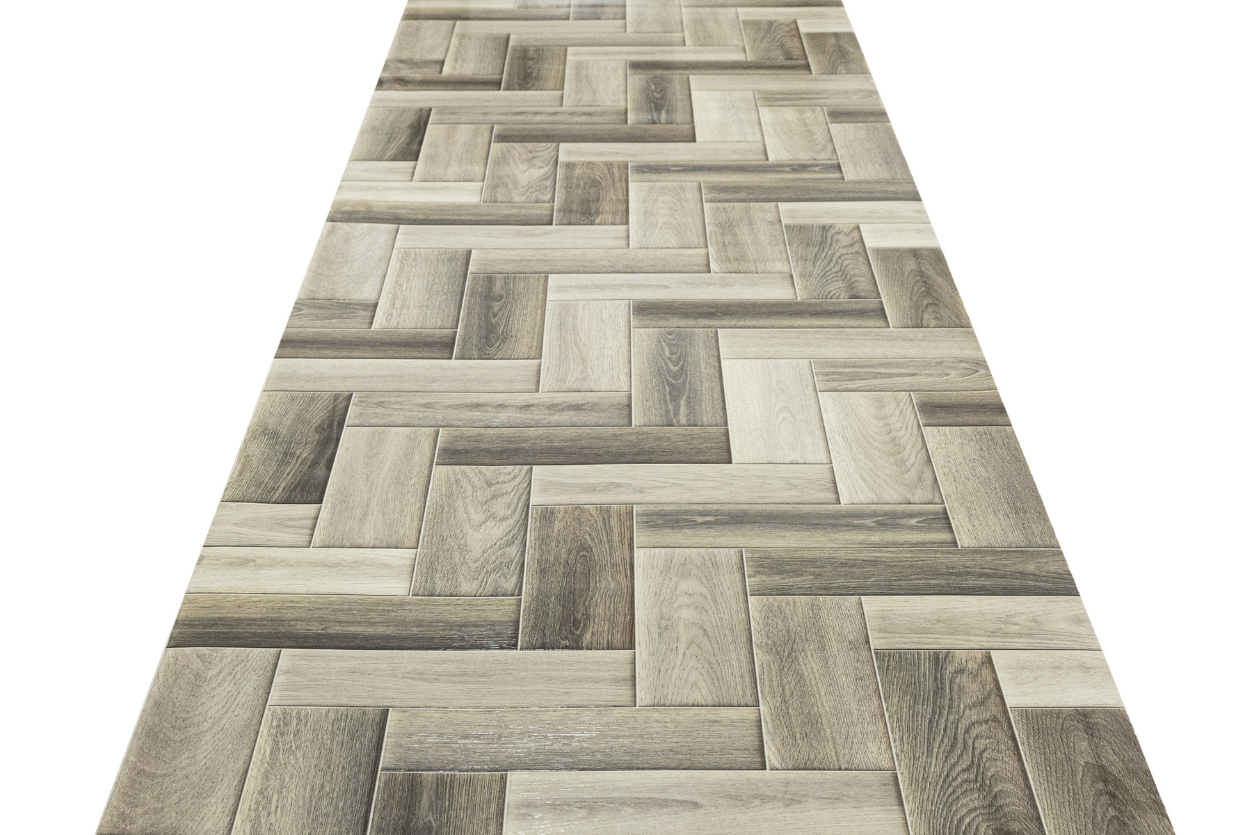 - Trwała wykładzina PCV Bartesa Diana Wood ze wzorem imitującym parkiet z desek ułożonych na jodełkę, zygzak w odcieniach brązu, kremu i beżu z akcentami szarości.