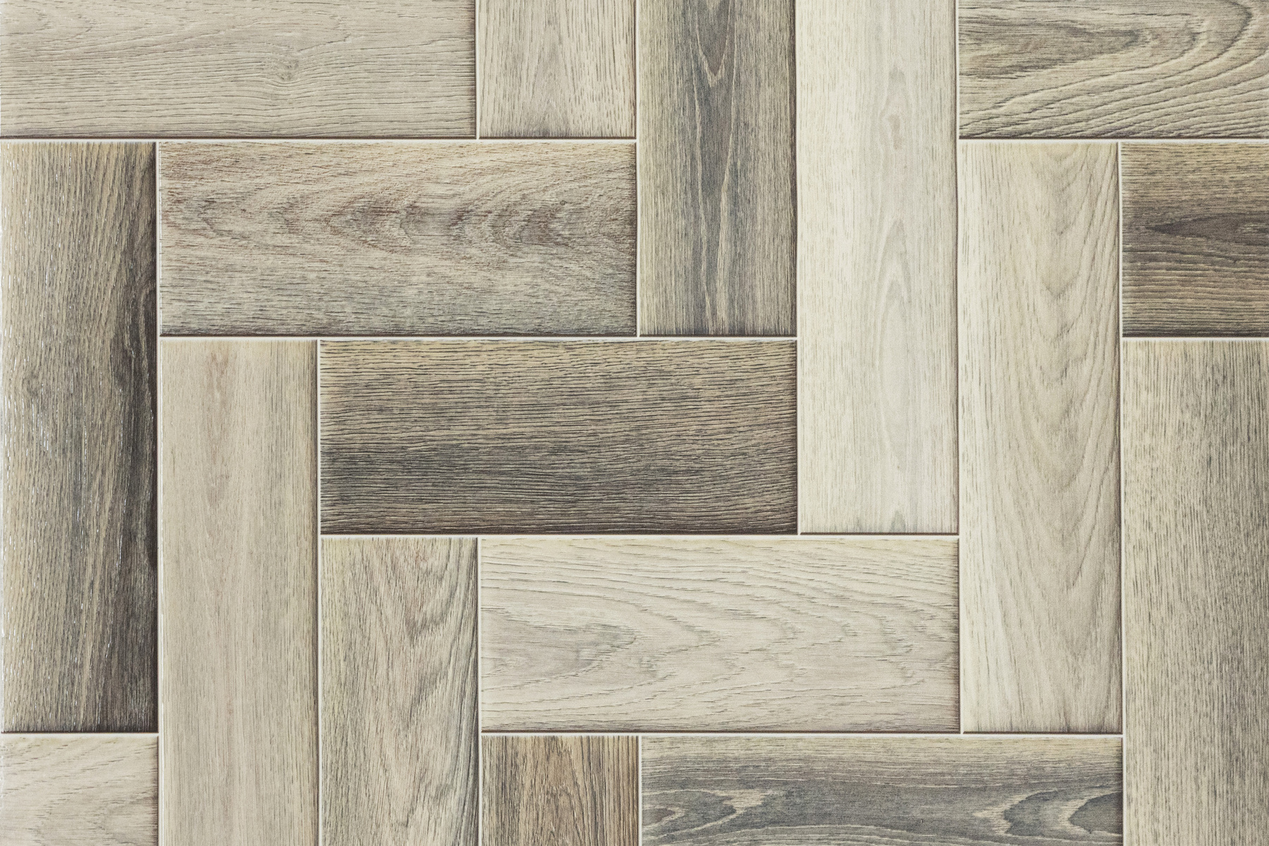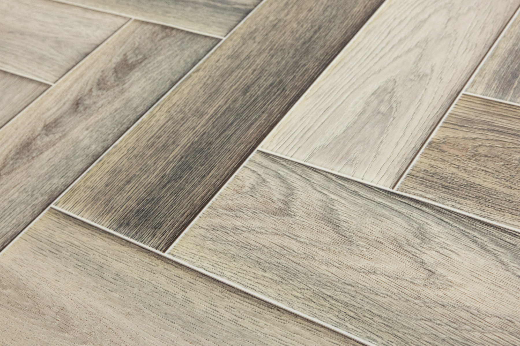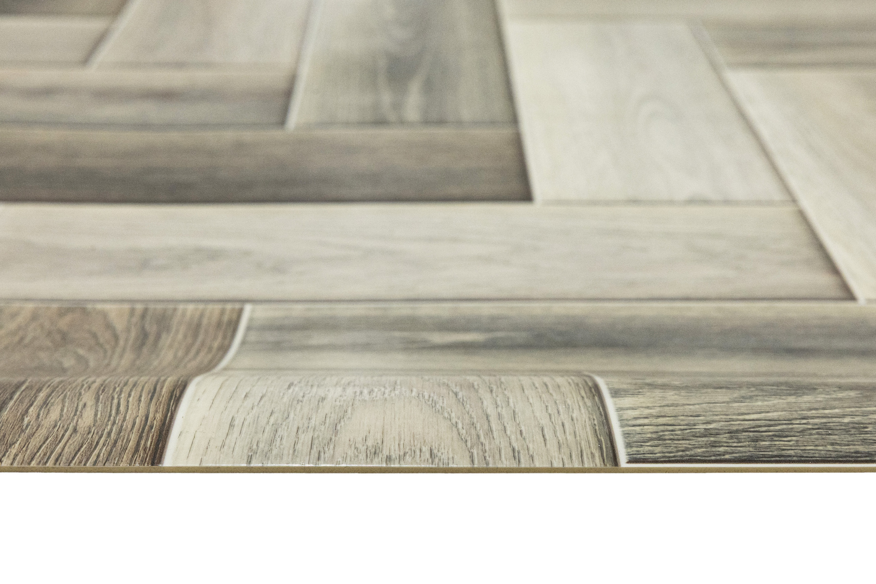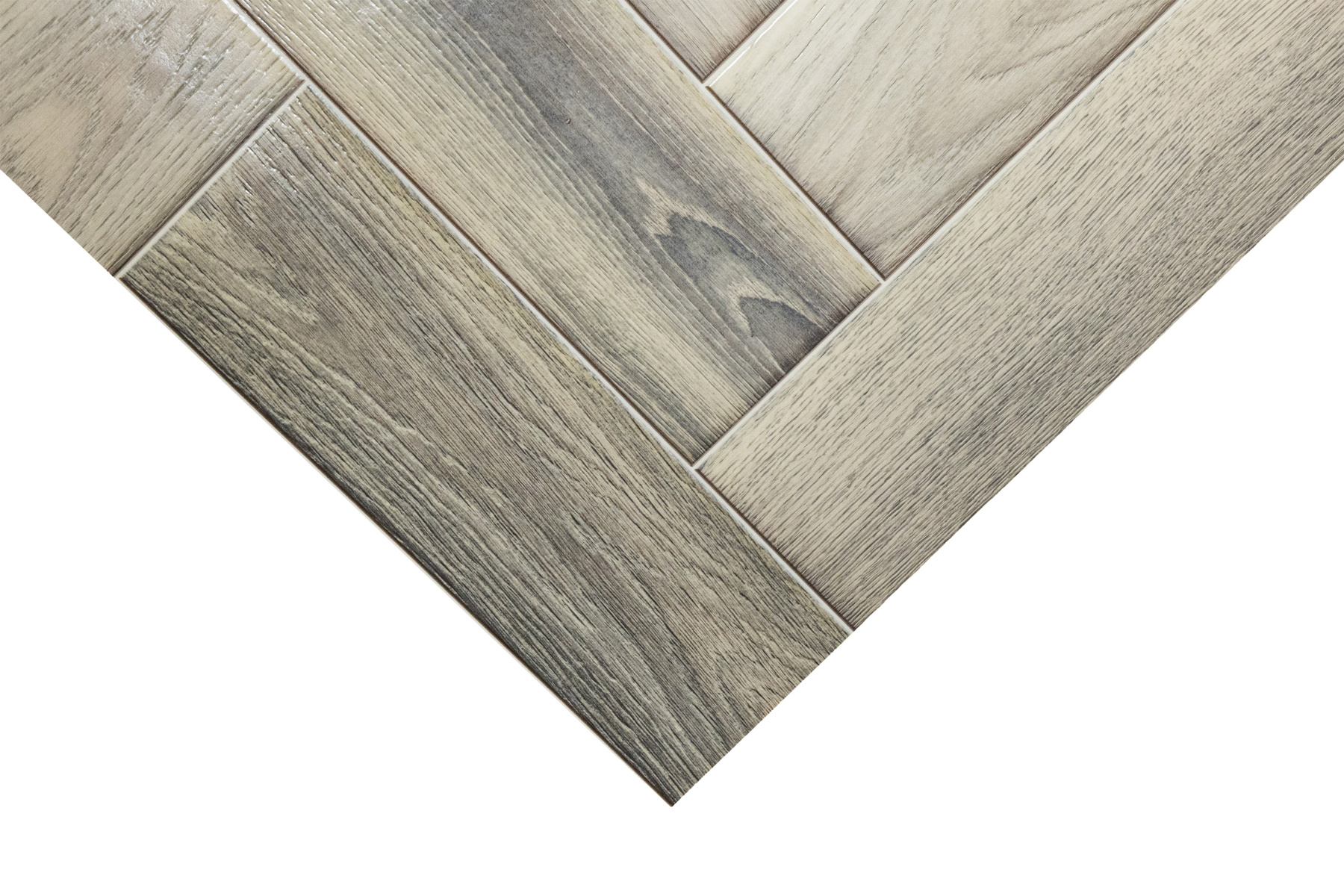 - Trwała wykładzina PCV Bartesa Diana Wood ze wzorem imitującym parkiet z desek ułożonych na jodełkę, zygzak w odcieniach brązu, kremu i beżu z akcentami szarości.
