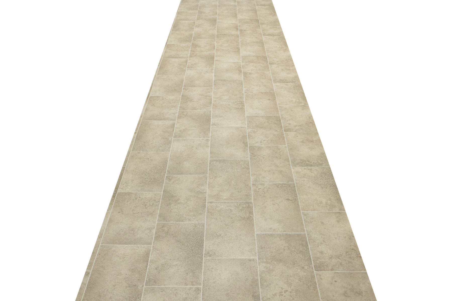 - Wykładzina PCV Bingo Galerie ze wzorem imitującym podłogę ułożoną z prostokątnych płytek w odcieniach beżu i szarości.