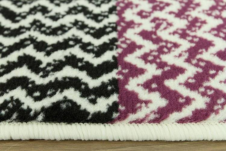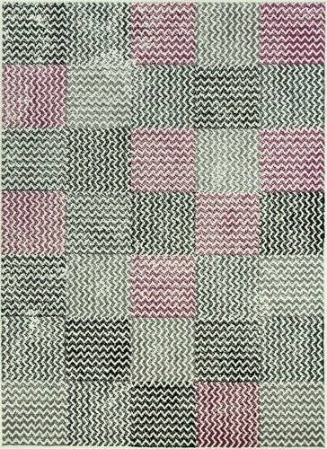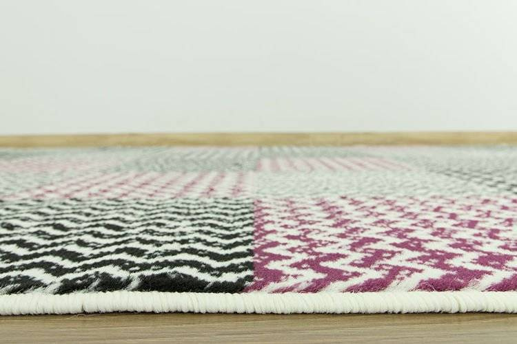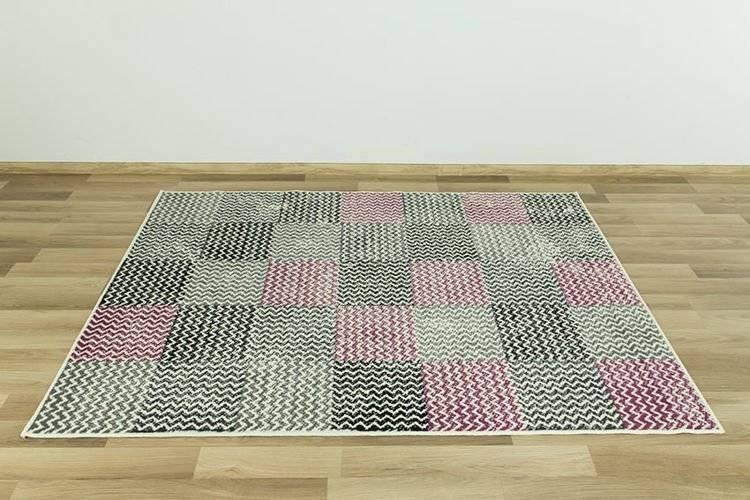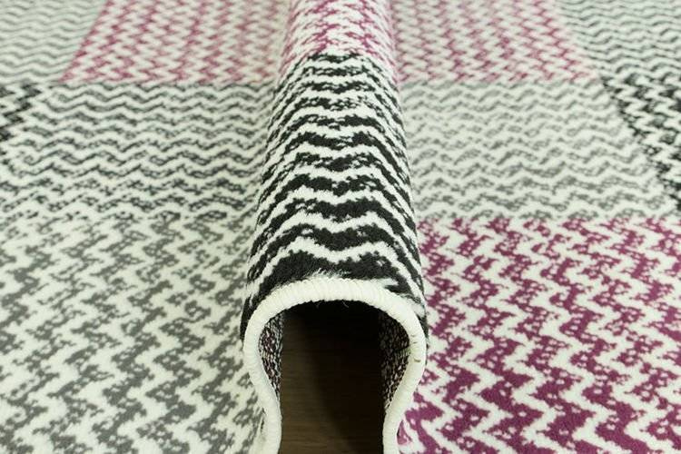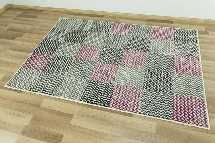 • Modny dywan z geometrycznym wzorem z motywem kwadratów w kratkę w odcieniach kremu, szarości, fioletu wpadającego w ciemny róż i w czerni.