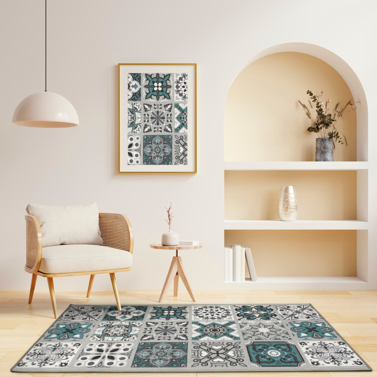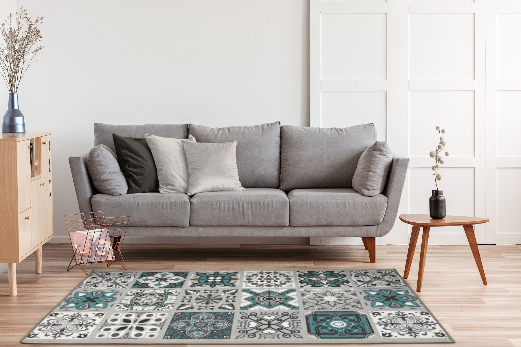 Opinie o Antypoślizgowy chodnik podgumowany patchwork turkus szerokość 100 cm